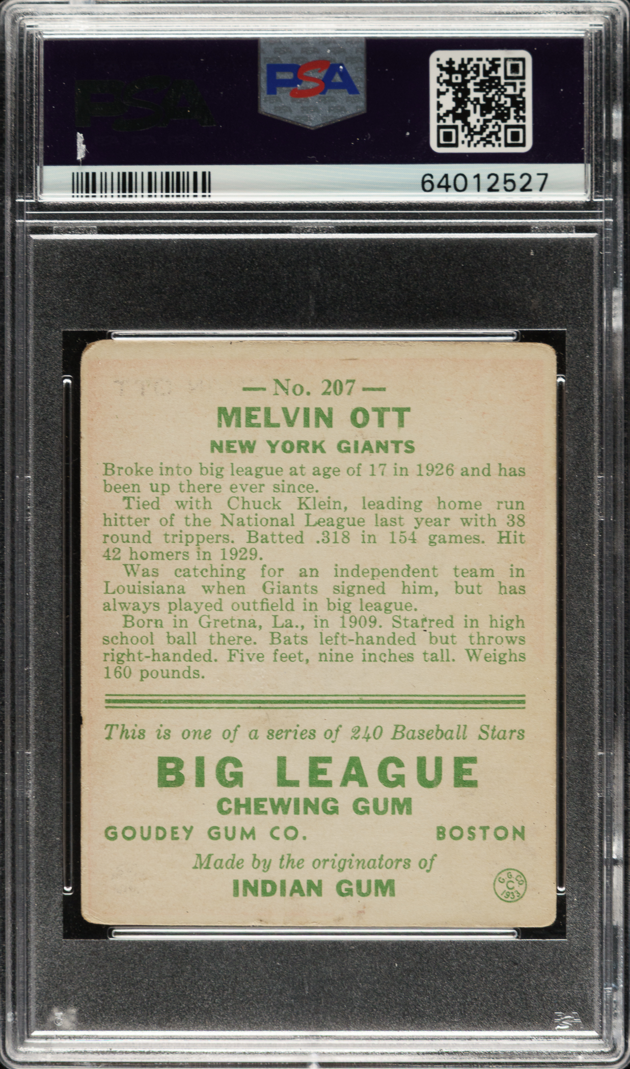 Graded VG-EX 4 by PSA. New York Giants Hall of Famer Mel Ott.