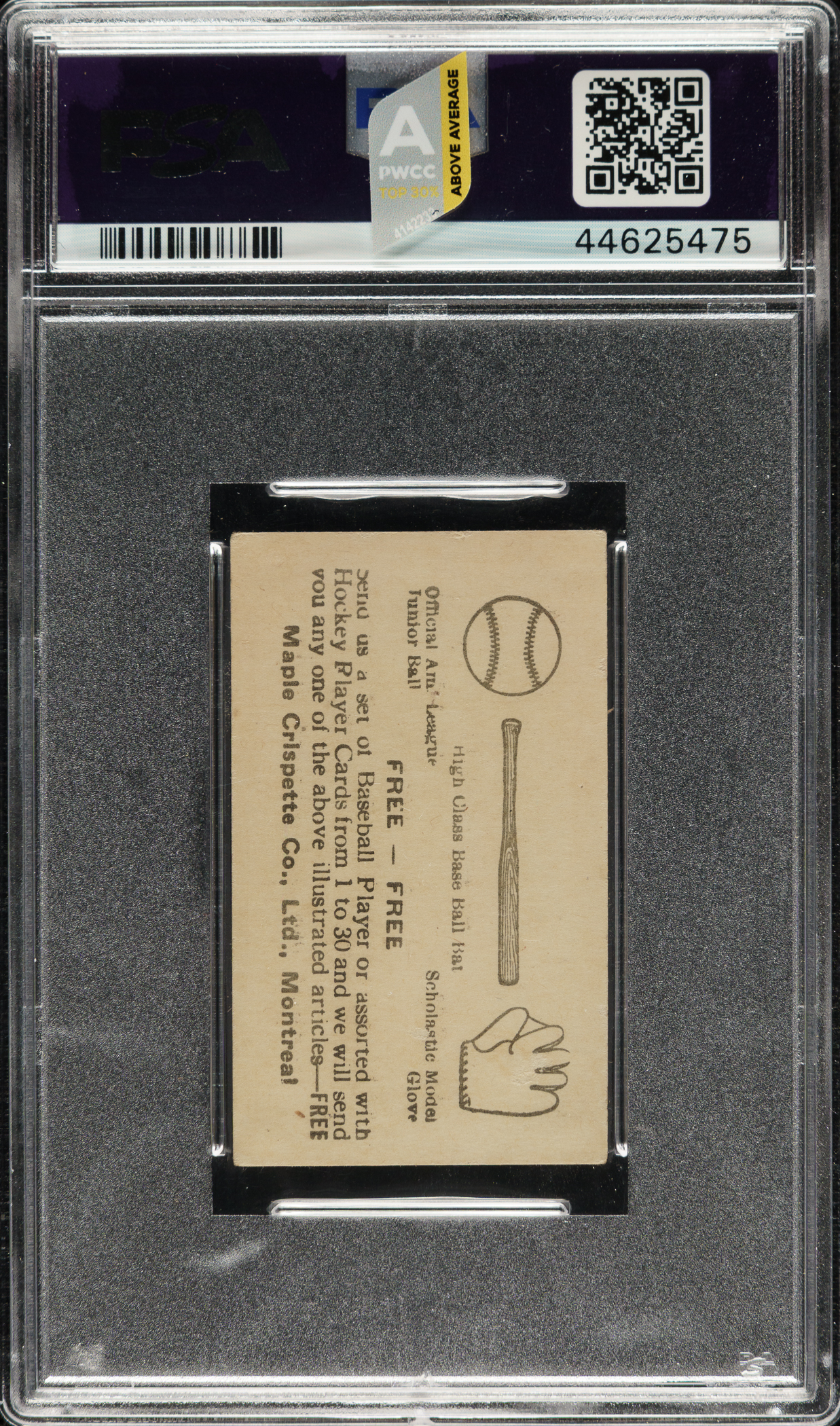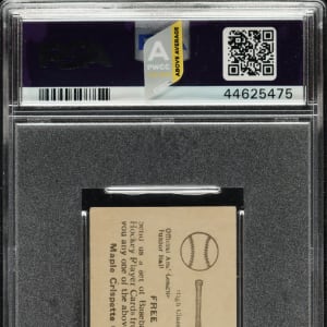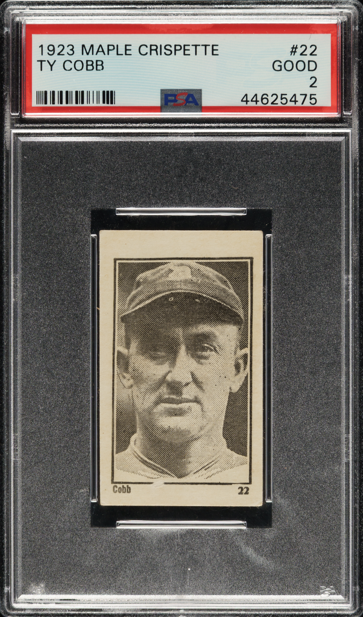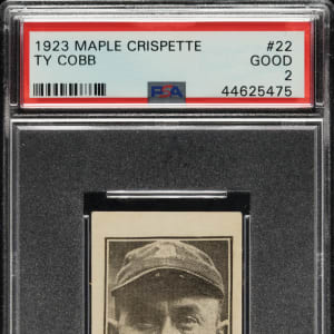 Graded GOOD 2 by PSA. Exceptional mid-grade example of #22 Ty Cobb from the V117 Maple Crispette set. Cobb is one of the key cards from this rare Canadian candy issue. A portrait image of the Detroit Tigers Hall of Famer graces the front of the card, with his name and card number printed underneath. The offered card has a crisp image and even corner wear. The reverse is clean, with a prize redemption offer (complete sets could be exchanged for prizes). Downgraded due to a tiny spot of paper loss on the front. Maple Crispette Cobb cards are very rare, and this is only the sixth example we have offered in the past 21 years. A worthy addition to any advanced Ty Cobb or type-card collection.