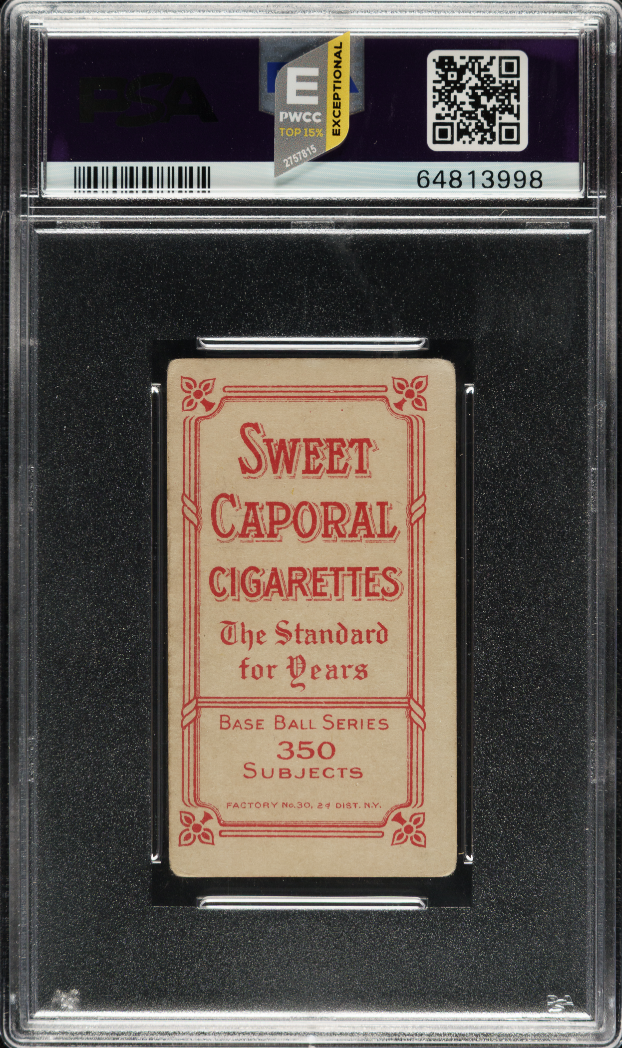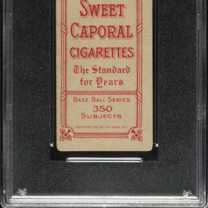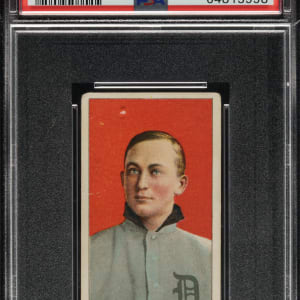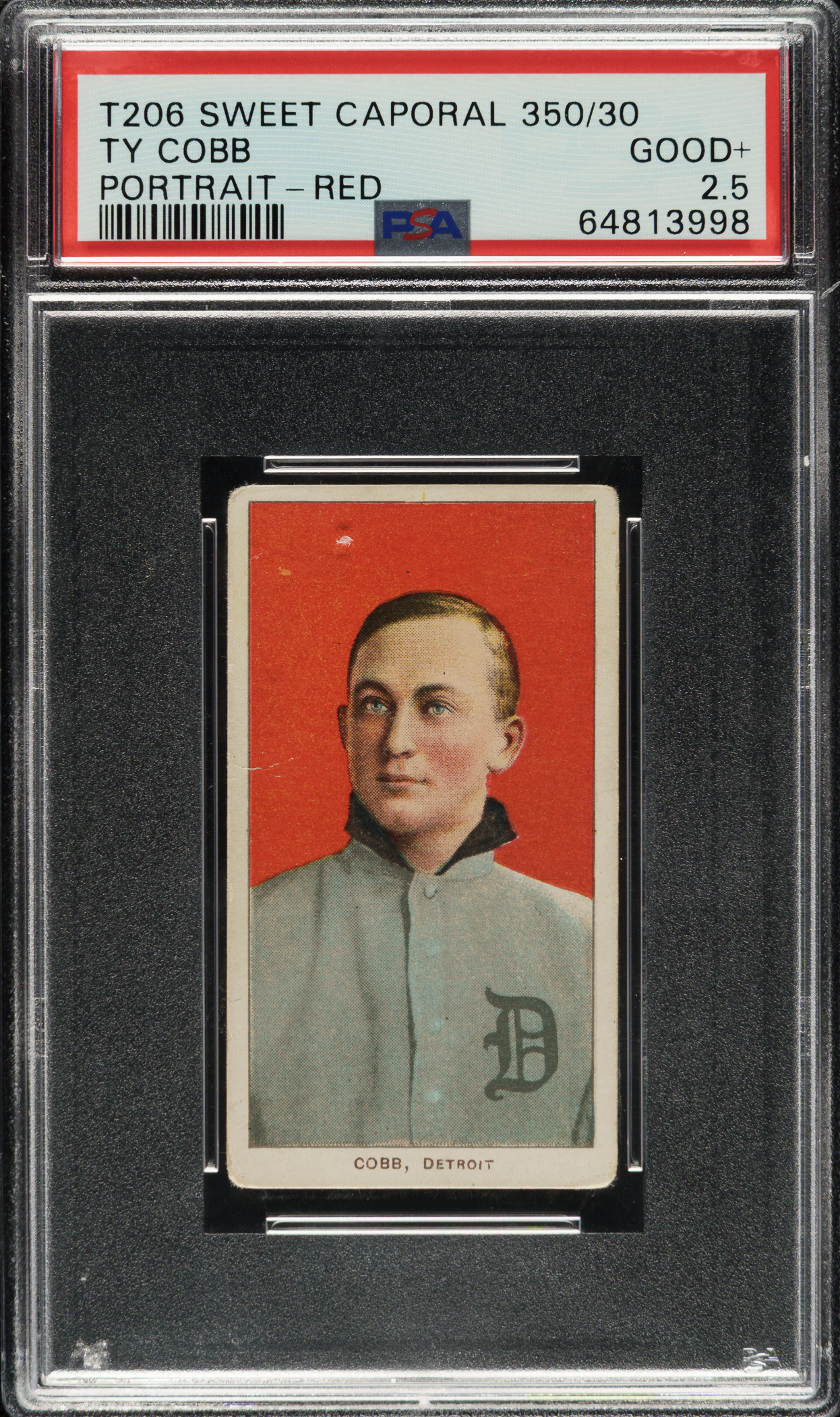 Graded GOOD+ 2.5 by PSA. Appealing example of this classic tobacco card of Detroit Tigers Hall of Famer Ty Cobb. The red-background pose has long been considered a classic Cobb card. This example displays a brilliant red background, outstanding registration, and slightly rounded corners. The Sweet Caporal 350/30 advertising reverse is boldly printed. An unobtrusive crease on the left edge contributes to the assigned grade.