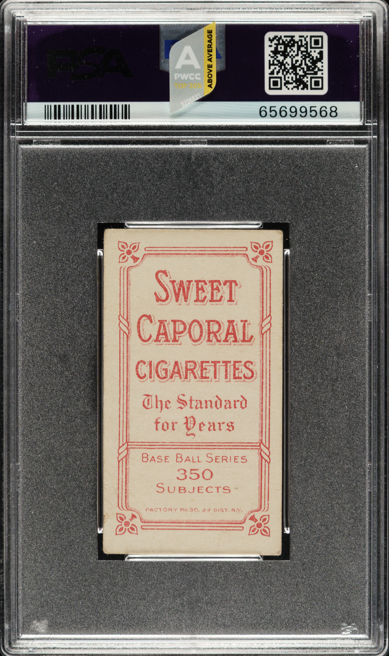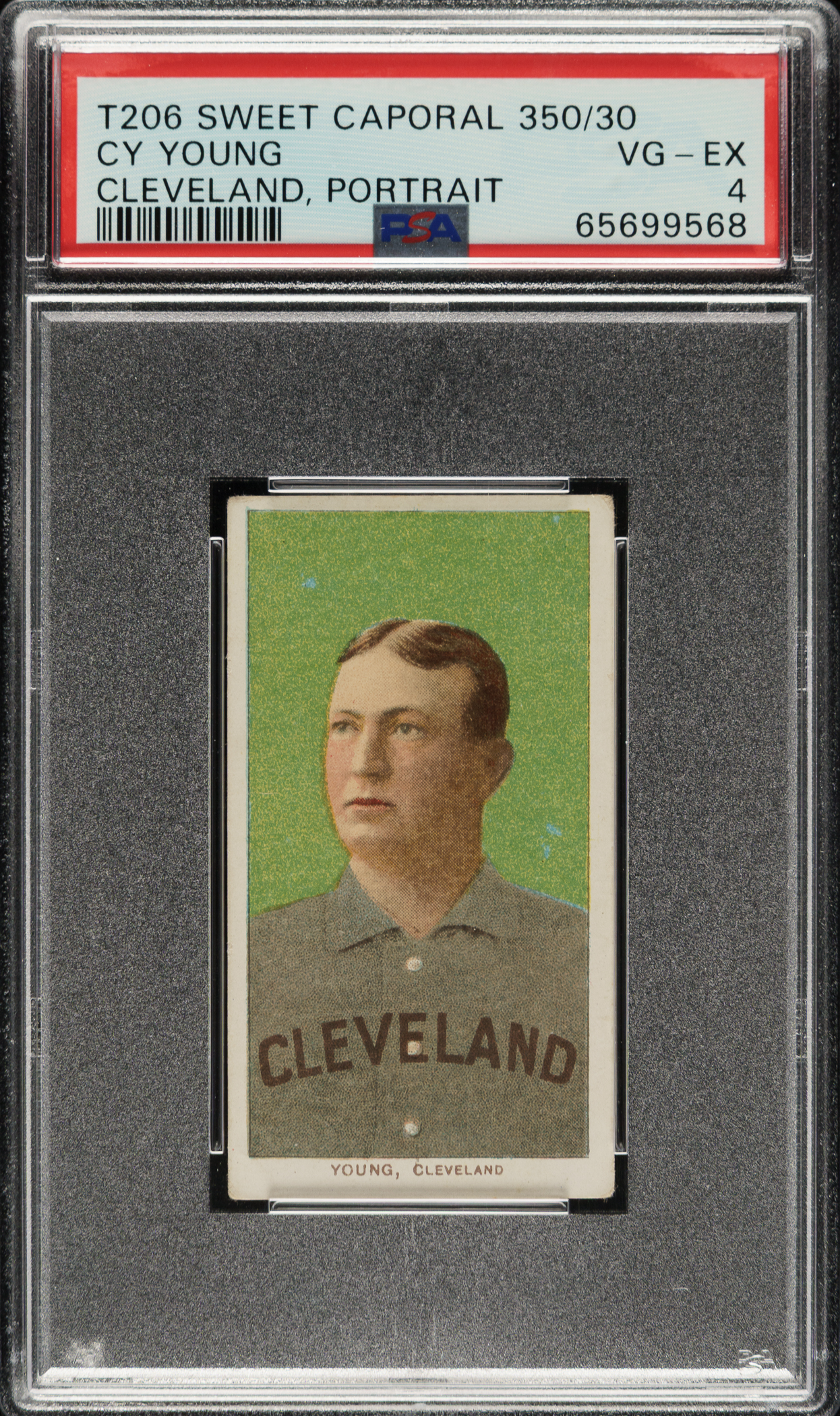 Graded VG-EX 4 by PSA. Very attractive T206 example of Cy Young (portrait) set against a bright green background. This is one of Cy Young's most striking cards and one of the most popular cards in the entire T206 set. This example has a crisp image and even corner wear. Boldly printed Sweet Caporal 350/30 advertising reverse.