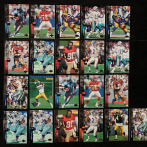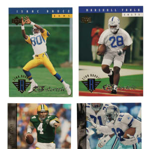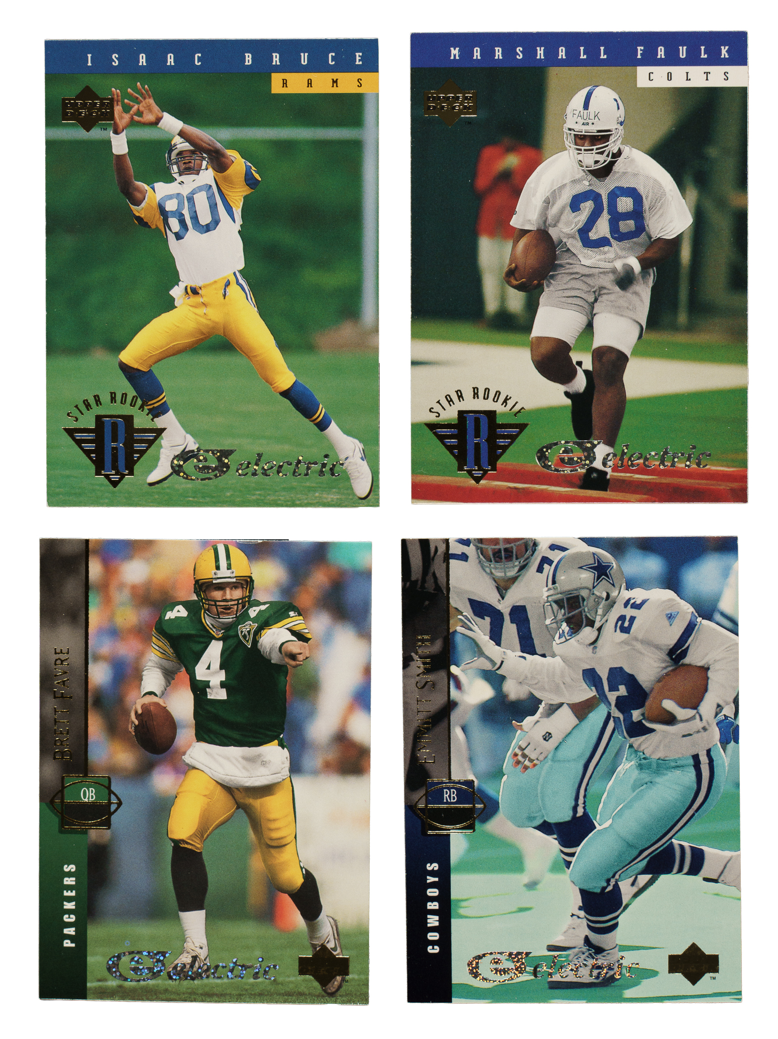 Presented is a very attractive high-grade pair of 1994 Upper Deck Football sets consisting of a complete base set (330) and a complete set (330) of the one-per-pack "Electric Silver" parallels. (A complete set of the scarce one-per-box "Electric Gold" parallels is offered as a separate lot in this auction). Included in the collection are two variations of #157 Emmitt Smith and a total of eleven signed cards. The 1994 Upper Deck Football set is highlighted by dozens of stars and Hall of Famers, including rookie cards of Marshall Faulk and Isaac Bruce. This collection consists of the following: 1) 1994 Upper Deck Complete Base Set (330) Plus One Variation: Condition is 87% Nr/Mt-Mt to Mint and 13% Nr/Mt (including a few slightly lesser). Includes ten signed cards (#7 Faulk, 20 Shuler, 26 Floyd, 27 Rhett, 115 Foster, 127 Novacek, 171 Lott (HOF), 230 Hampton, 318 Coates, and 330 D. Johnston). Keys: #7 Faulk RC (signed, authentication sticker on reverse, otherwise Ex-Mt), 22 Bruce RC (Mint), 129 Sanders (Nr/Mt-Mt), 133 Montana (Nr/Mt-Mt), 136 Marino (Nr/Mt-Mt), 157a Smith/1,900 yards (Nr/Mt-Mt+), and 157b Smith/5,699 yards (Mint). 2) 1994 Upper Deck Electric Silver Complete Set (330) Plus One Variation: Condition is 93% ranging from Nr/Mt to Mint (averaging Nr/Mt-Mt), and 7% lesser (mostly Ex to Ex-Mt). Keys: #7 Faulk RC (Nr/Mt-Mt), 22 Bruce RC (Nr/Mt), 129 Sanders (Mint), 133 Montana (Nr/Mt+), 136 Marino (Nr/Mt-Mt), 157a Smith/1,900 yards (Ex-Mt), and 157b Smith/5,699 yards (Mint). Also included is a signed Electric Gold parallel of #228 Gash. An outstanding high-grade collection highlighted by a difficult-to-assemble complete set of parallels. Total: 663 cards. Auction LOA from James Spence/JSA.