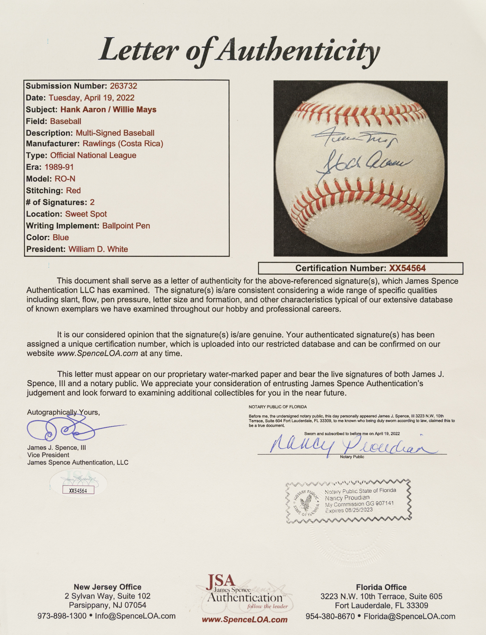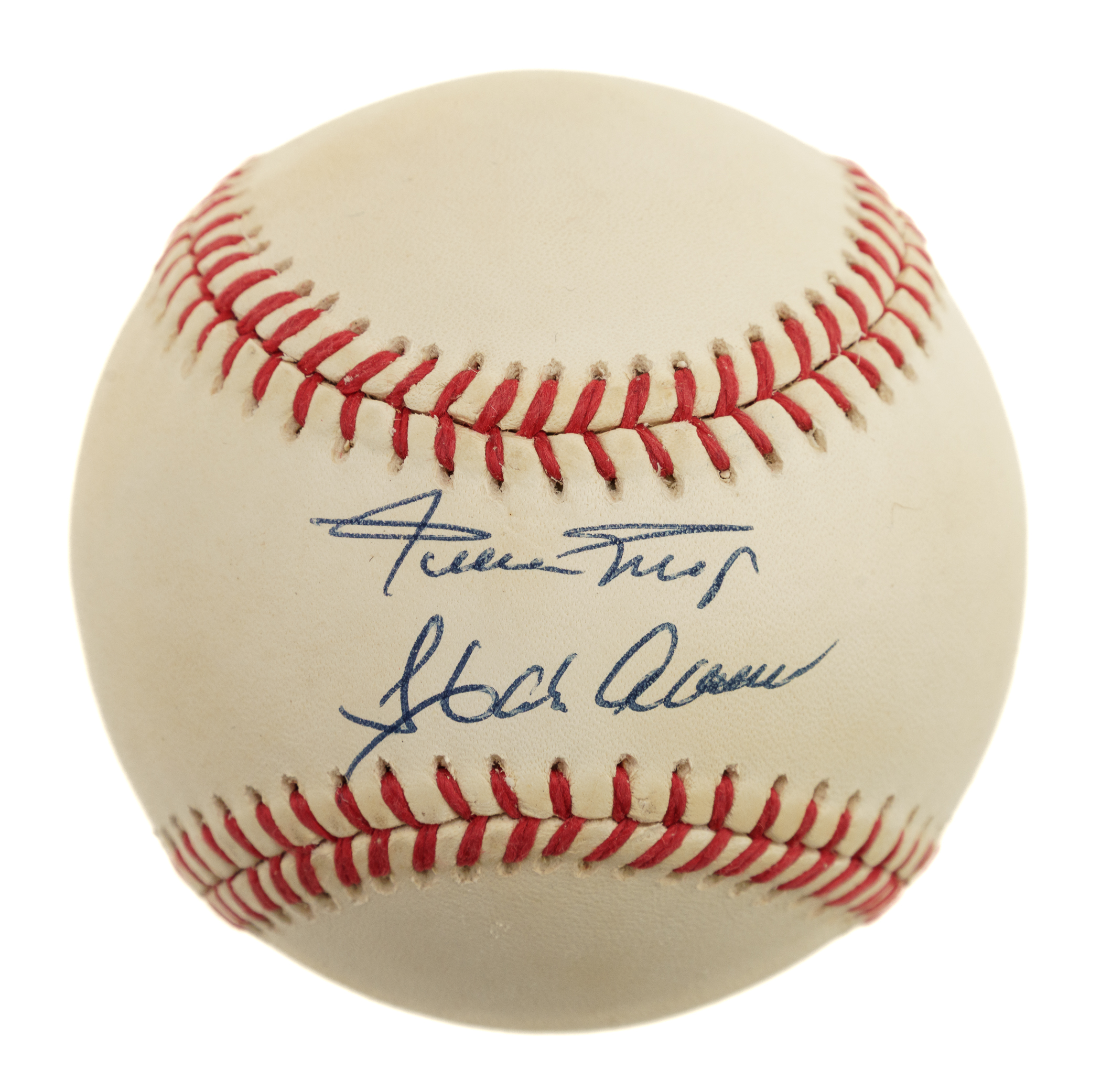 Atlanta Braves and San Francisco Giants Hall of Famers Hank Aaron and Willie Mays signed baseball. Full LOA from James Spence/JSA.