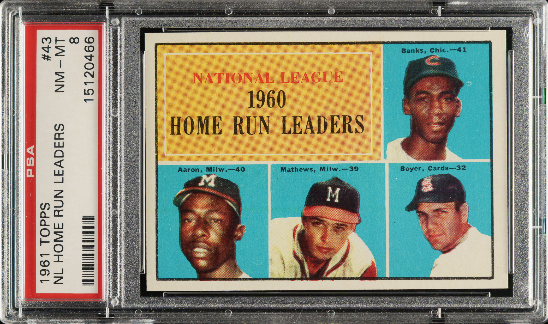 Graded NM-MT 8 by PSA. Featuring Hall of Famers Hank Aaron (Milwaukee Braves), Ernie Banks (Chicago Cubs), and Eddie Mathews (Milwaukee Braves).