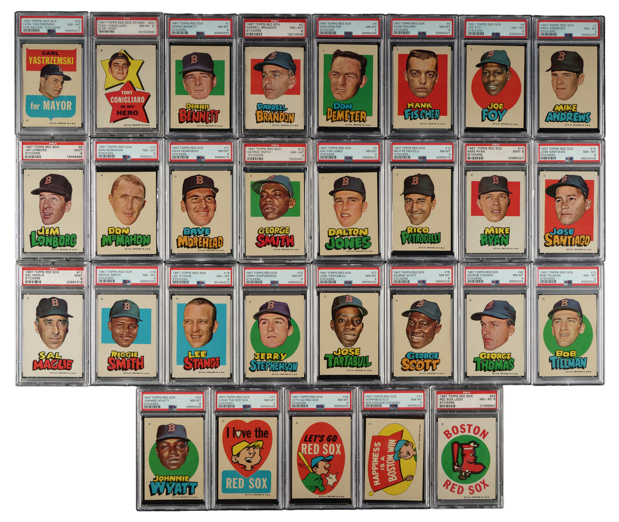 In 1967, when Topps decided to devote a small test issue to the Boston Red Sox, it had no idea that the team would bounce back from their ninth-place finish in the American League the year before and go on to complete one of the greatest turnarounds in baseball history. "The Impossible Dream" season culminated with an American League Pennant, a trip to the World Series for the first time in two decades and numerous awards bestowed upon players, including the AL MVP to slugger Carl Yastrzemski. This high-grade complete set features headshots of players floating above their names along with colorful logos and slogans such as "I Love The Red Sox" and "Happiness is a Boston Win." The stickers measure the same as their standard Topps counterparts but are on a thinner stock with a removable backing. Each sticker has been professionally graded and encapsulated by PSA. PSA Grading Composite: MINT 9 (4 cards): #9, 14, 17, and 33. NM-MT 8 (29 cards): #1, 2, 3 Conigliaro, 4, 5, 6, 7, 8, 10, 11, 12, 13, 15, 16, 18, 19, 20, 21, 22, 23, 24, 25 Yastrzemski, 26 D. Williams, 27, 28, 29 Yastrzemski for Mayor, 30 Conigliaro is My Hero, 31, and 32. Total: 33 stickers. The size/weight of this item requires that there will be an additional shipping charge for this lot.