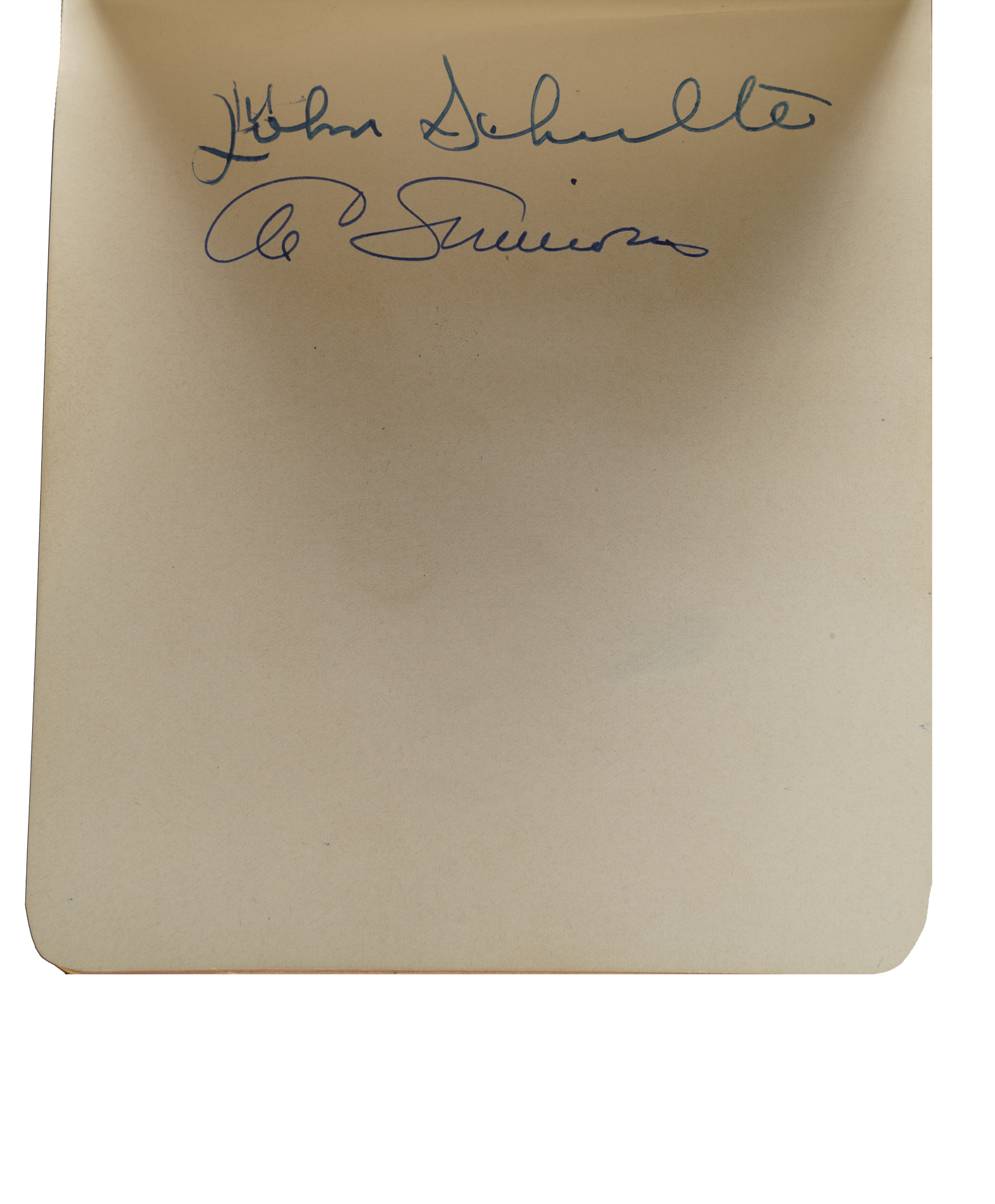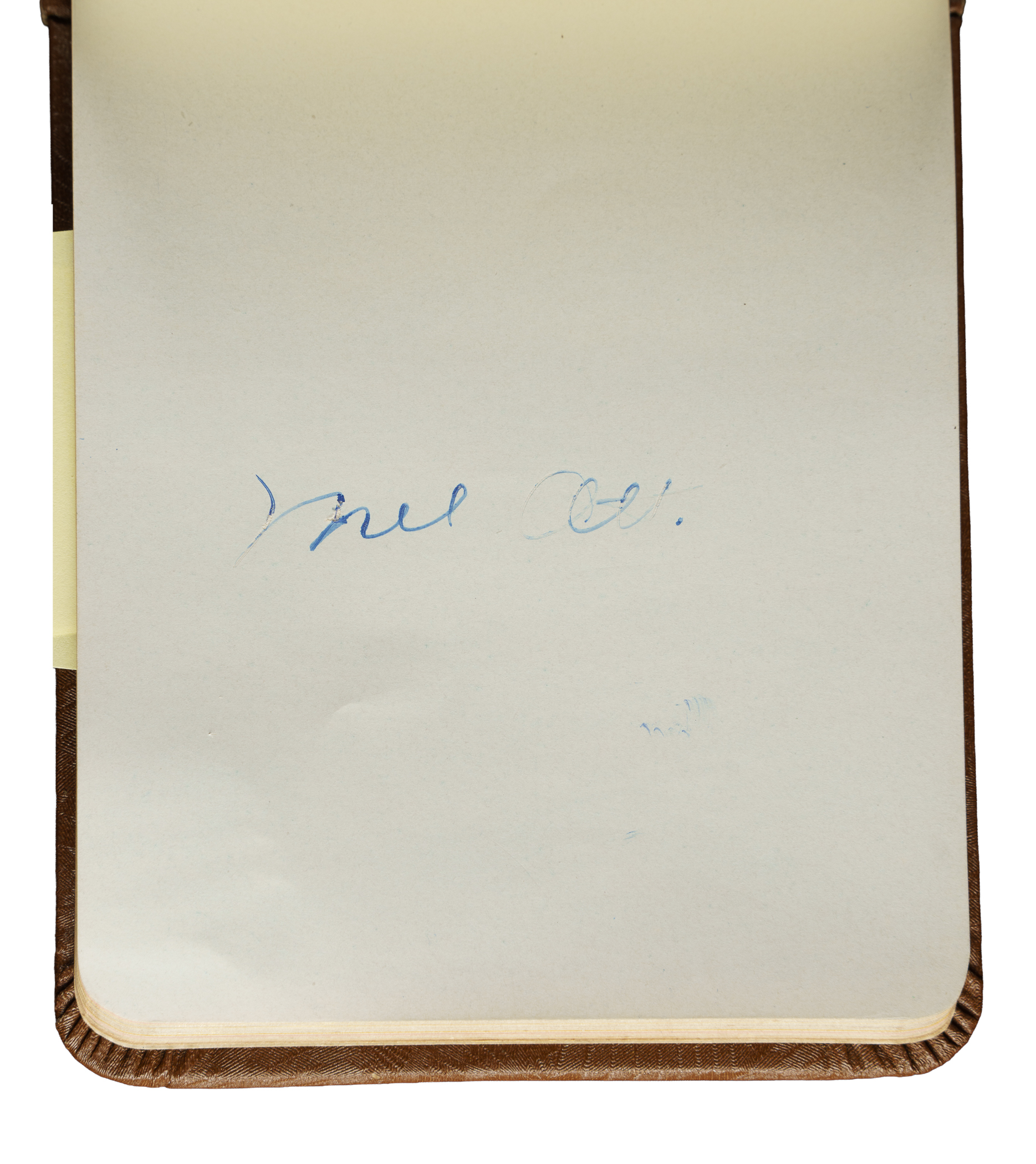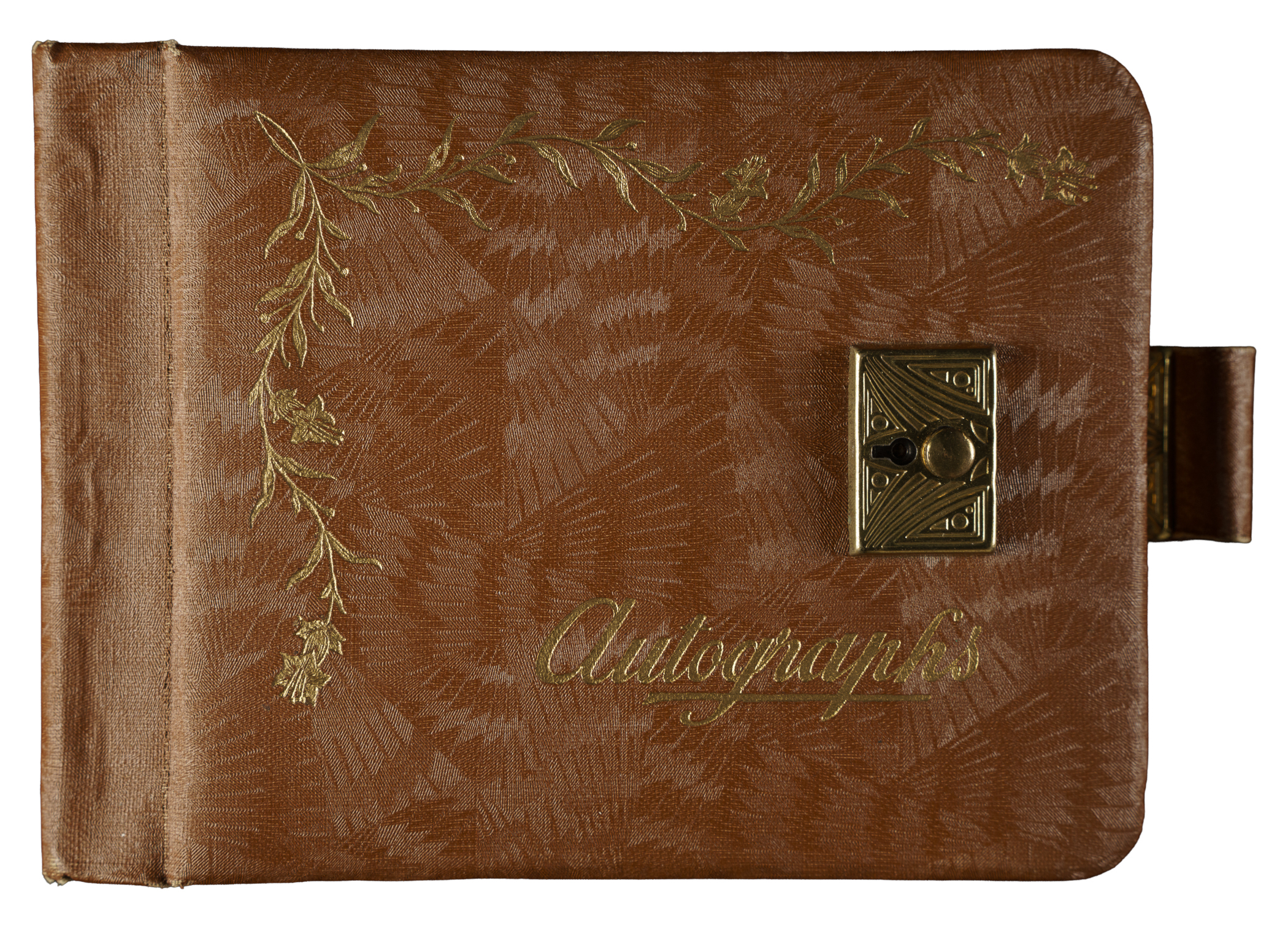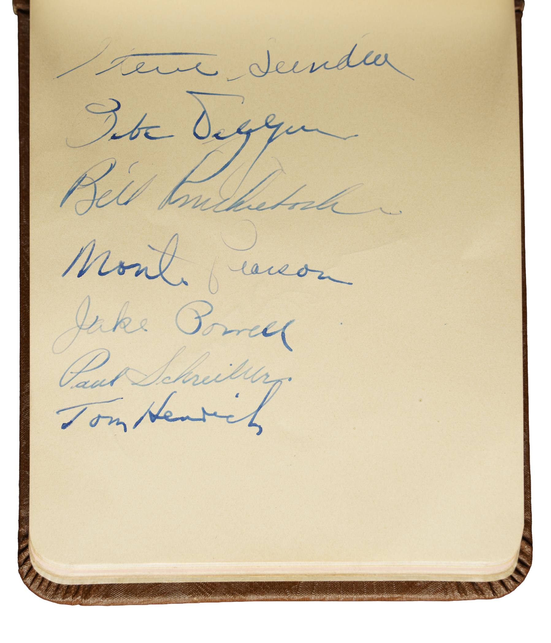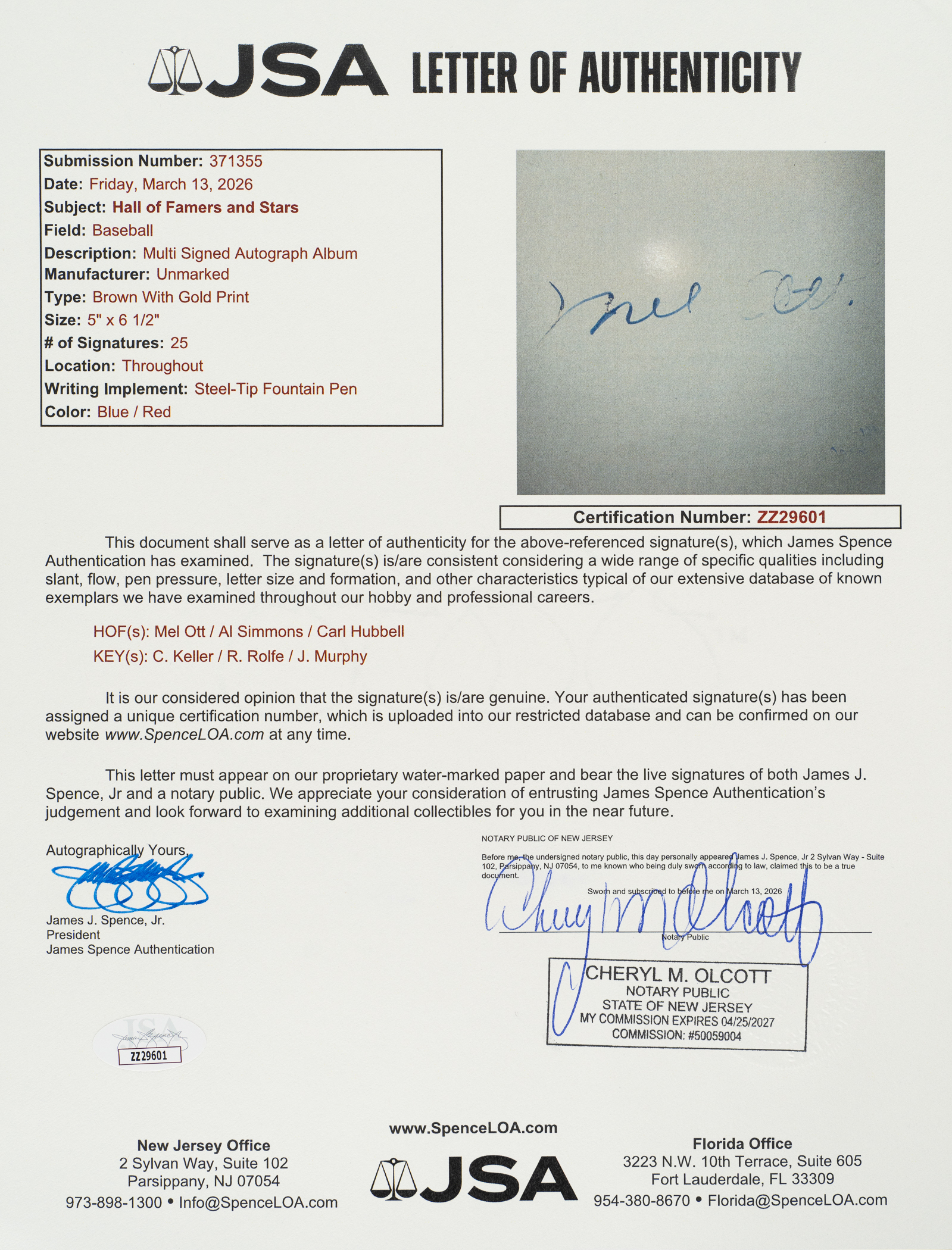Vintage 1930s autograph album featuring the autographs of 25 subjects. Among the signatures in the album are Red Rolfe, Johnny Murphy, Charlie Keller, Monte Pearson, Jake Powell, Tommy Henrich, Al Simmons, Mel Ott, Ted Lyons, Carl Hubbell, and Hal Schumacher. The signatures are rendered predominantly in blue ink. The hardcover album (6.25 x 4.75) has had a few of the pages torn out, but is otherwise in Excellent condition overall. Full LOA from James Spence/JSA.