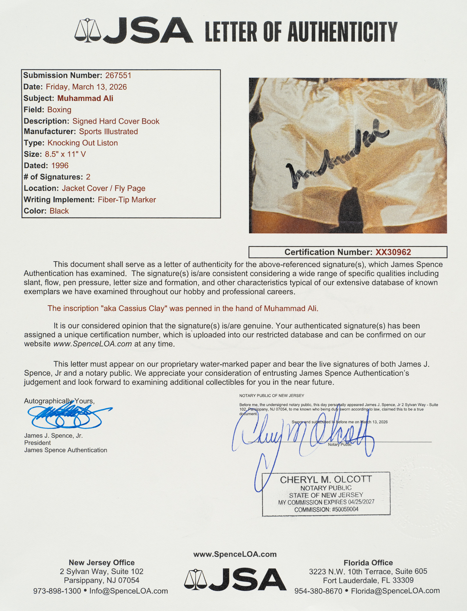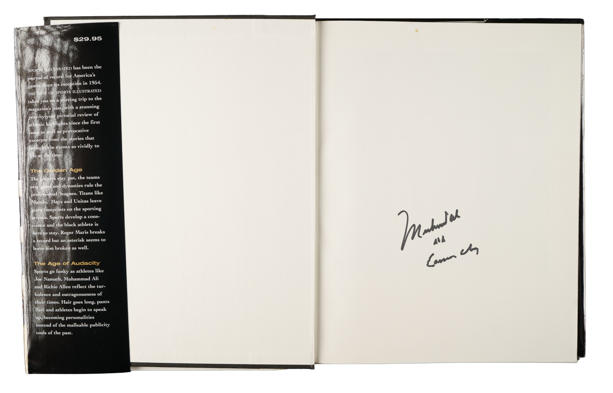 Hardcover first edition of The Best of Sports Illustrated (Little, Brown & Company, New York, 1996) signed twice by Muhammad Ali in black marker. Ali has signed the front of the original dust jacket, "Muhammad Ali," and has signed the inside flyleaf, "Muhammad Ali AKA Cassius Clay." The book (8.5 x 11 inches) is in Excellent condition overall. Two full LOAs from James Spence/JSA (one for each signature).