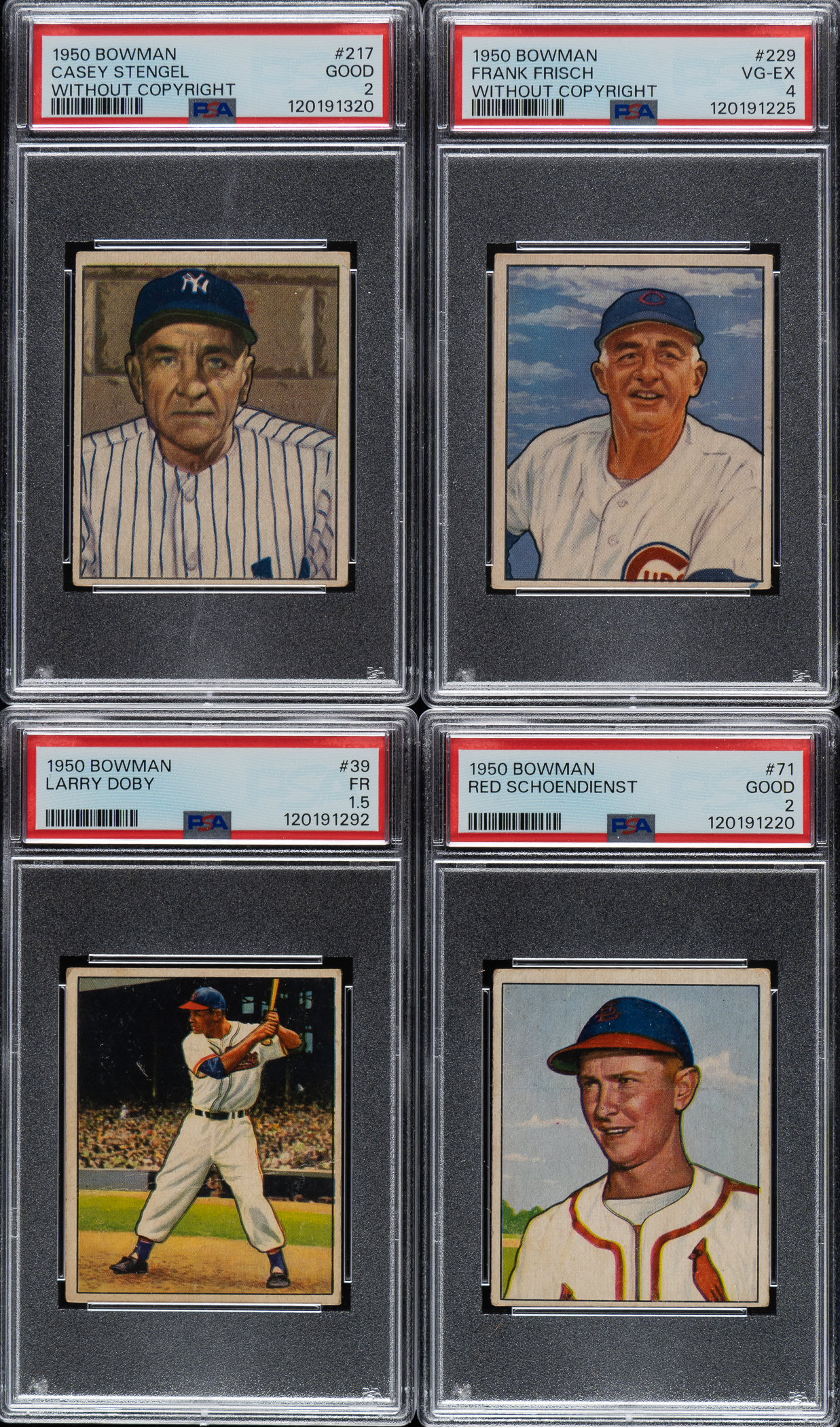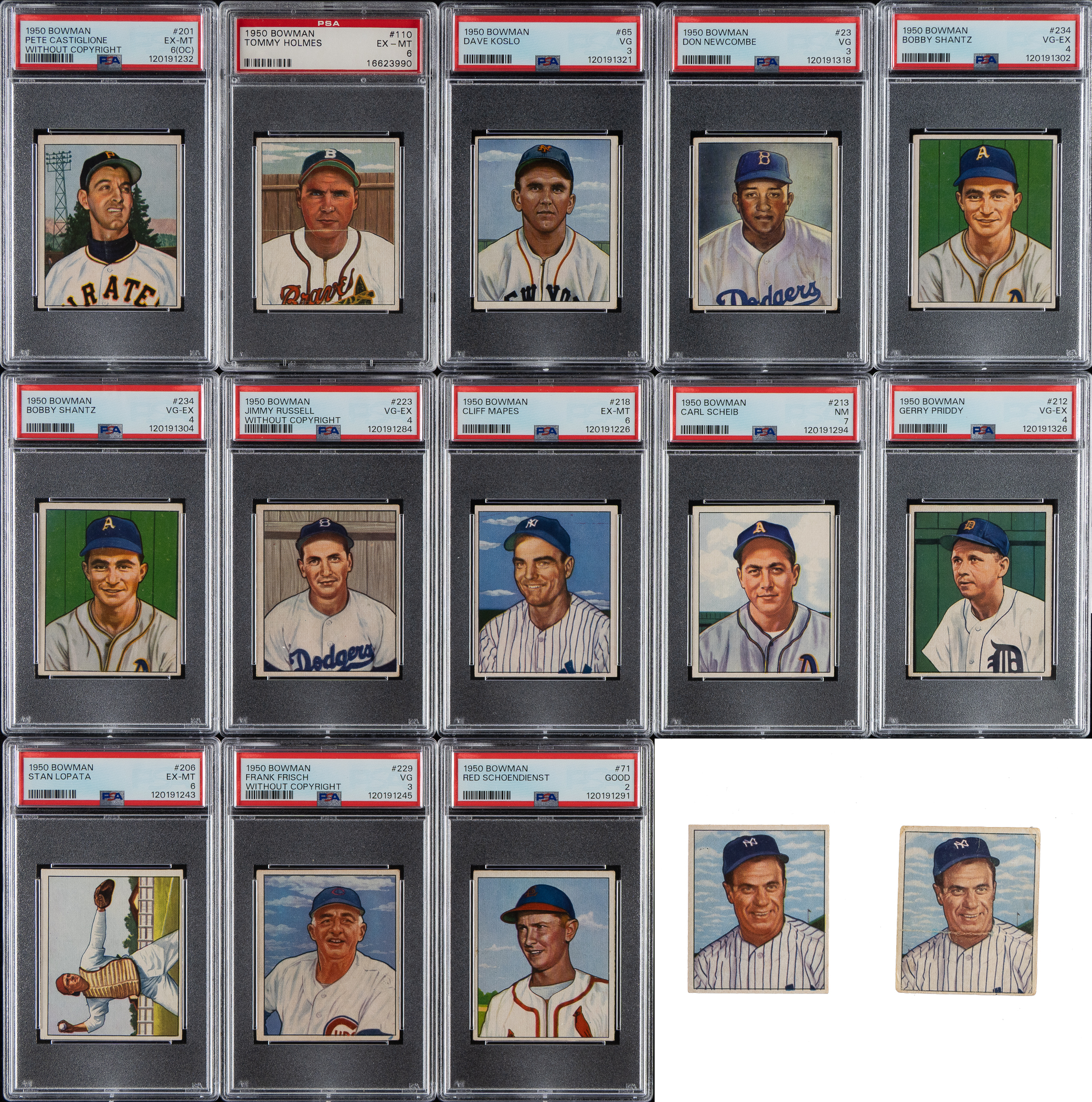 Presented is a very attractive and mostly mid-grade collection of 111 (85 different) 1950 Bowman baseball cards, highlighted by Hall of Famers Larry Doby, Casey Stengel, Frankie Frisch, and Red Schoendienst. Condition is 22% Ex to Ex-Mt (including a couple Nr/Mt), 56% Vg to Vg-Ex, and 22% lesser. Seventeen cards have been professionally graded and encapsulated by PSA. This collection consists of the following: #16, 23 Newcombe RC (VG 3), 39 Doby (FAIR 1.5), 41, 56 Crandall RC, 57, 60, 65 (VG 3), two 71 Schoendienst (both GOOD 2), 76, 78, 81, 85, 86, 92, 108, 110 (EX-MT 6), 117, 120, 121, 131, 132, 142, 144, 146, two 154, 157, 160, 161, 163, 164, 172, 176, 184, 185, 186, two 187, 188, two 189, two 191, 192, 193, 194, two 196, two 197, three 198, three 199, 200, two 201 (one EX-MT 6 [OC]), 202, 203, two 204, 205, 206 (EX-MT 6), three 208, two 209, 210, 211, 212 (VG-EX 4), two 213 (one NM 7), 215 Lopat, two 216, 217 Stengel (GOOD 2), 218 (EX-MT 6), two 219 Bauer RC (Vg+ and Pr-Fr), two 223 (one VG-EX 4), , 225, 226, 227, two 229 Frisch (VG-EX 4 and VG 3), 230, 233, two 234 Shantz (both VG-EX 4), 235, two 236, 237, 238, 240, 242, 243, 244, three 245, two 247, and two 250. Total: 111 cards.