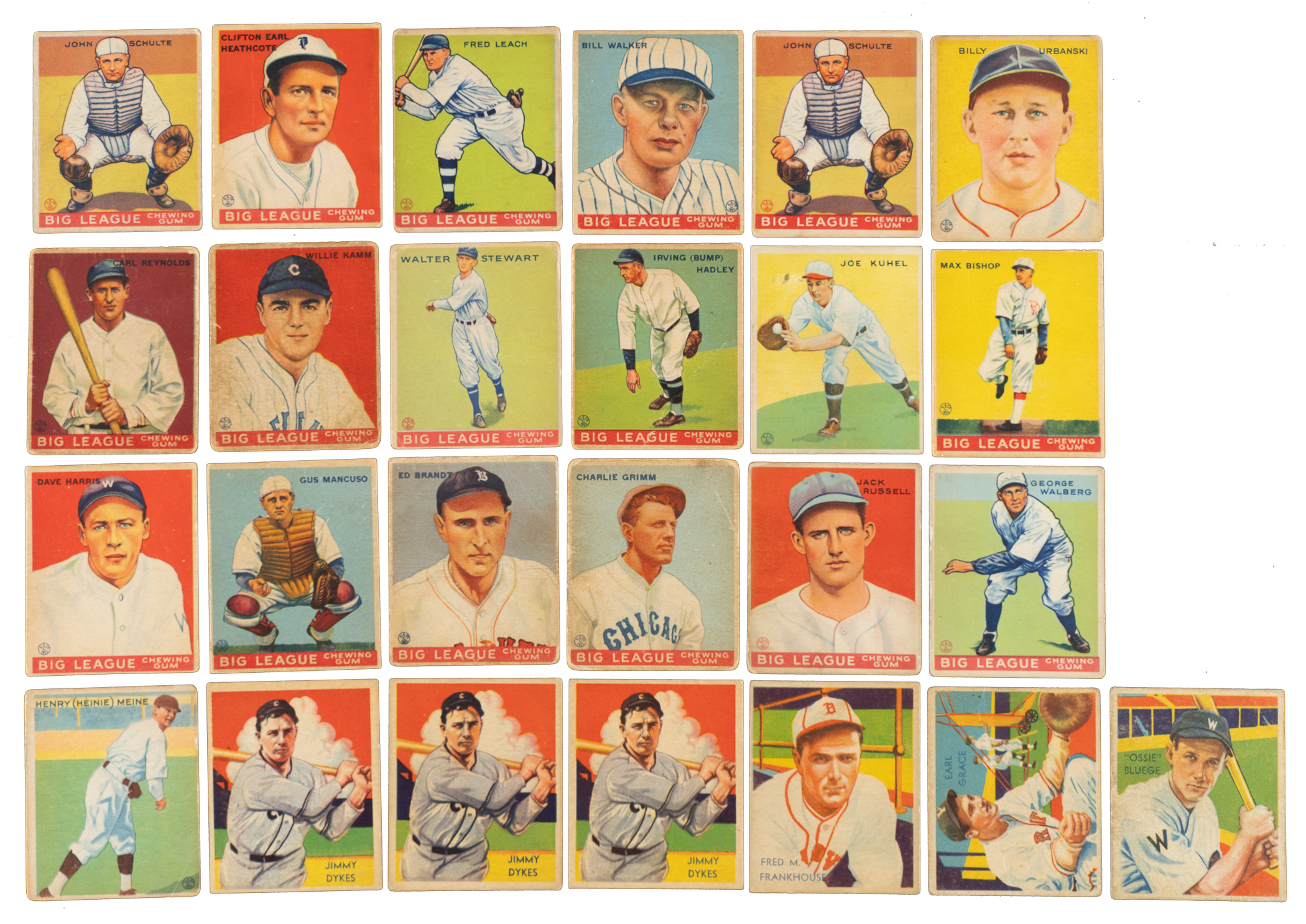 Presented is a collection of twenty-nine 1933 to 1936 Goudey and Diamond Stars baseball cards highlighted by Hall of Famer Heinie Manush. This collection consists of the following: 1) 1933 Goduey (22 cards): Condition is Vg-Ex, six Vg, four Gd, and eleven Pr to Fr (including some due to marks on the reverse). Includes: #9, 41, 50, two 51, 61, two 75, 94, 108 (deemed altered by PSA due to erasure marks), 115, 120, 140, 146, 167, 179, 183, two 186, 187 Manush (Pr due to paper loss on reverse), 205, and 212. 2) 1934-1936 R327 Diamond Stars (7 cards): #33 Rowe (Gd), three 42 (two Vg and ink mark on reverse, otherwise Ex, 62 (measures a bit small, otherwise Gd), 69 (ink marks on reverse, otherwise Gd), and 71 (ink marks on reverse, otherwise Gd). Total: 29 cards.