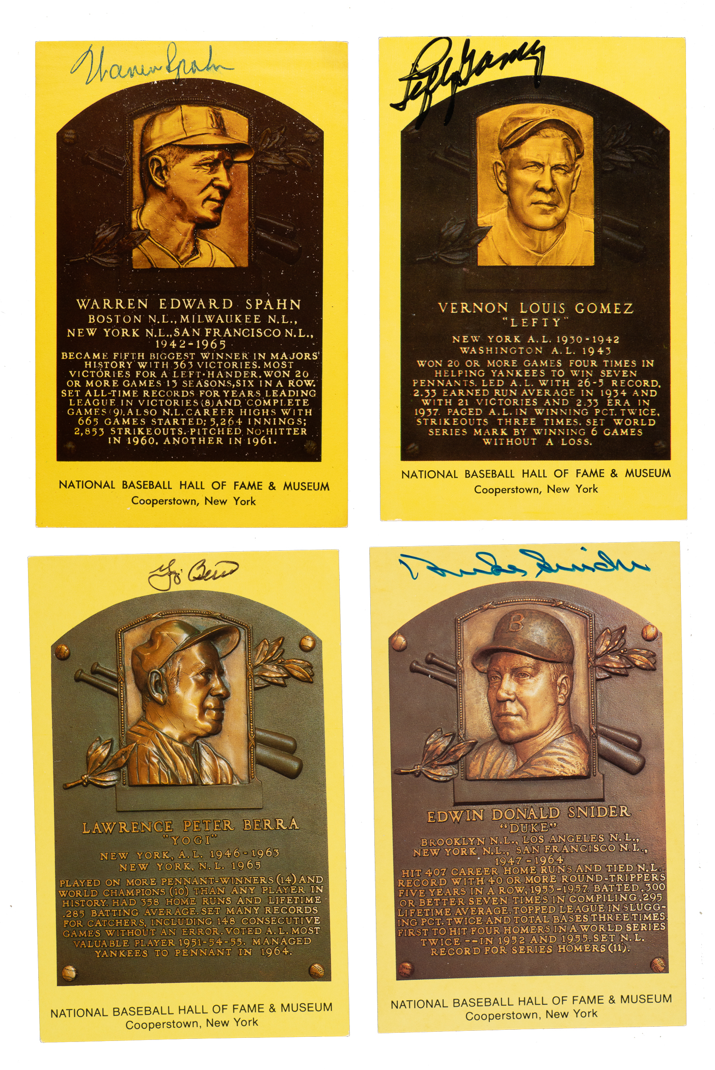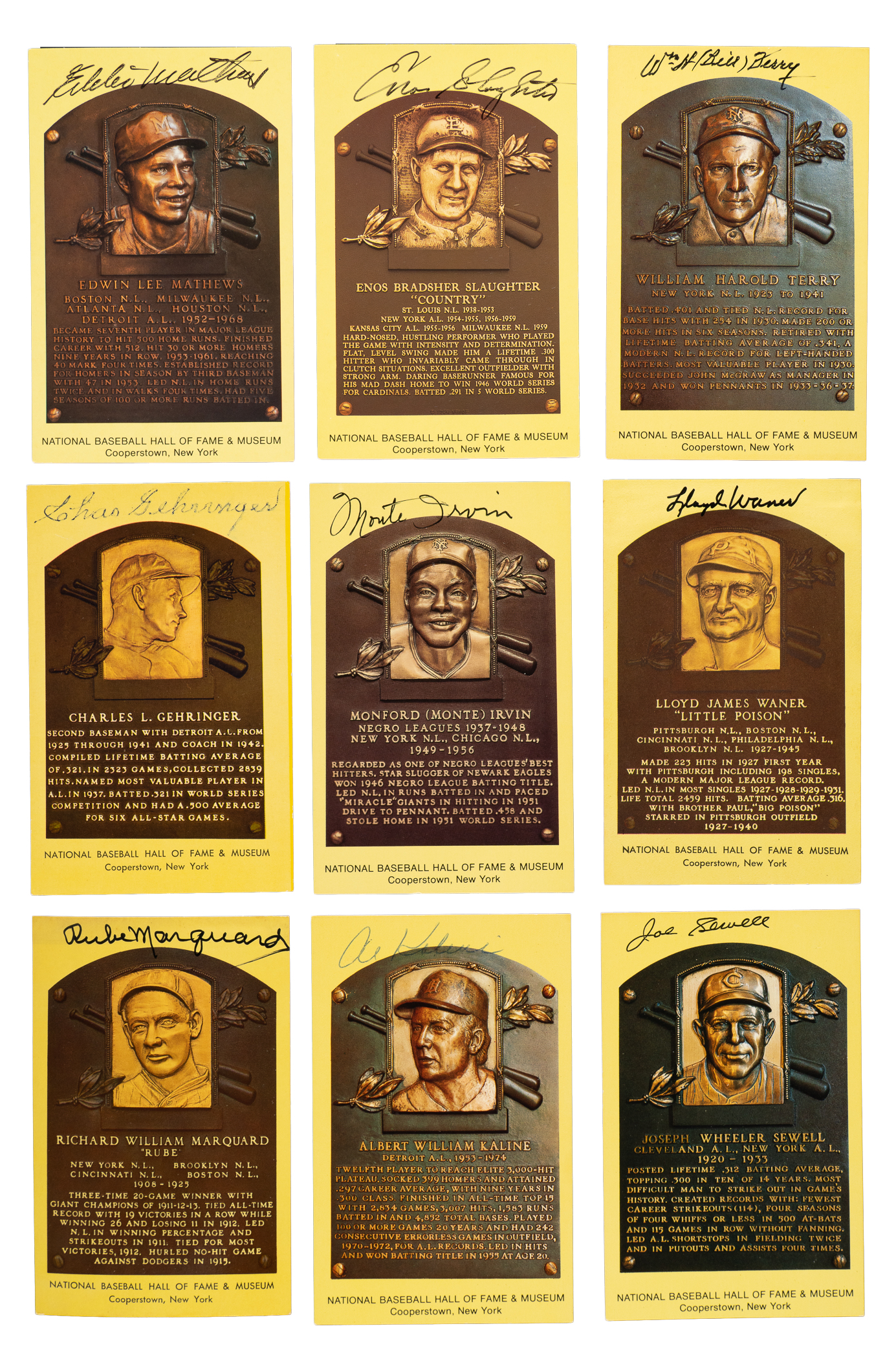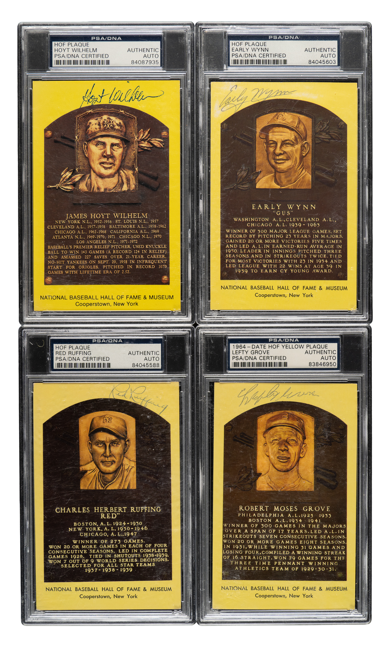Collection of fifty-five signed yellow Hall of Fame postcards. The signatures are scripted in either black or blue ink (Sharpie or ballpoint). The glossy surface was dulled at the top of eight postcards to provide a better surface for signing. Without further reference to this characteristic, the condition is 43% Ex to Ex-Mt and 57% Vg to Vg-Ex. Four postcards have been authenticated and encapsulated by PSA/DNA. This collection consists of the following: Appling, Berra, two Chandler, Coveleski, Dickey, Ferrell, Gehringer, two Gomez, two Grimes, Grove (PSA/DNA Authentic), Haines, Herman, five Irvin, three J. Johnson, Kaline, two Kelly, Killebrew, Kiner, two Leonard, Lopez, two Marquard, Mathews, two McCarthy, three Mize, Niekro, Palmer, two Roberts, Roush, Ruffing (PSA/DNA Authentic), Sewell, Slaughter, Snider, Spahn, three Terry, L. Waner, Wilhelm (PSA/DNA Authentic), and Wynn (PSA/DNA Authentic). Total: 55 signed postcards. Auction LOA from James Spence/JSA.
