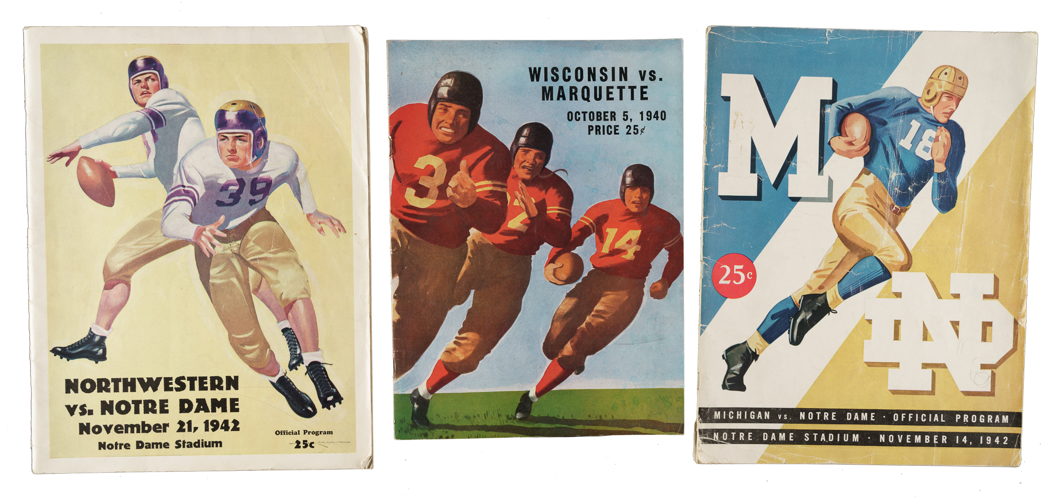 Trio of college football programs dating from 1940 to 1942. This collection consists of the following: 1) October 5, 1940. Wisconsin vs. Marquette, Vg-Ex. 2) November 14, 1942. Michigan vs. Notre Dame, Fr. 3) November 21, 1942. Northwestern vs. Notre Dame, Fr-Gd. Total: 3 programs.