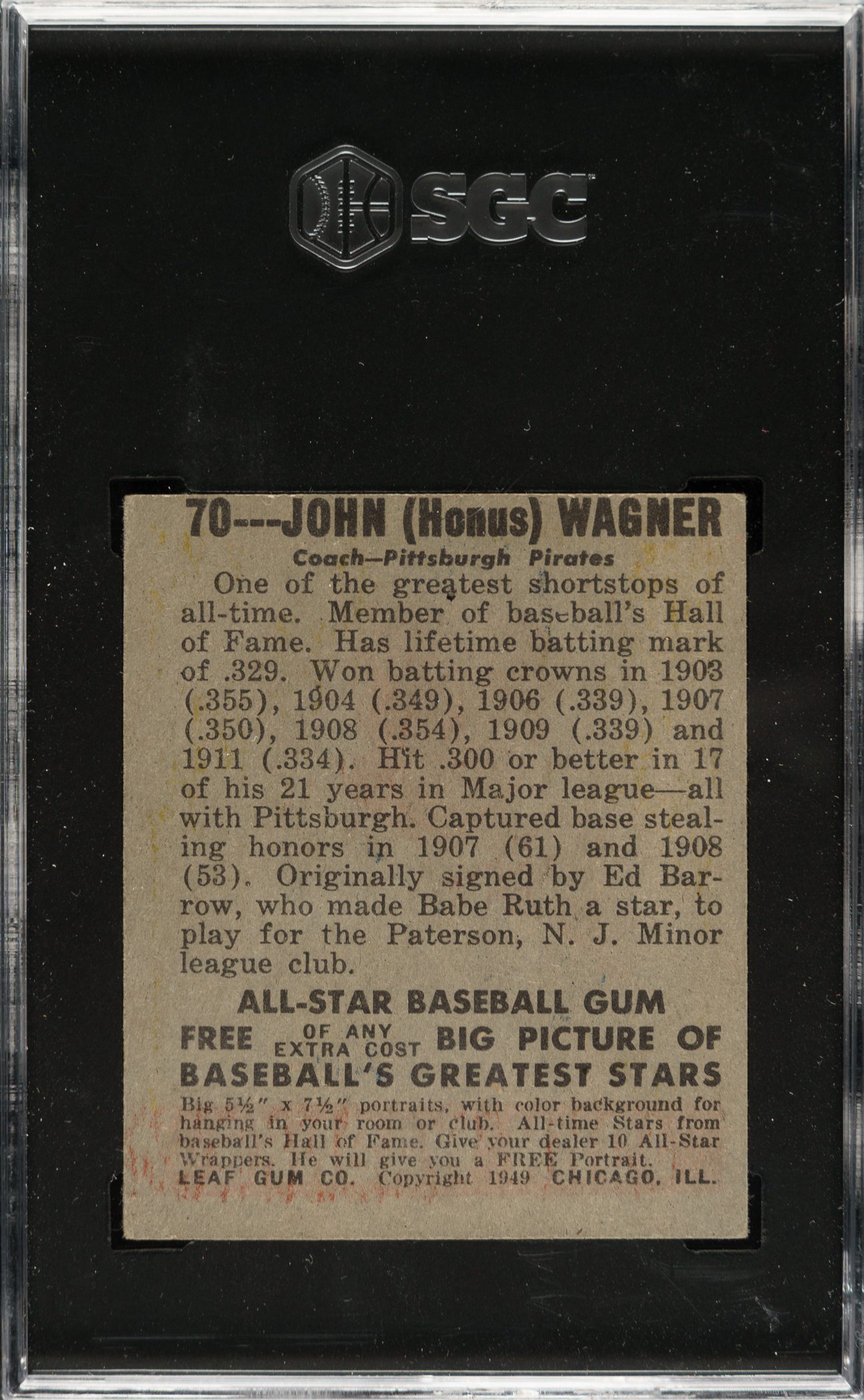 Graded VG/EX 4 by SGC. Pittsburgh Pirates Hall of Famer Honus Wagner.