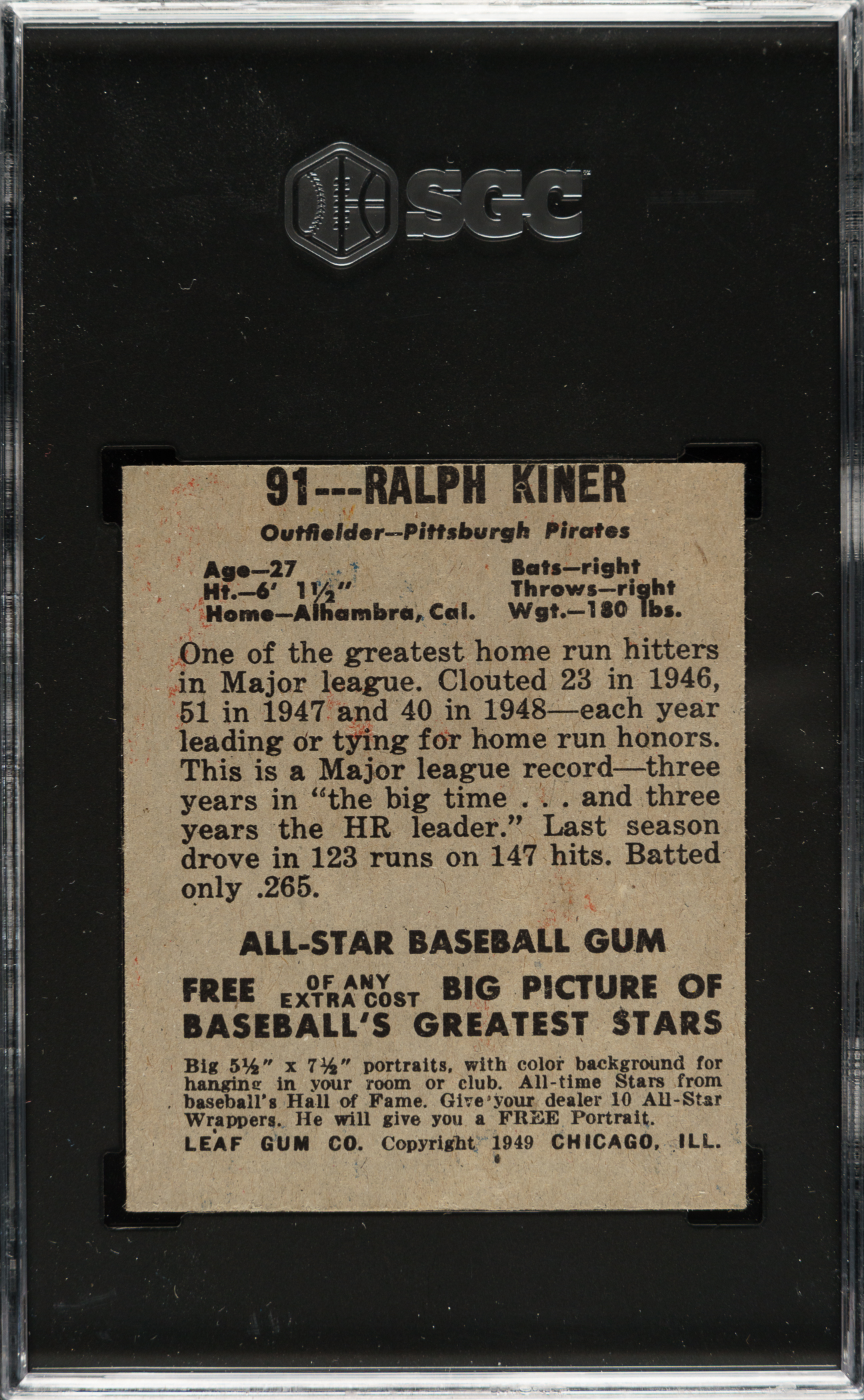 Graded EX 5 by SGC. Pittsburgh Pirates Hall of Famer Ralph Kiner.