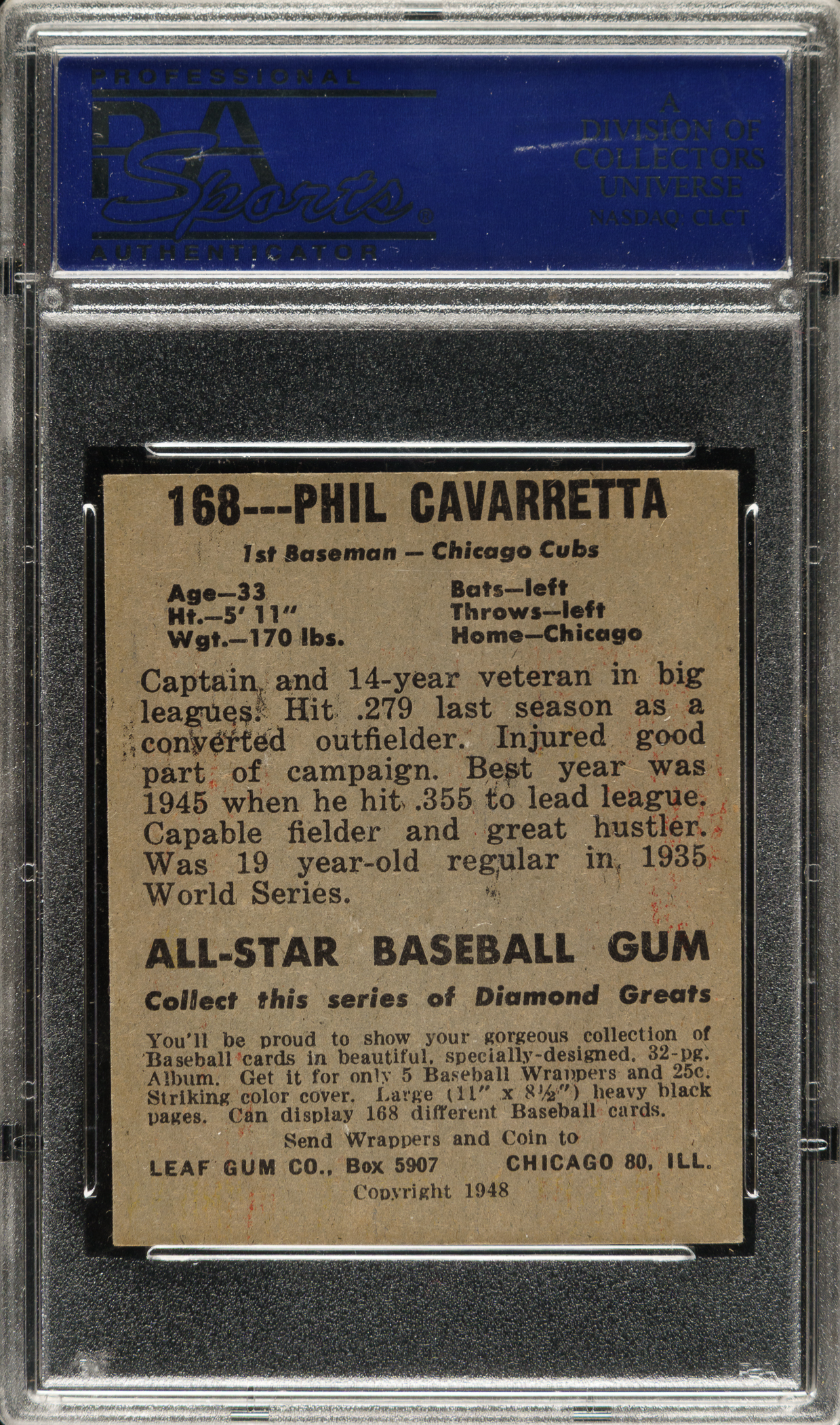 Lot # 1274: 1948-1949 Leaf #168 Phil Cavaretta Short Print PSA VG-EX 4