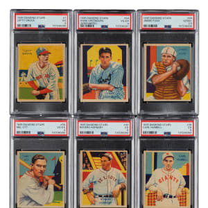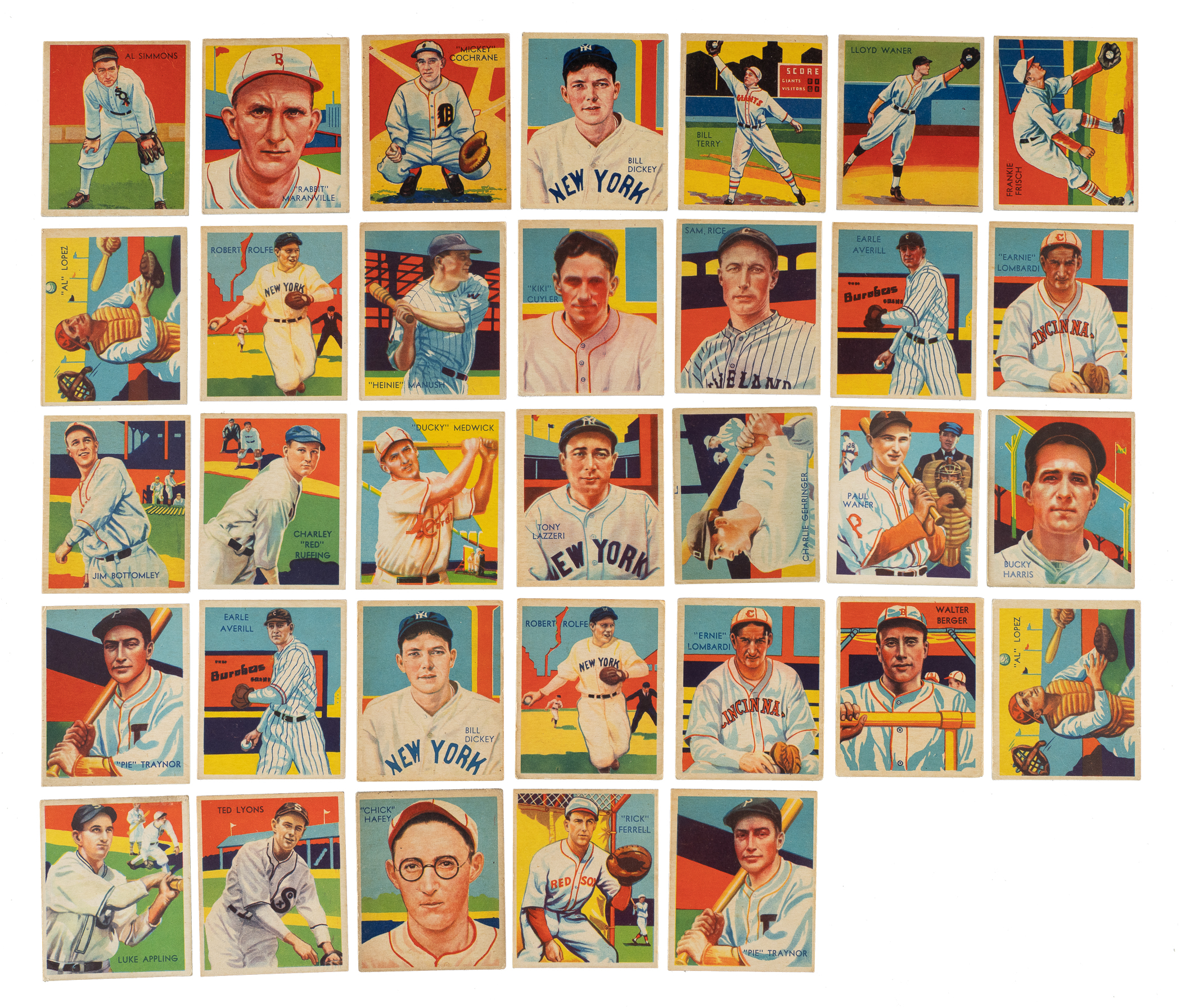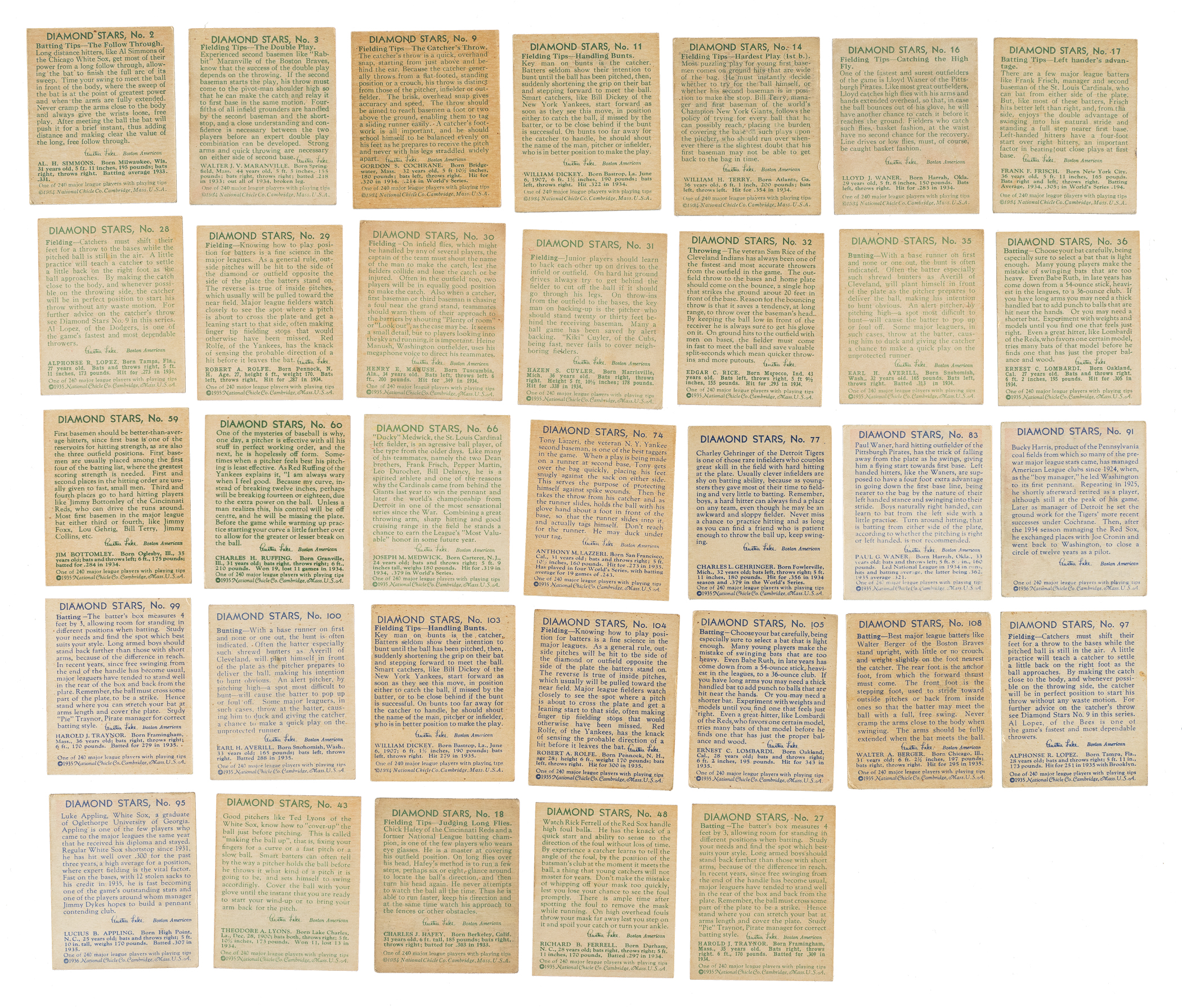 Presented is a very attractive medium-grade complete set of R327 Diamond Stars. This classic 1930s gum-card issue is highlighted by 33 Hall of Famers and includes all 12 of the rare high-number series cards (#97 thru 108), which have always made this issue so difficult to complete. Condition is 45% Vg-Ex to Ex (approximately two-thirds Vg-Ex), 46% Gd to Vg, and 9% lesser (including two with a slight trim and a couple that measure small). We have selected six cards to be graded and encapsulated by PSA. Keys: #1 Grove (VG 3), 2 Simmons (Vg), 3 Maranville (Vg+), 9 Cochrane (Vg+), 11 Dickey (Vg), 14 Terry (Vg), 16 L. Waner (slight trim, otherwise Gd), 17 Frisch (Vg), 18 Hafey (Gd), 27 Traynor (Ex), 28 Lopez (Vg), 29 Rolfe (Ex), 30 Manush (Vg), 31 Cuyler (Gd+), 32 Rice (Vg-Ex), 35 Averill (Ex), 36a "Earnie" Lombardi (Fr-Gd), 39 Hubbell (EX 5), 43 Lyons (Vg-Ex), 44 Hornsby (EX 5), 48 Ferrell (measures a bit small, otherwise Vg-Ex+), 50 Ott (VG-EX 4), 54b Greenberg (VG-EX 4), 59 Bottomley (tiny ink mark on bottom-right corner, otherwise Ex-Mt), 60 Ruffing (Vg-Ex), 64 Foxx (GOOD+ 2.5), 66 Medwick (Vg), 74 Lazzeri (Vg), 77 Gehringer (Vg), 83 Waner (Vg), 91 Harris (Vg-Ex), 95 Appling (Gd), 97 Lopez (slight trim, otherwise Gd+), 99 Traynor (Vg-Ex), 100 Averill (Vg), 103 Dickey (Vg+), 104 Rolfe (Vg), 105 Lombardi (Gd+), and 108 Berger (Vg). This is a very sharp-looking complete set of one of the 1930s' most popular issues. Total: 108 cards.