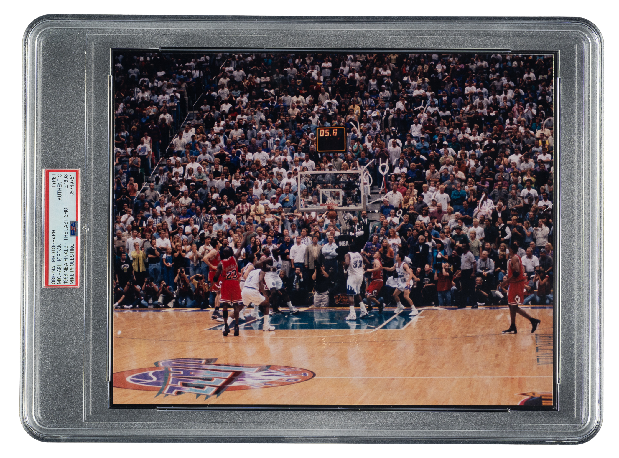 Incredible original photograph of Michael Jordan's "The Last Shot" taken by photographer Mike Probesting at the end of Game 6 of the 1998 NBA Finals between the Chicago Bulls and Utah Jazz at the Delta Center in Salt Lake City, Utah. Encapsulated and certified as an original Type I photograph by PSA/DNA. After a thrilling, hard-fought series, Game 6 of the 1998 NBA Finals served as the dramatic climax of the Bulls' defining "Last Dance" season. With Chicago's dynasty on the verge of being dismantled, Jordan capped an epic 45-point performance by stripping Karl Malone and sinking his legendary jumper over Byron Russell in the game's waning seconds, clinching the Bulls' sixth title in eight seasons. Jordan, voted Finals MVP for a record sixth time, forever cemented his legacy with "The Last Shot," which also signaled the end of the Bulls' dynasty, as both he and Hall of Fame head coach Phil Jackson departed after the season. The photo (10 x 8 inches) is in Near Mint condition overall.