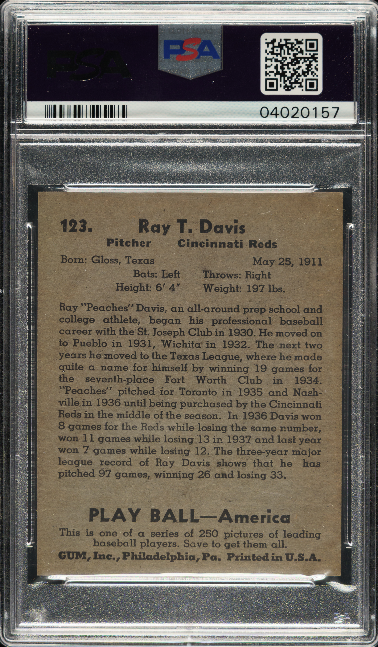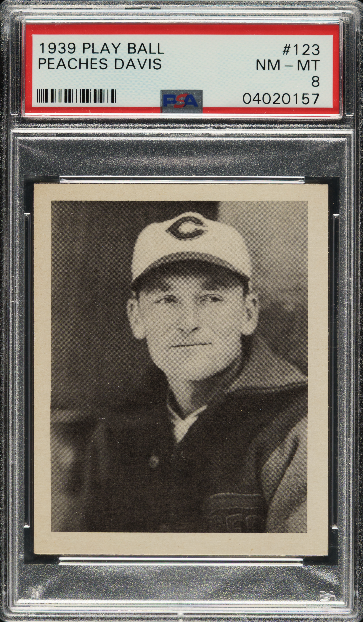Lot # 1183: 1939 R334 Play Ball #123 Peaches Davis PSA NM-MT 8