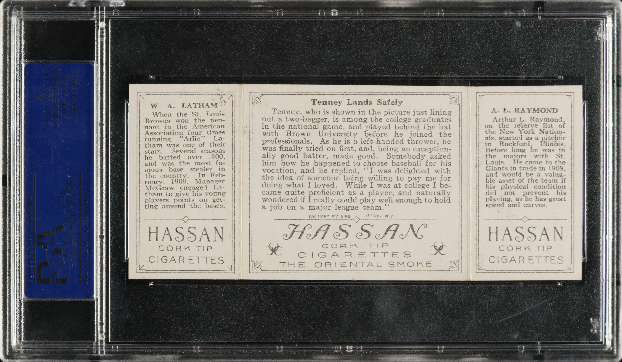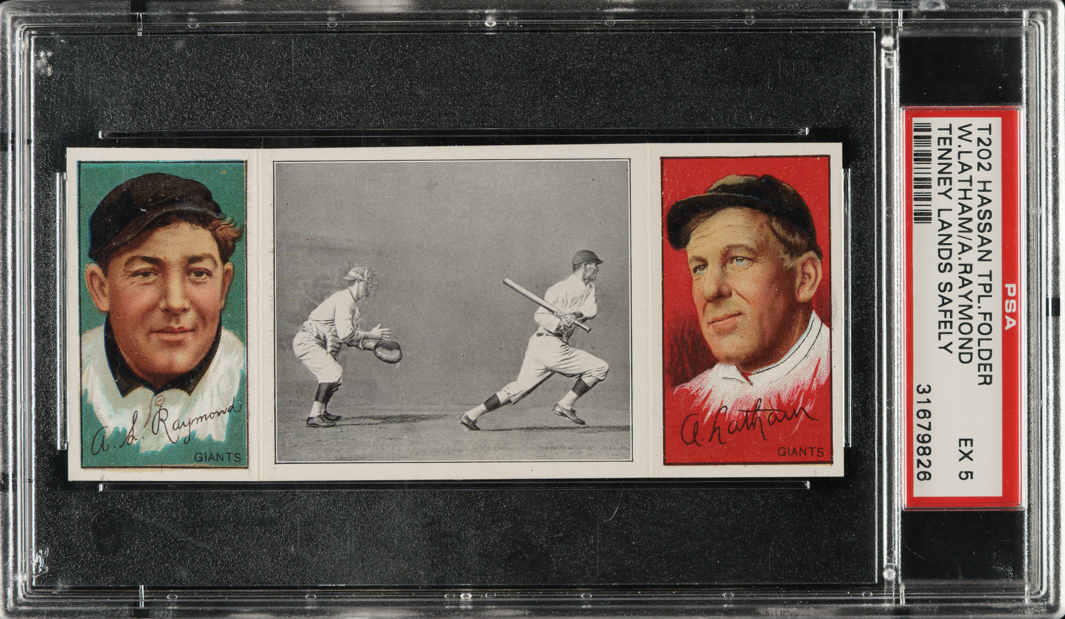 Lot # 887: 1912 T202 Hassan Triple Folder "Tenney Lands Safely" Raymond/Latham PSA EX 5