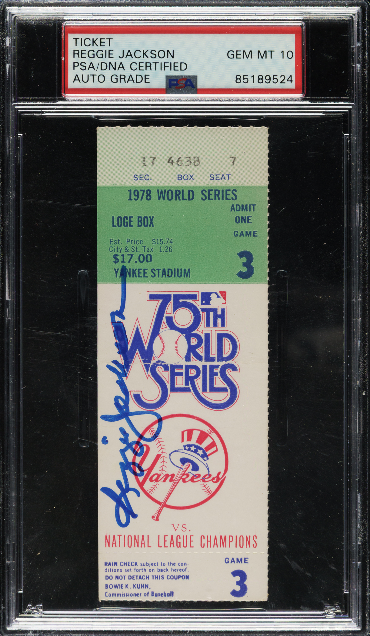 PSA/DNA has encapsulated the ticket, grading the signature GEM MINT 10. New York Yankees Hall of Famer Reggie Jackson.