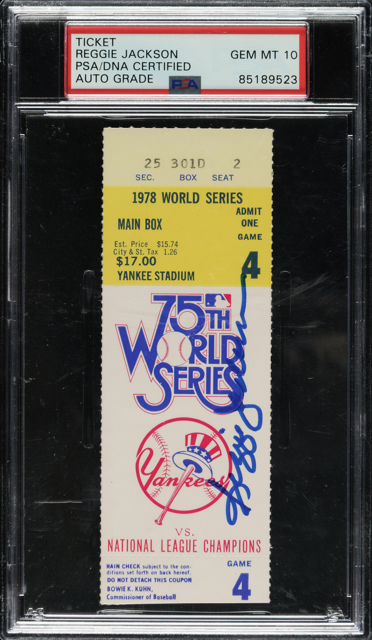 PSA/DNA has encapsulated the ticket, grading the signature GEM MINT 10. New York Yankees Hall of Famer Reggie Jackson.