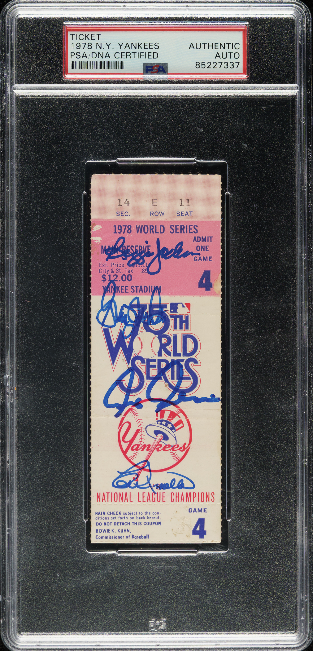 PSA/DNA has encapsulated the ticket, grading the signatures Authentic. This ticket is signed by the following: Reggie Jackson, Graid Nettles, Lou Piniella, and Chris Chambliss.
