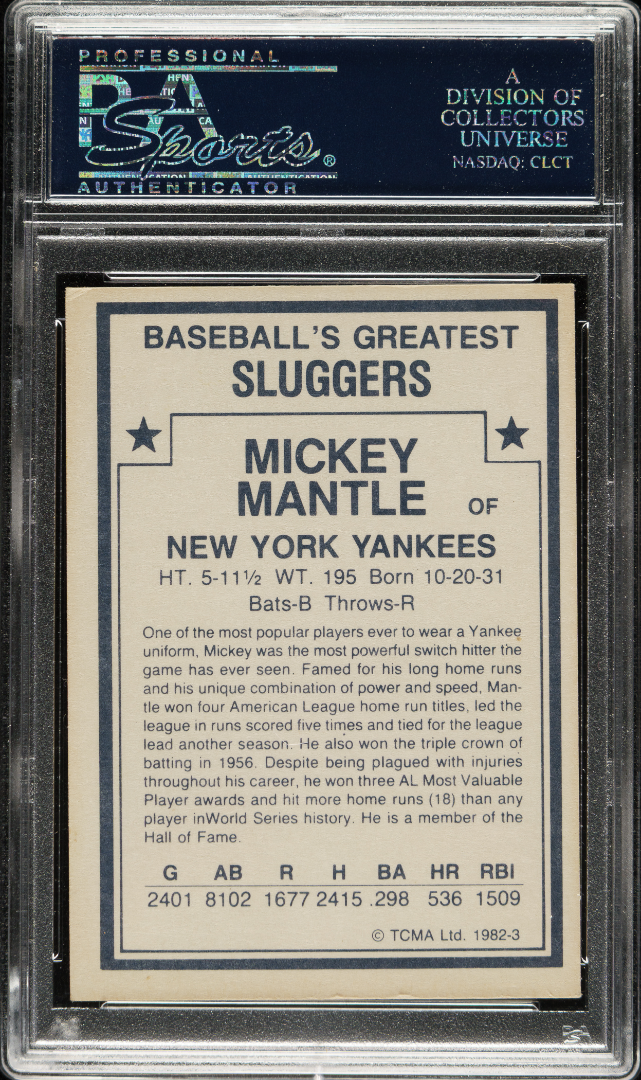 1982 TCMA Baseball's Greatest Sluggers # 3 Mickey Mantle, signed by Mantle on the front. PSA/DNA has encapsulated the card and certified the signature as "Authentic." Mantle's signature has been boldly scripted in blue ink. One of eight signed examples encapsulated by PSA/DNA.