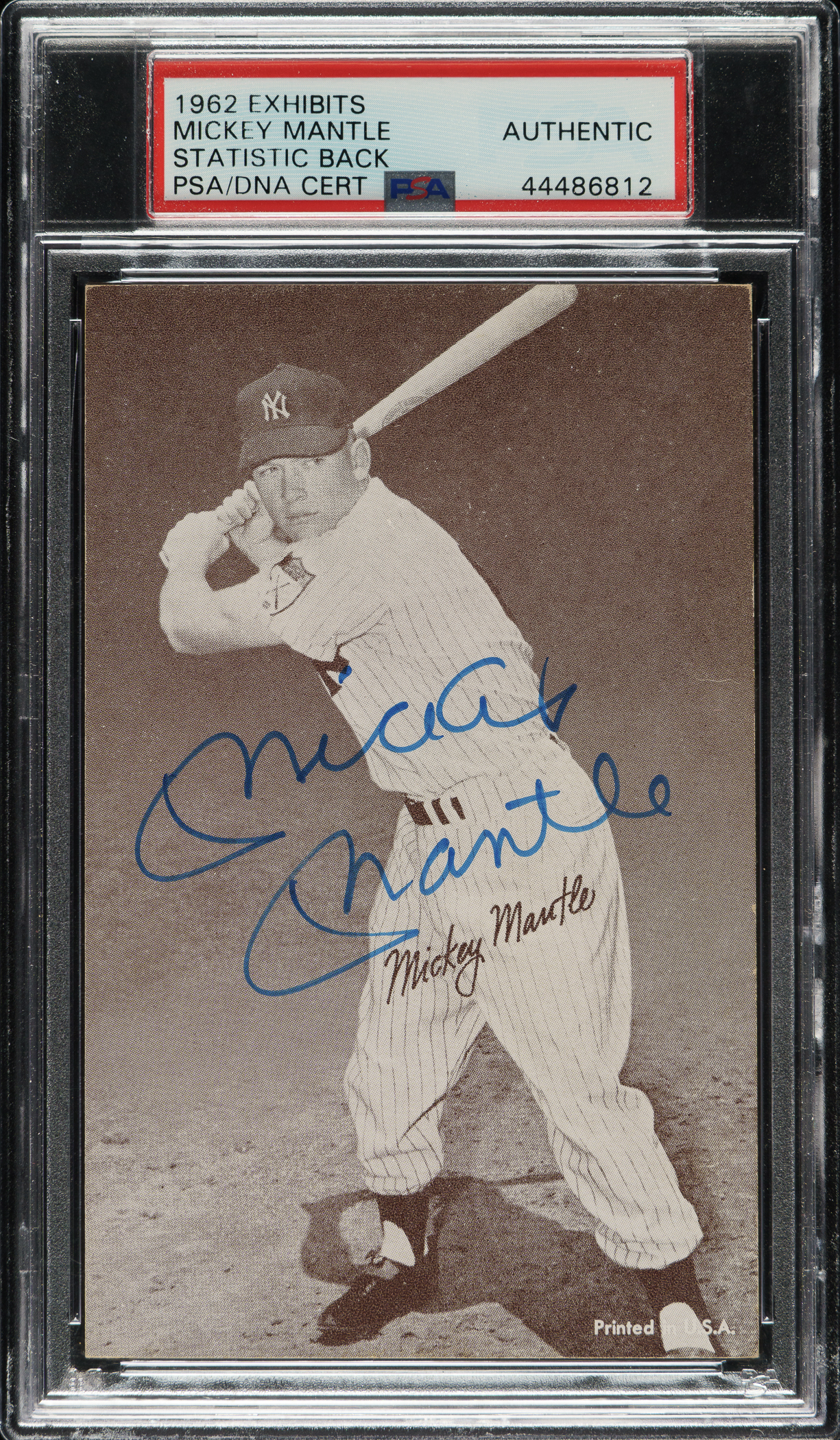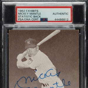 1962 Statistics Back Exhibit Mickey Mantle, signed by Mantle on the front. PSA/DNA has encapsulated the card and certified the signature as "Authentic." Mantle's signature has been boldly scripted in blue fine-point marker. This is one of only three signed examples encapsulated by PSA/DNA. A very attractive signed example of this popular exhibit card.
