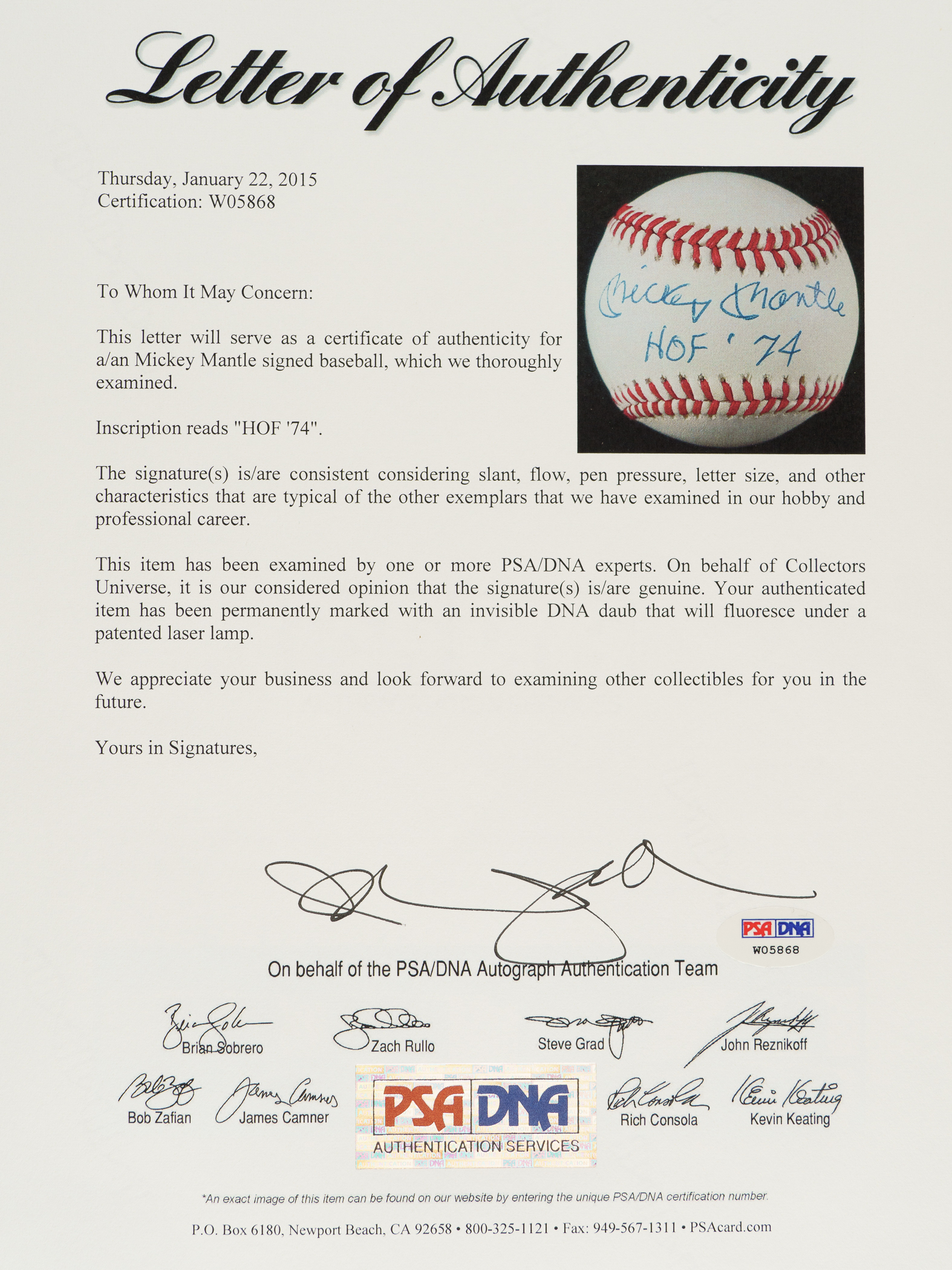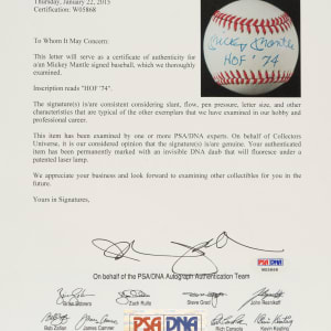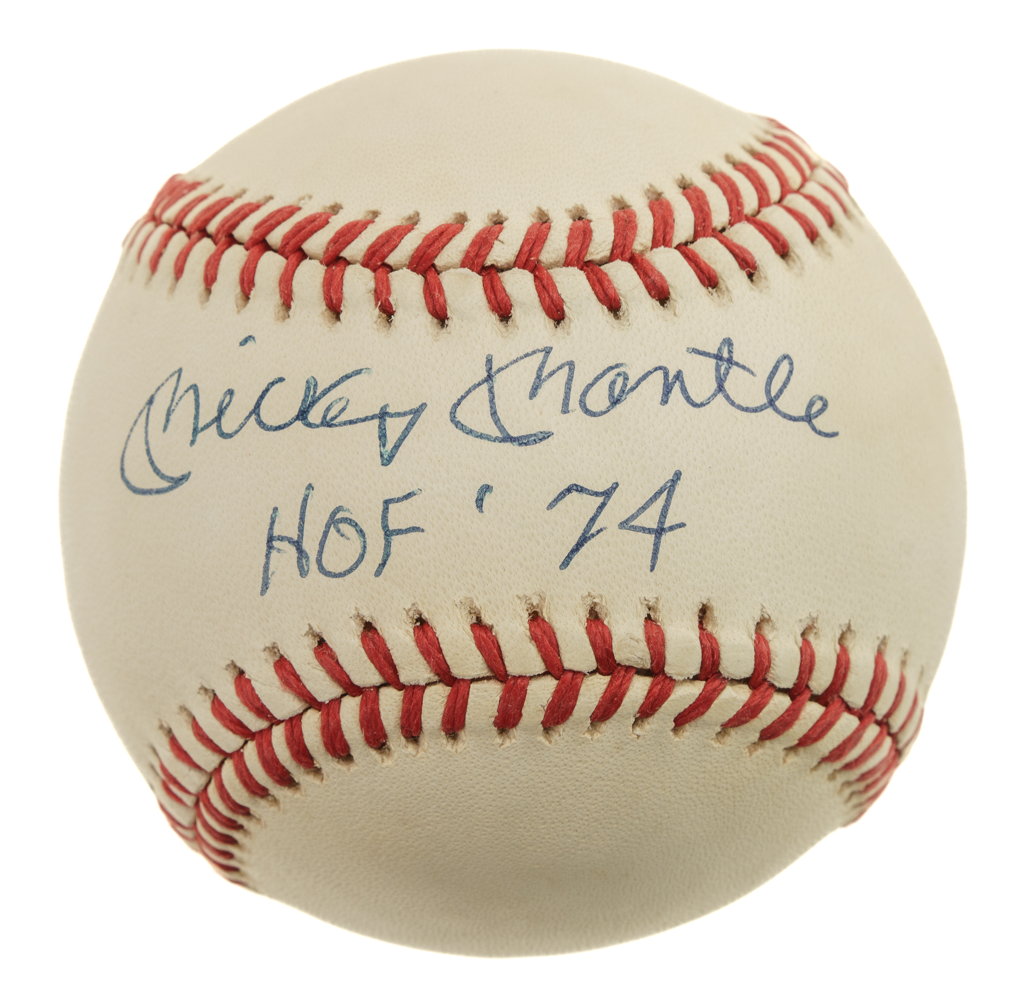 Mickey Mantle single-signed baseball featuring a special "HOF 74" inscription. Mantle has signed the official American League baseball (Brown) in blue ink across the sweet spot and added the notation below his name. Although Mantle signed thousands of baseballs during his years of retirement, those bearing additional notations are the exception rather than the rule. As such, they have always been held in higher regard by most collectors. The ball is very lightly toned throughout but is otherwise in Near Mint condition overall. Full LOA from PSA/DNA.