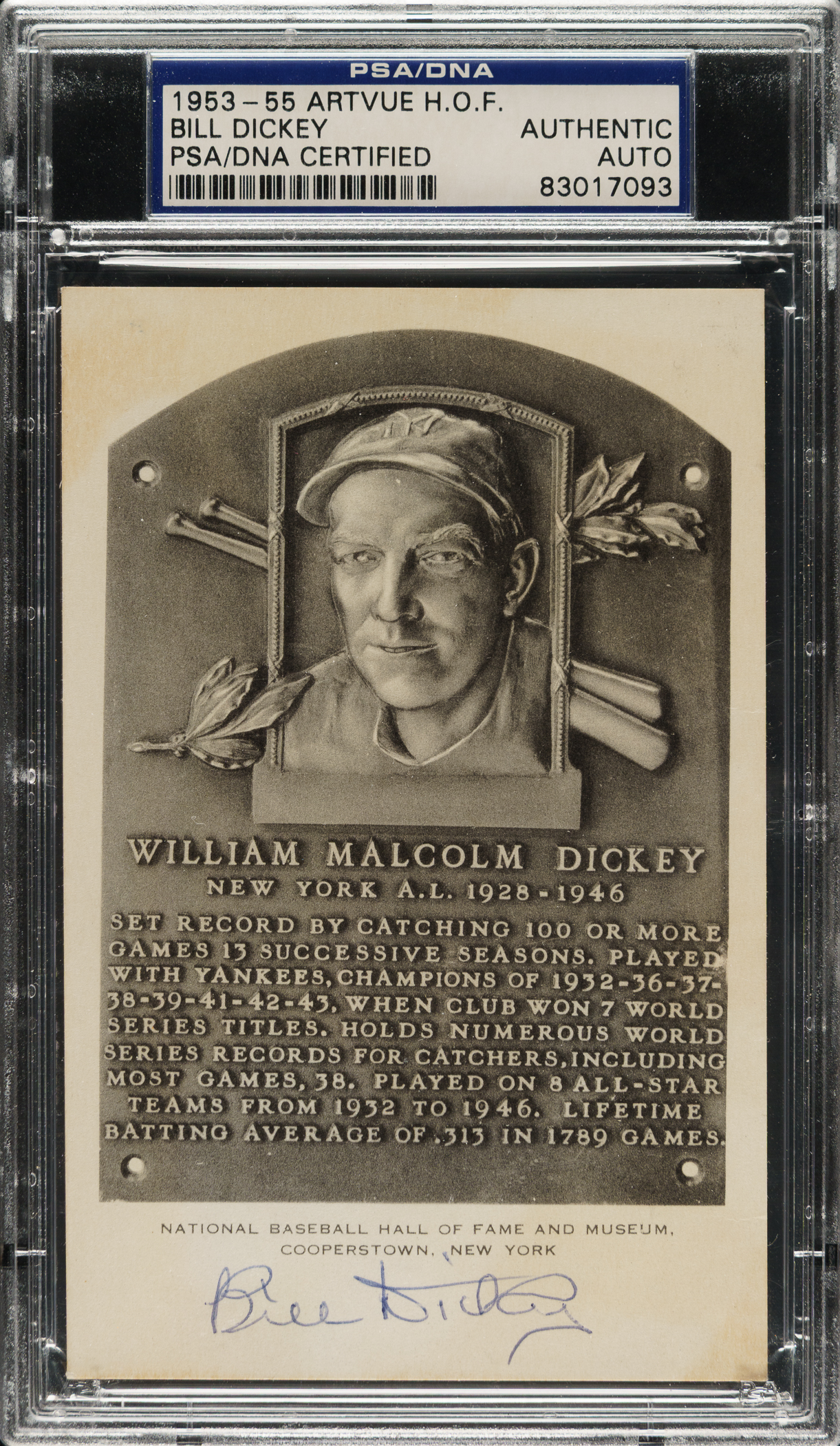 PSA/DNA has encapsulated the postcard, grading the signature Authentic. New York Yankees Hall of Famer Bill Dickey.