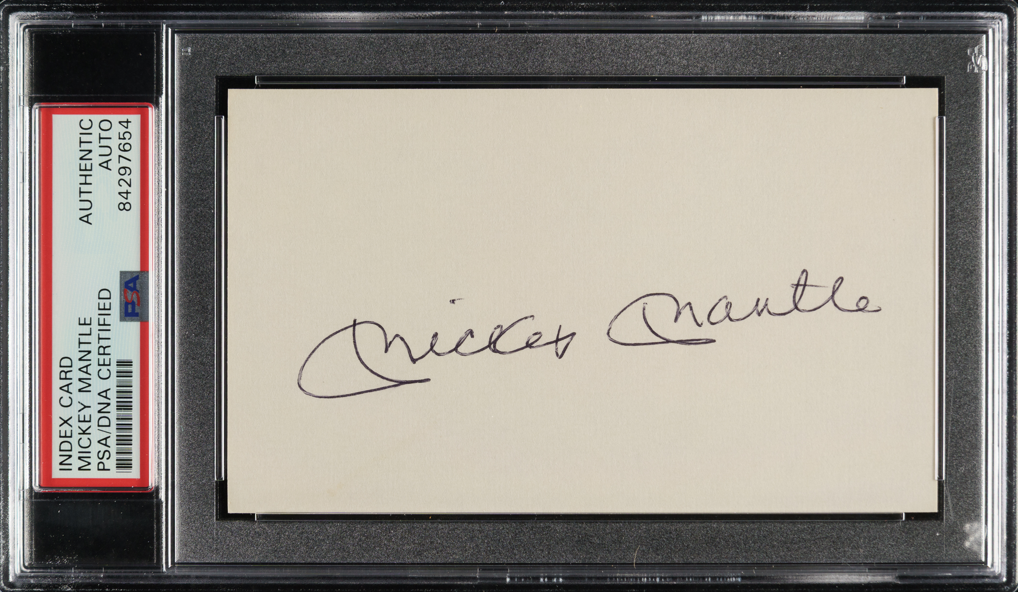 PSA/DNA has encapsulated the index card, grading the signature Authentic. New York Yankees Hall of Famer Mickey Mantle.