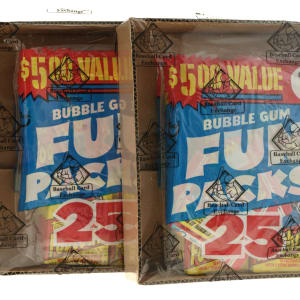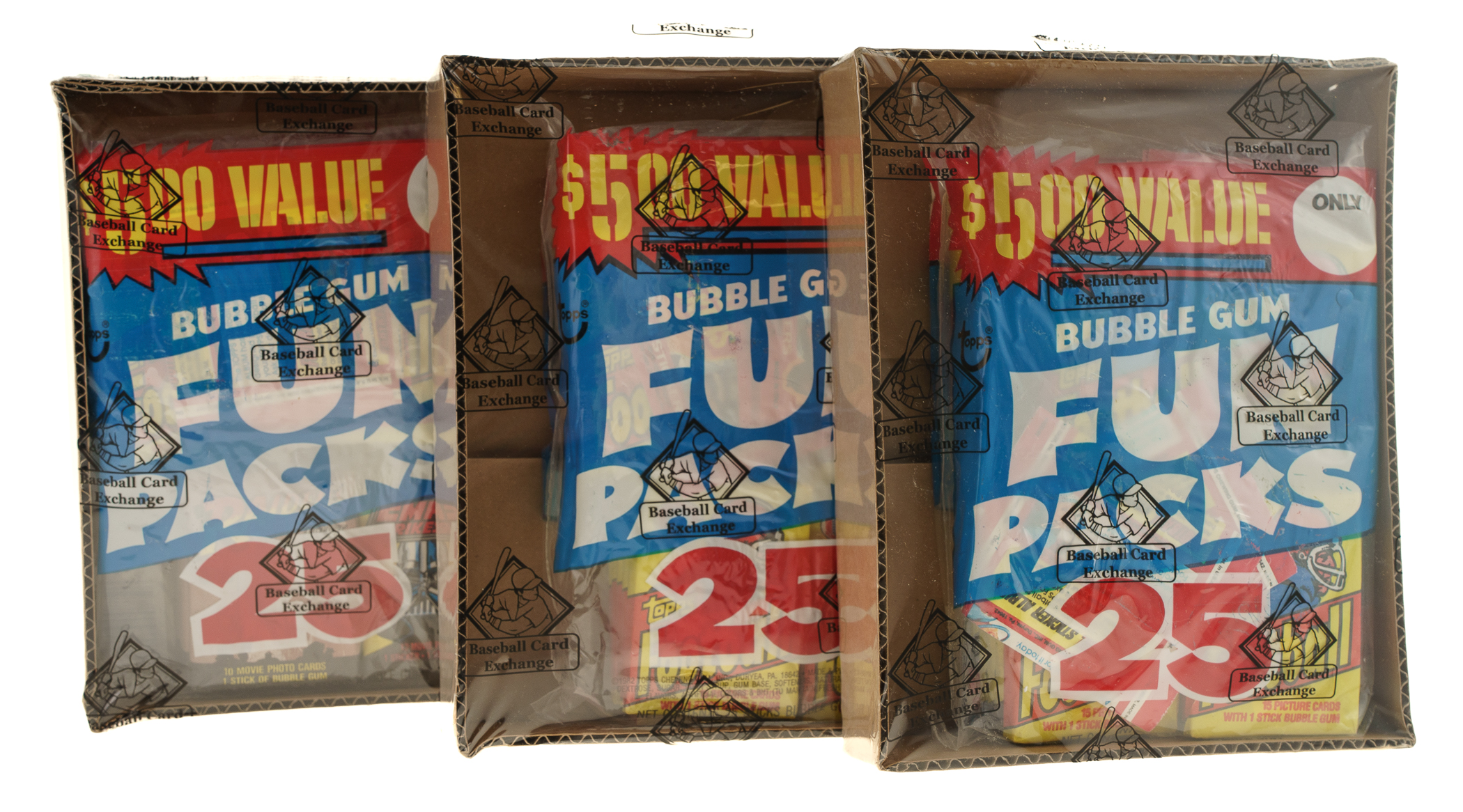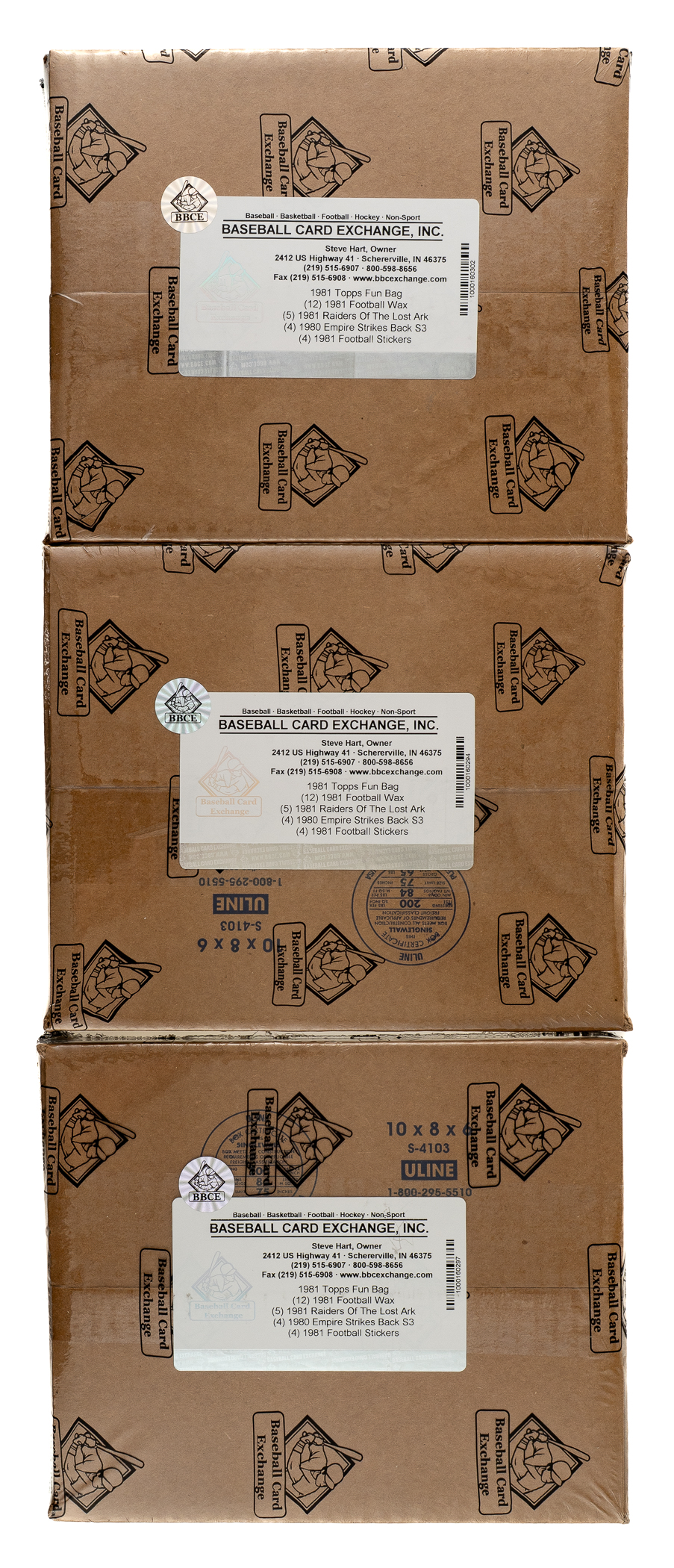 Collection of three 1981 Topps "Fun Packs" sealed bags, each containing 25 packs/stickers from different sport and nonsport issues. Each "fun pack" bag includes twelve 1981 Topps football packs, five 1981 Raiders of the Lost Ark packs, four 1980 Empire Strikes Back (S3) packs, and four 1981 Topps football stickers. Originally retailing for $5 per bag, these "fun packs" offered incredible variety and entertainment for anyone who purchased them. The outer bags show minimal wear and come shrink-wrapped by Baseball Card Exchange (owned by Steve Hart, the foremost expert on unopened material). This is an outstanding collection of 1981 Topps "Fun Packs" bags. Total: 3 bags. The size/weight of this item requires that there will be an additional shipping charge for this lot.