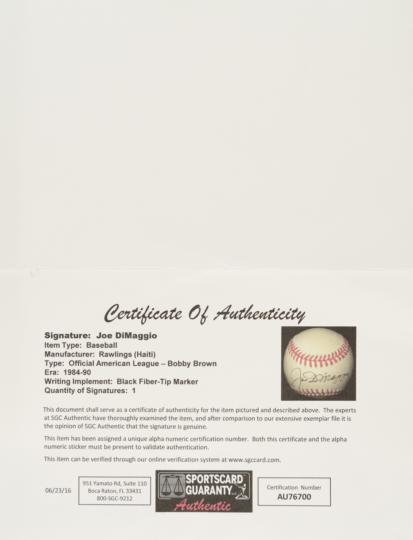 New York Yankees Hall of Famer Joe DiMaggio signed baseball. COA from SGC.