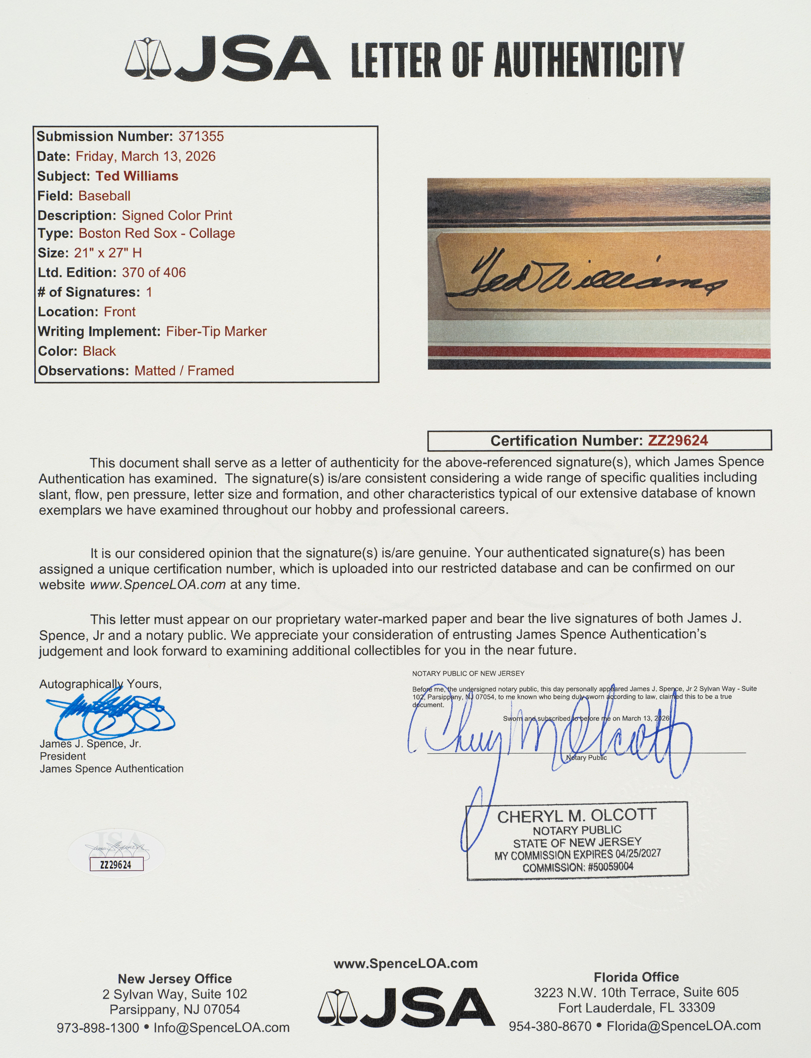 Limited-edition lithograph titled "The Splendid Splinter" signed by Ted Williams in blue marker in the lower left. The piece is hand-numbered "370/406" and signed by the artist Danny Day in the lower right. The lithograph (28 x 22 inches) is in apparent Near Mint condition overall. Matted and framed to total dimensions of 36 x 31 inches. Full LOA from James Spence/JSA. The size/weight of this item requires that there will be an additional shipping charge for this lot.