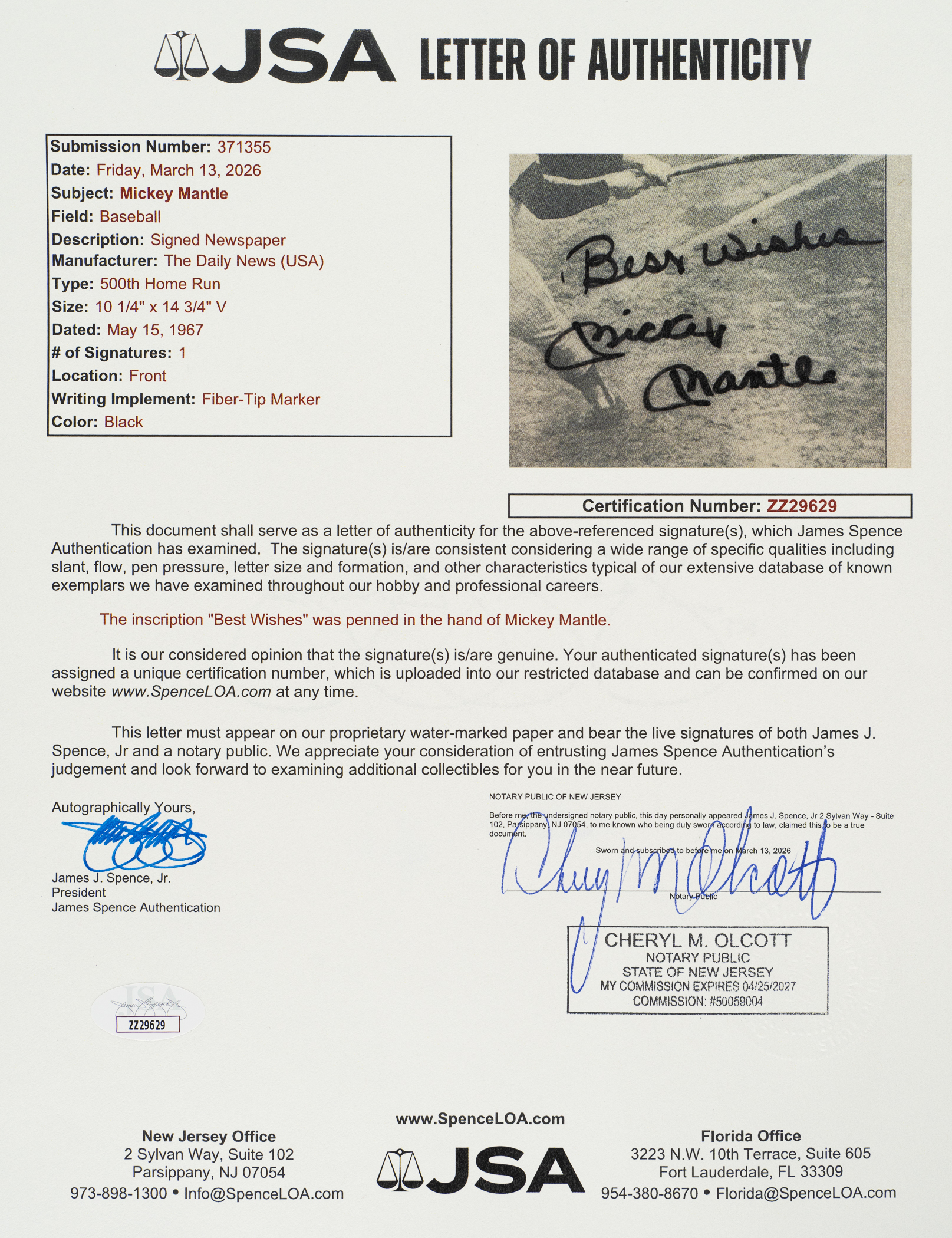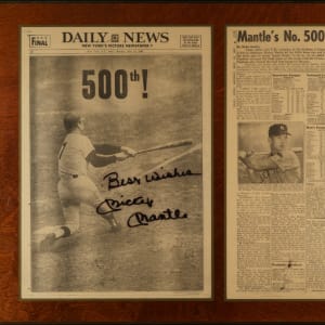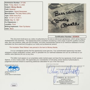 Front page of the May 15, 1967, Daily News newspaper signed in black marker by Mickey Mantle. Mantle has signed the page "Best Wishes/Mickey Mantle" next to his image. The front page is from the morning after Mantle hit his 500th career home run. The page is laminated onto a wood plaque display next to another page from that day's newspaper. Near Mint condition overall. Total dimension: 24.5 x 17.5 inches. Full LOA from James Spence/JSA. The size/weight of this item requires that there will be an additional shipping charge for this lot.