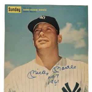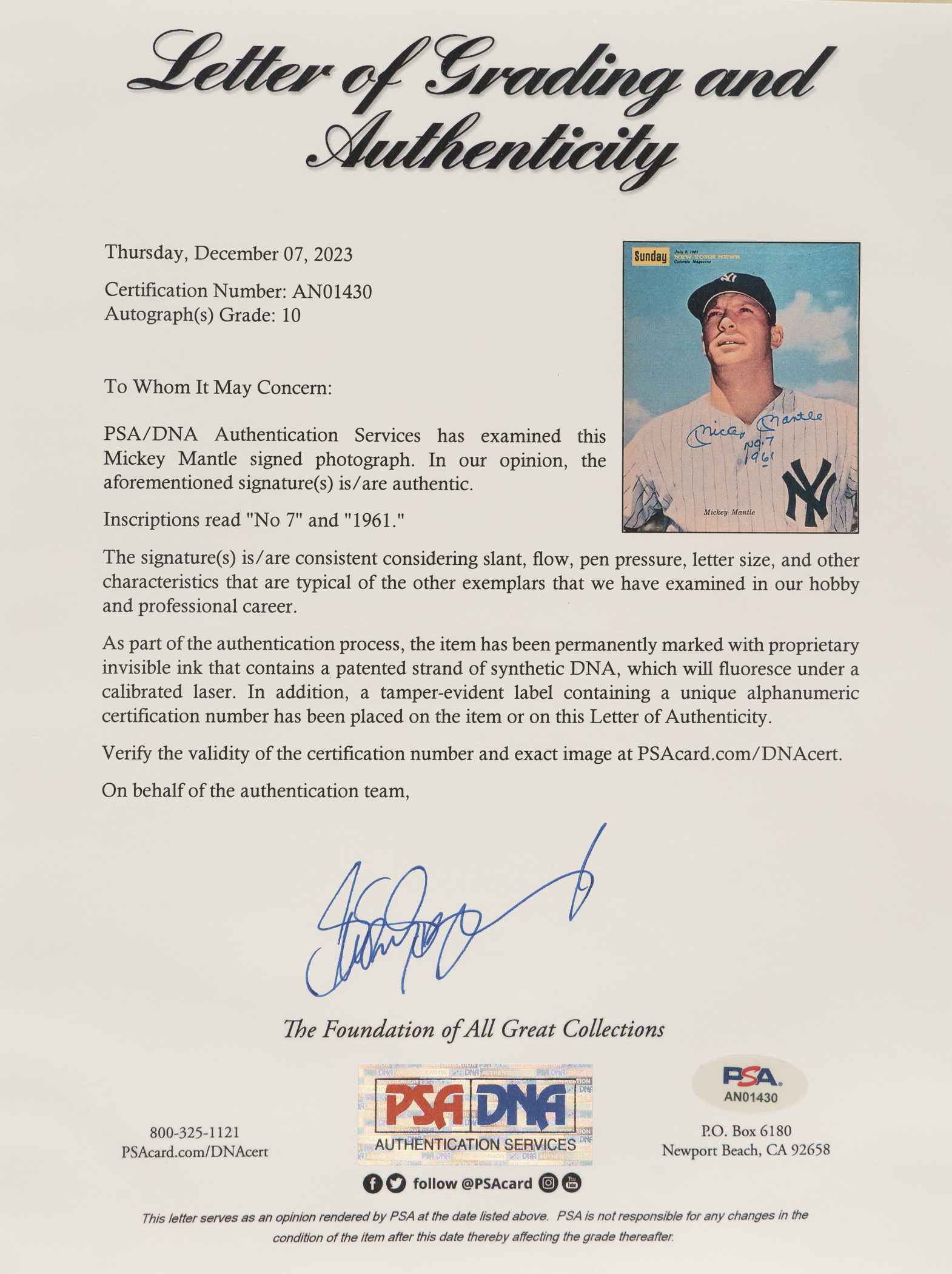 New York Yankees Hall of Famer Mickey Mantle signed magazine cover. Total dimensions: 10.5 x 13 inches. Full LOA from PSA/DNA, who have graded the signature GEM MINT 10.