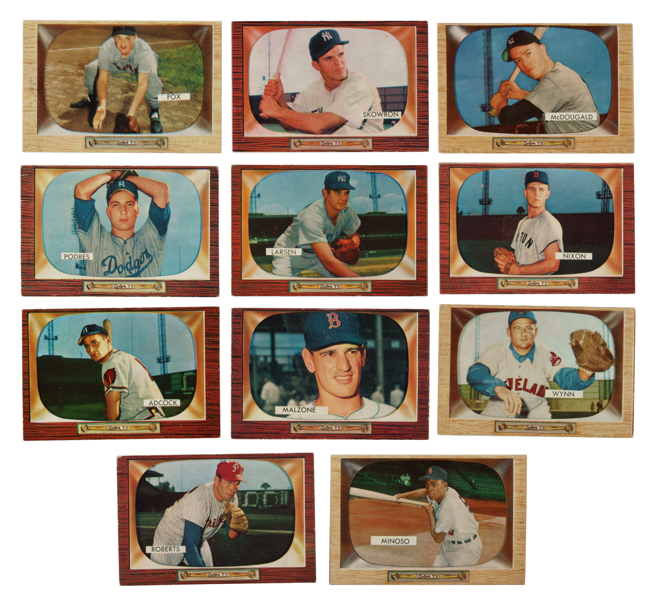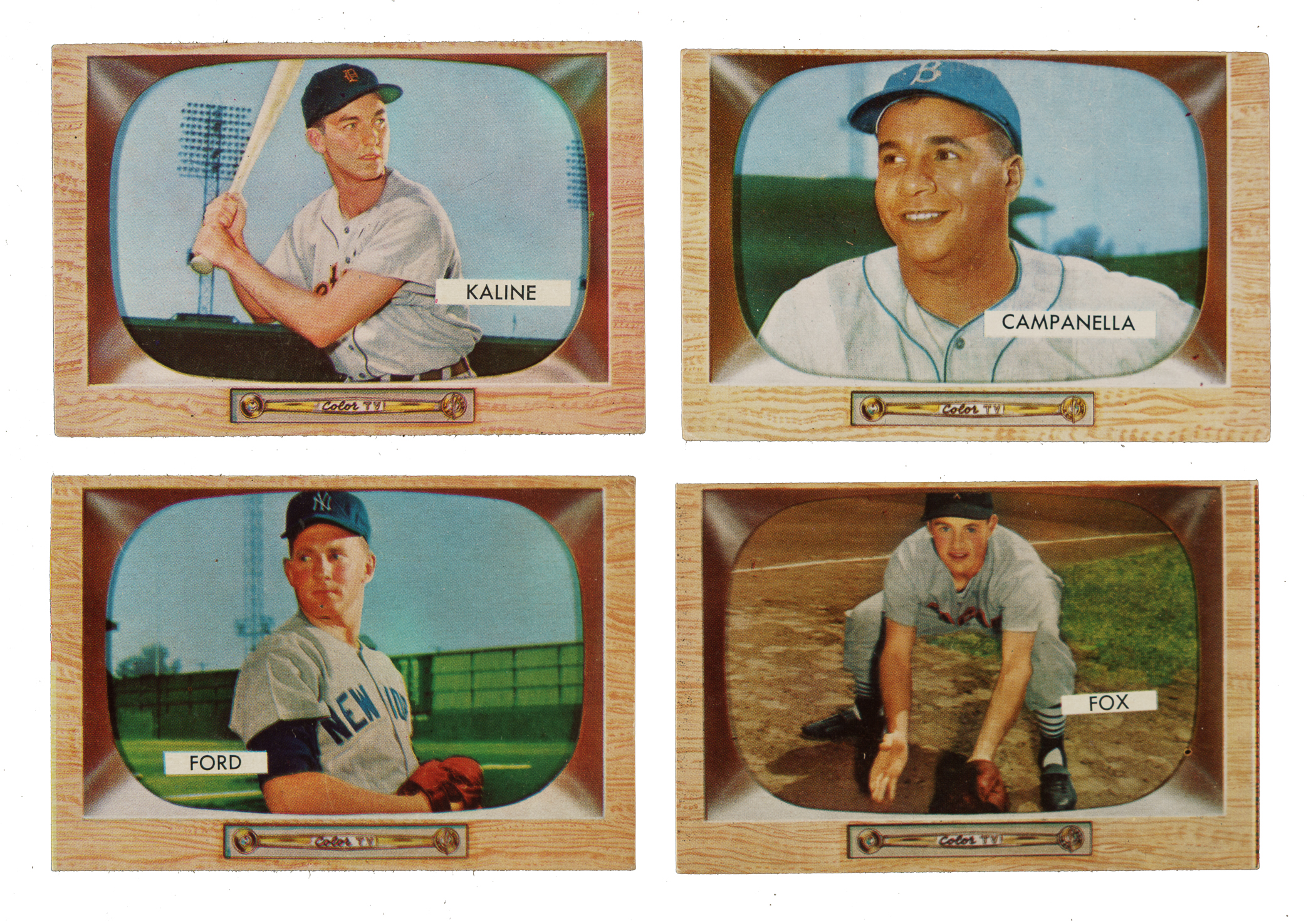 Presented is a collection of fifteen 1955 Bowman baseball cards highlighted by Kaline, Ford, and Campanella. Condition ranges from Vg to Ex (averaging Vg-Ex). This collection consists of the following: #9, 22 Campanella (Gd), 23 Kaline (Vg-Ex), 25 Minoso (Ex), two 33 Fox (Ex and Vg-Ex), 38 Wynn (Vg), 59 Ford (Vg), 67 Larsen (Vg-Ex), 97 Podres, 160 Skowron, 171 Roberts (Vg), 177, 218, and 302. Total: 15 cards.