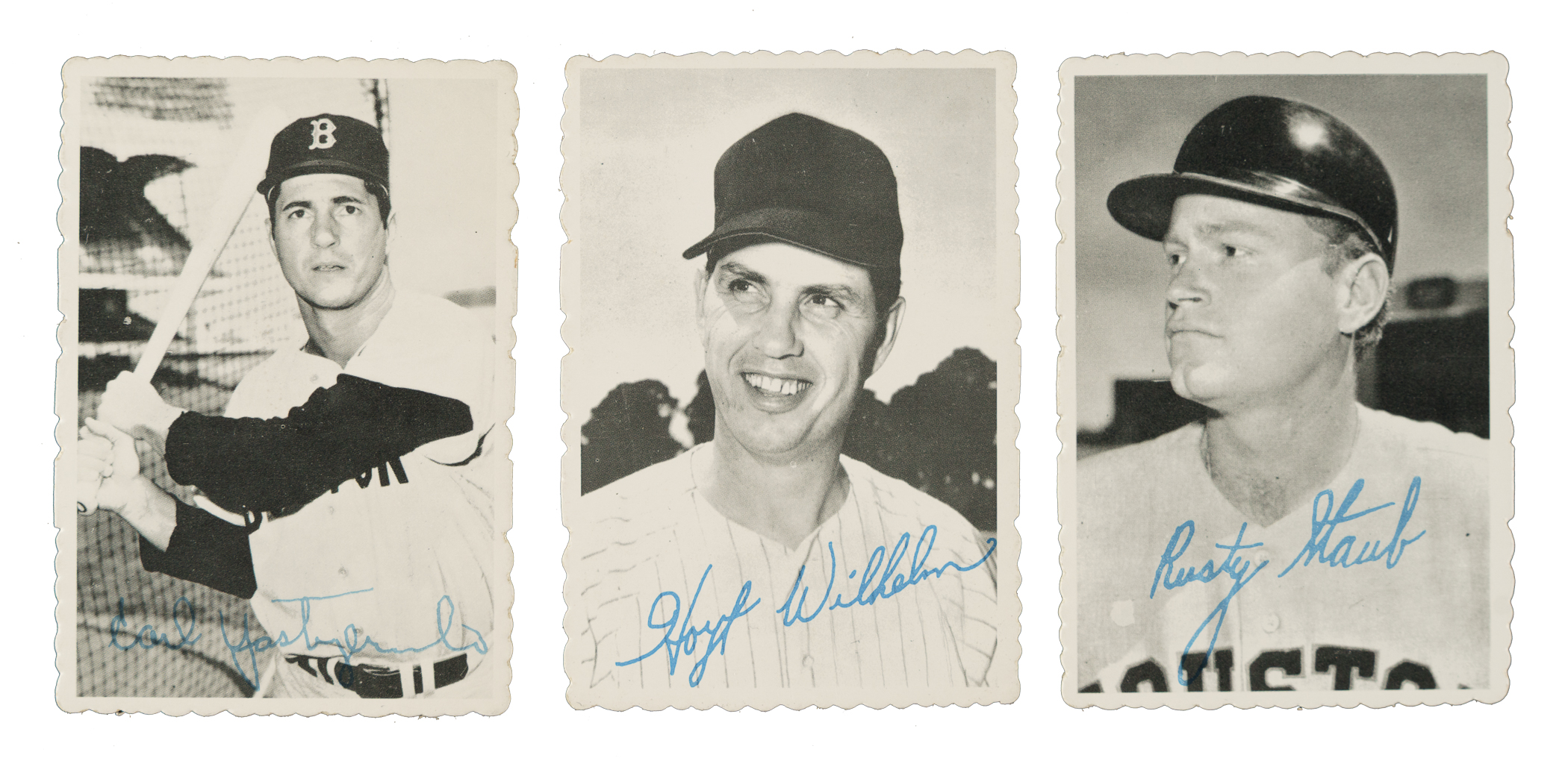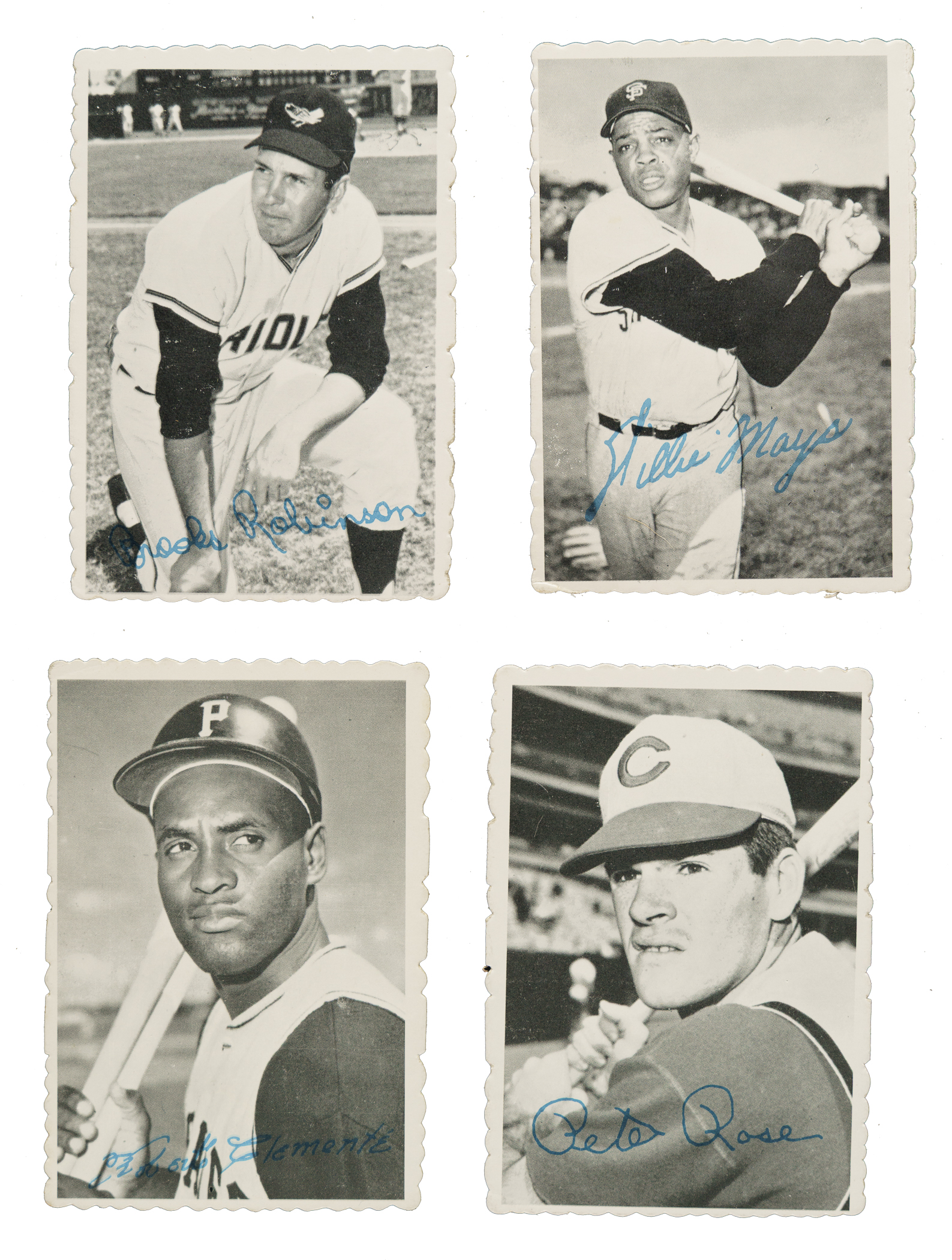 Complete 33-card set of 1969 Topps Deckle Edge baseball cards. Condition ranges from Vg to Ex (averaging Vg-Ex), with a couple slightly higher and lower. Keys: #1 B. Robinson (Vg-Ex), 4 Yastrzemski (Vg-Ex+), 11a Wilhelm (Vg+), 11b Wynn (), 21 Rose (Vg-Ex), 22a Staub (Vg-Ex), 27 Clemente (Vg-Ex), and 33 Mays (Vg+). Total: 33 cards.