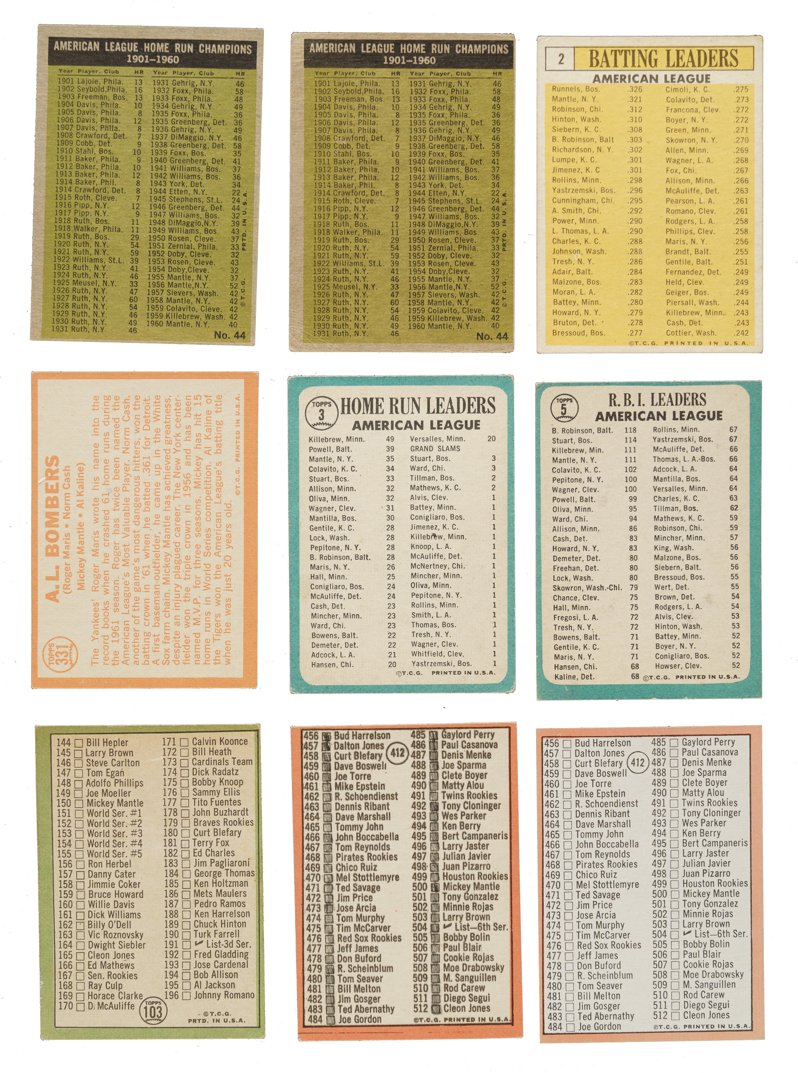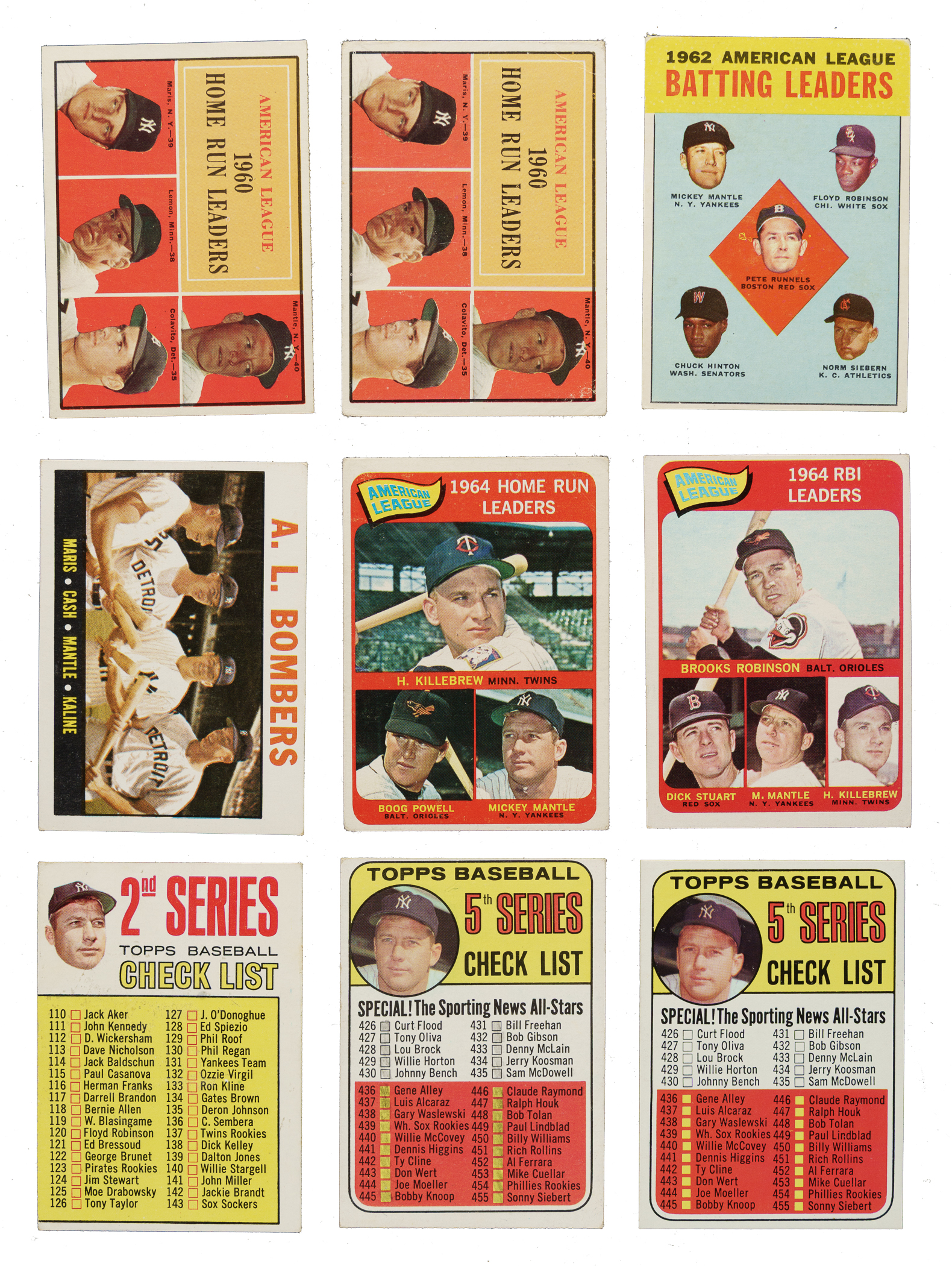 Presented is a collection of nine Mickey Mantle Topps baseball cards from 1961 to 1969. This collection consists of the following: 1) 1961 Topps (2 cards): Two #44 AL HR Ldrs (Ex and Vg). 2) 1963 Topps (1 card): #2 AL Batting Ldrs (Vg+). 3) 1964 Topps (1 card): #331 AL Bombers (Vg-Ex+). 4) 1965 Topps (2 cards): #3 AL HR Ldrs (Vg) and 5 AL RBI Ldrs (Vg-Ex). 5) 1967 Topps (1 card): #103 Checklist - Mantle (0/100 L/R, otherwise Vg). 6) 1969 Topps (2 cards): Two #412 Checklist - Mantle (Nr/Mt and completely marked in pencil otherwise Vg). Total: 9 cards.