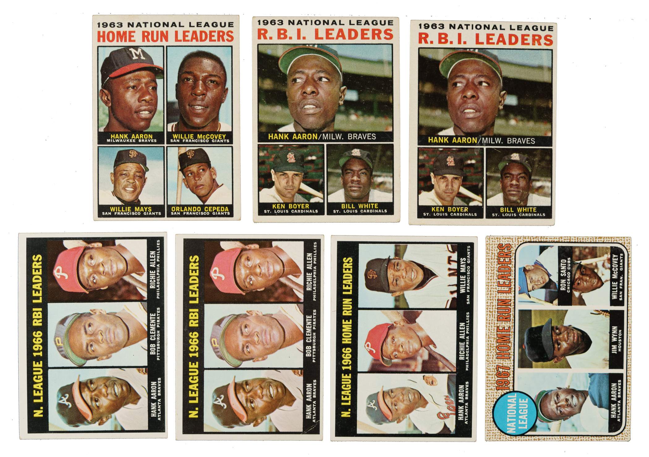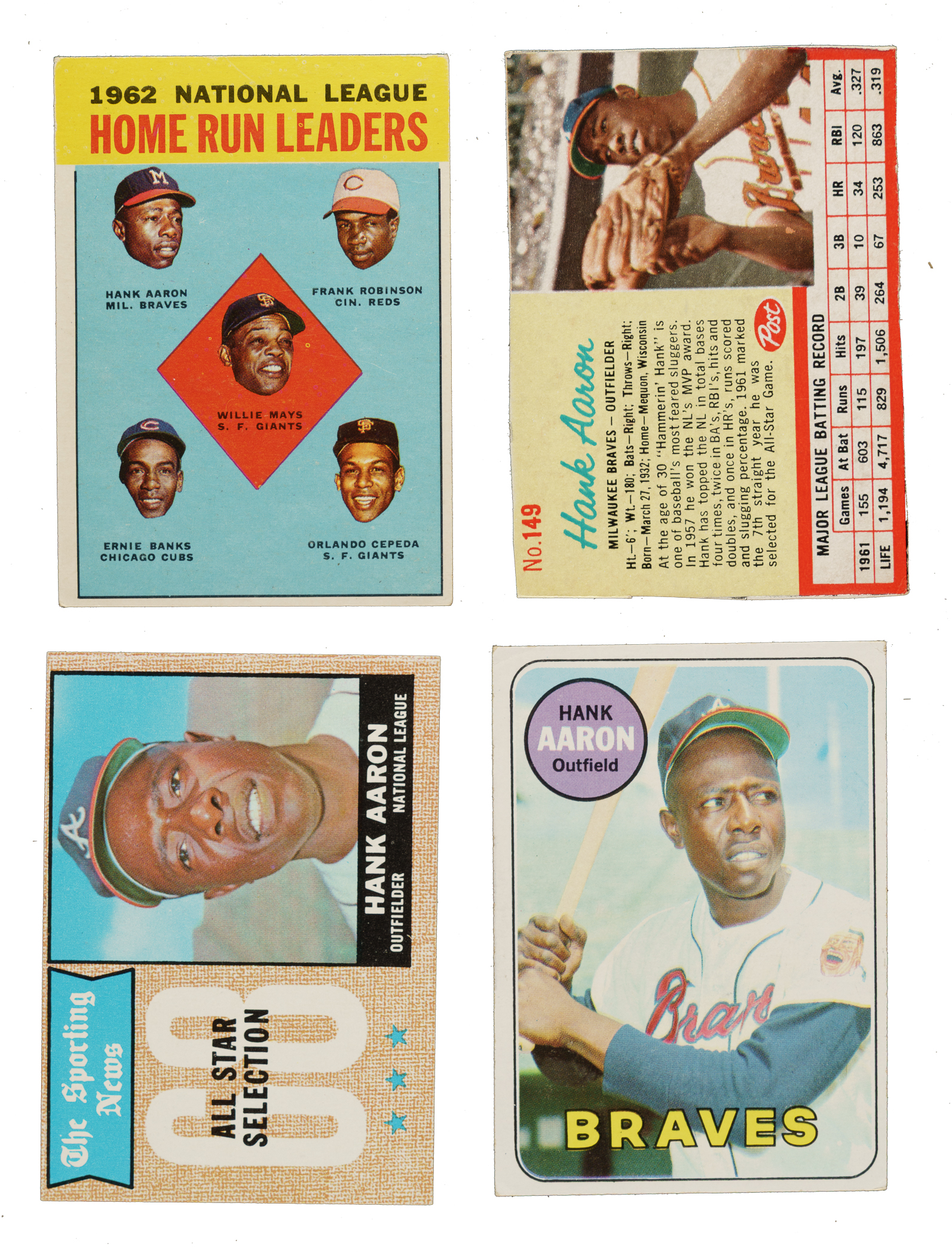 Presented is a collection of eleven 1962 to 1969 Topps and Post Cereal Hank Aaron baseball cards. This collection consists of the following: 1) 1962 Post (1 card): #149 (hand cut inside borders, otherwise Vg). 2) 1963 Topps (1 card): #3 NL HR Ldrs (ink on reverse, otherwise Vg+). 3) 1964 Topps (3 cards): #9 NL HR Ldrs (Vg-Ex) and two 11 NL RBI Ldrs (Vg+ and Vg). 4) 1967 Topps (3 cards): Two #242 NL RBI Ldrs (Vg-Ex and Vg) and 244 NL HR Ldrs (Vg-Ex). 5) 1968 Topps (2 cards): #5 NL HR Ldrs (Vg-Ex) and 370 Aaron AS (Ex). 6) 1969 Topps (1 card): #100 (Vg). Total: 11 cards.