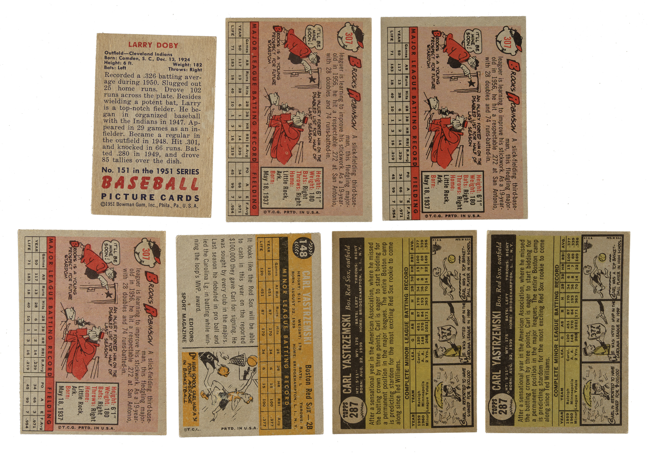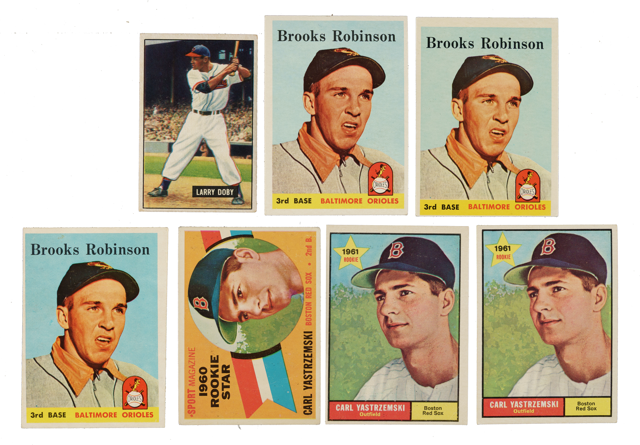 Presented is a collection of seven 1951 to 1961 Topps and Bowman Hall of Famers including Carl Yastrzemski rookie card. This collection consists of the following: 1) 1951 Bowman (1 card): #151 Doby (Vg-Ex). 2) 1958 Topps (3 cards): Three #307 B. Robinson (Ex+, Vg (due to centering), and miscut [otherwise Vg-Ex]). 3) 1960 Topps (1 card): #148 Yastrzemski RC (Gd). 4) 1961 Topps (2 cards): Two #287 Yastrzemski (Vg-Ex and Vg). Total: 7 cards.