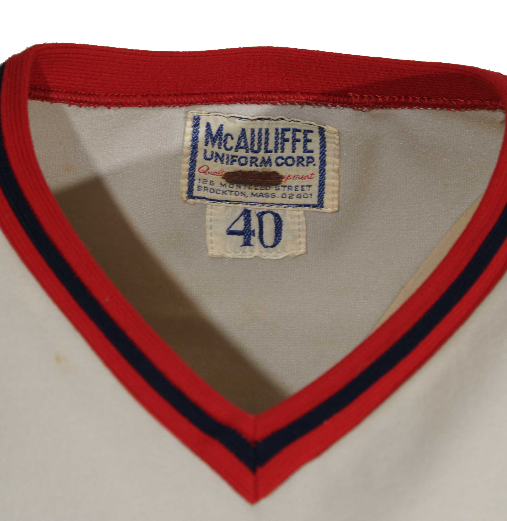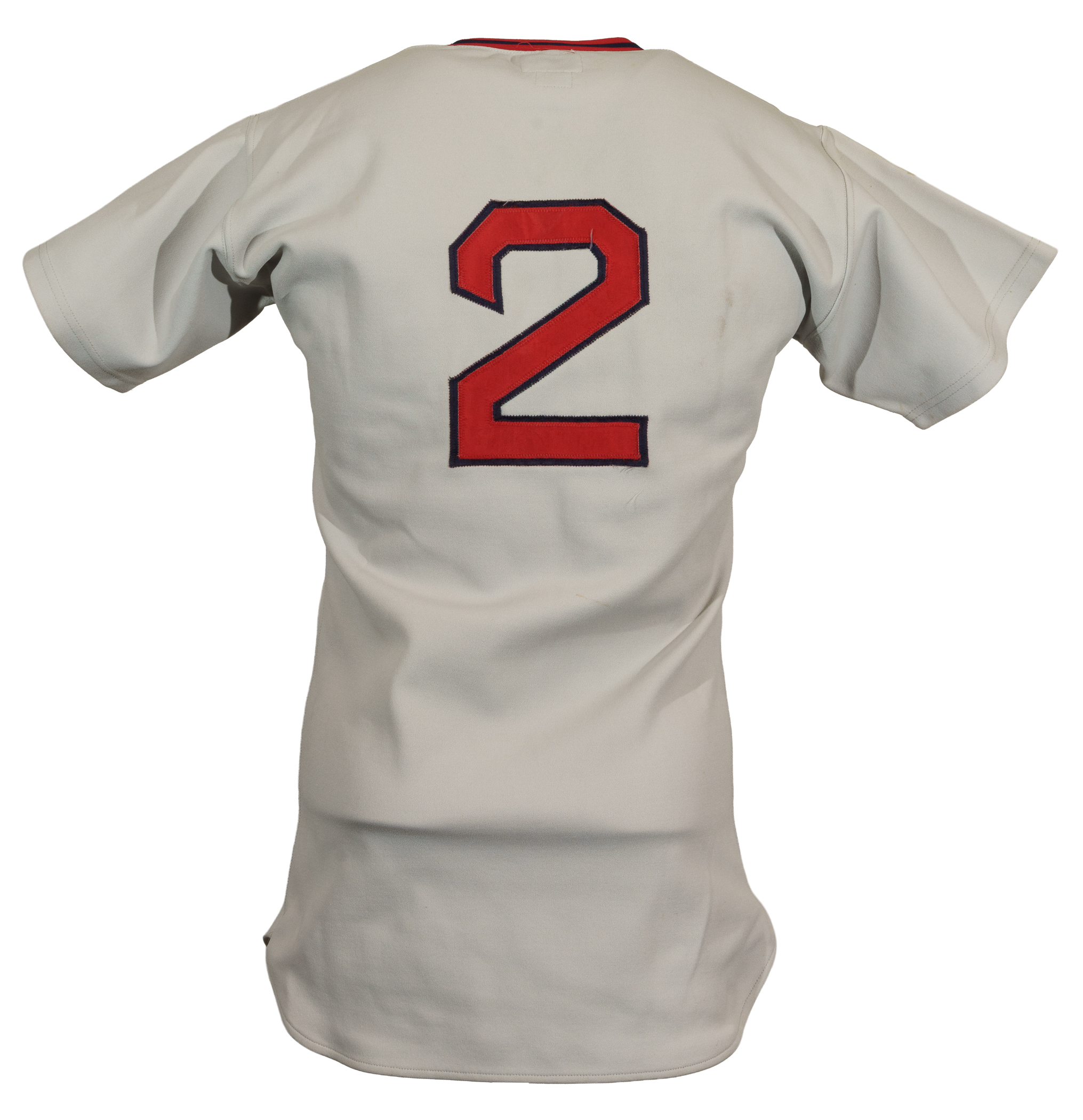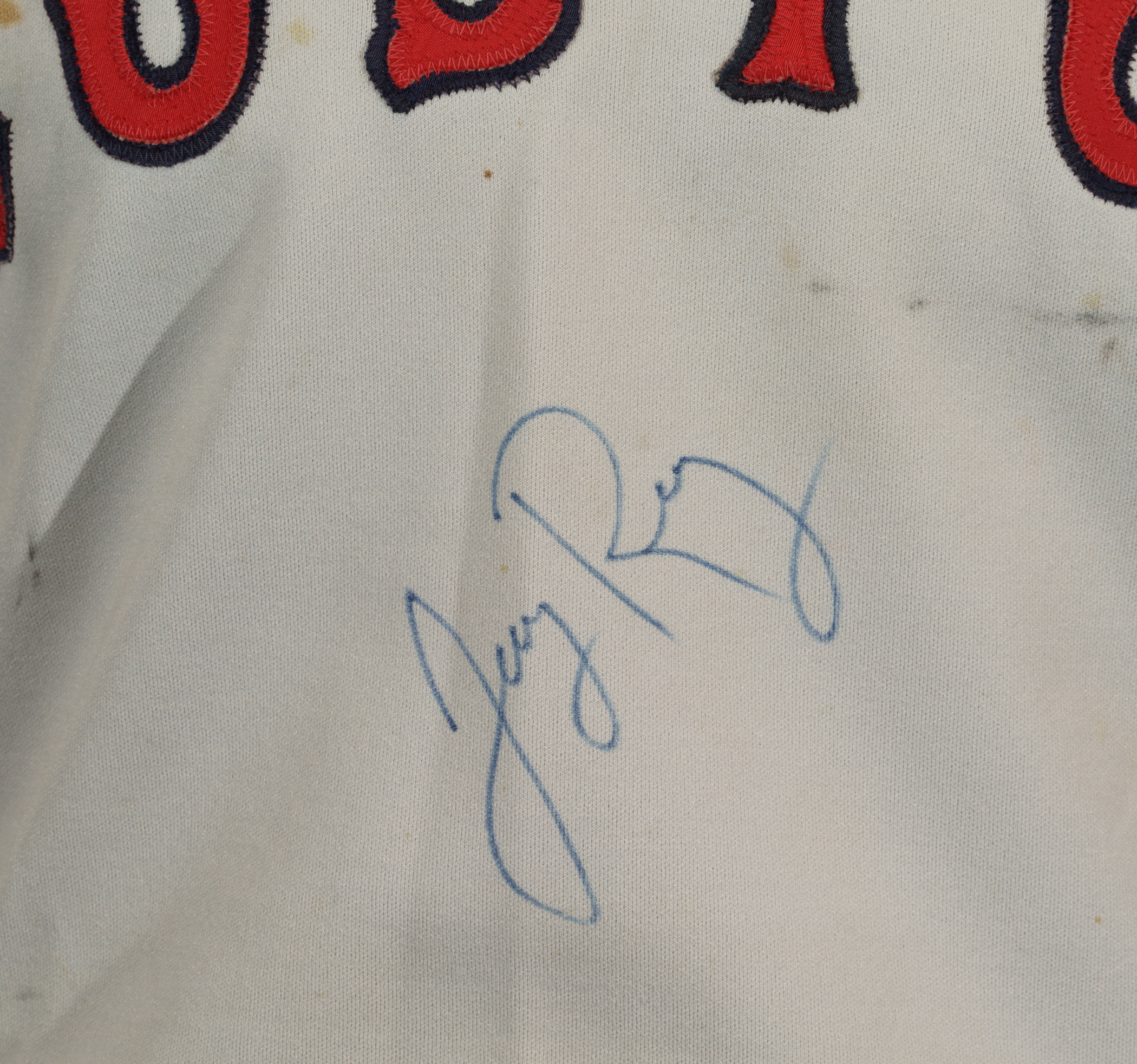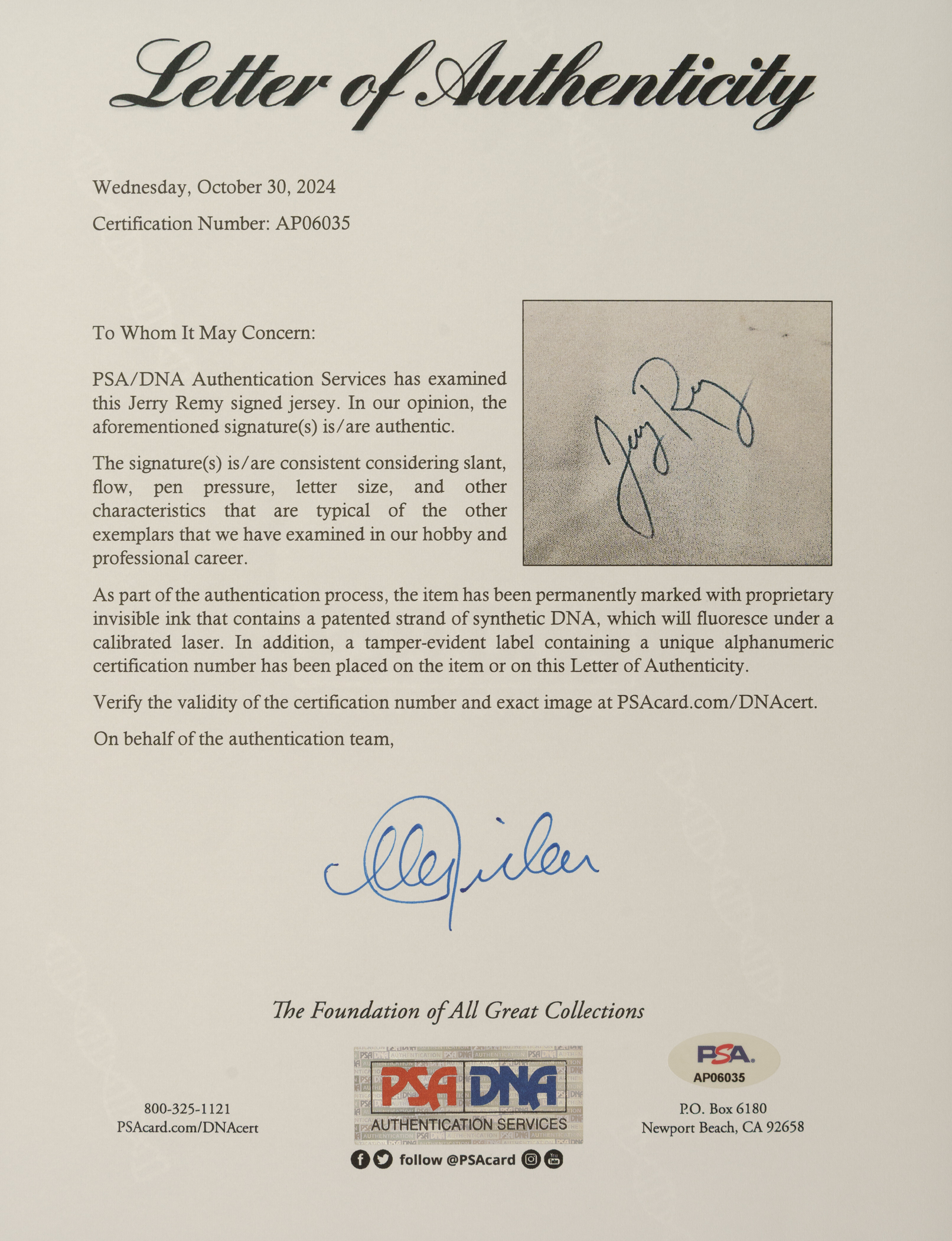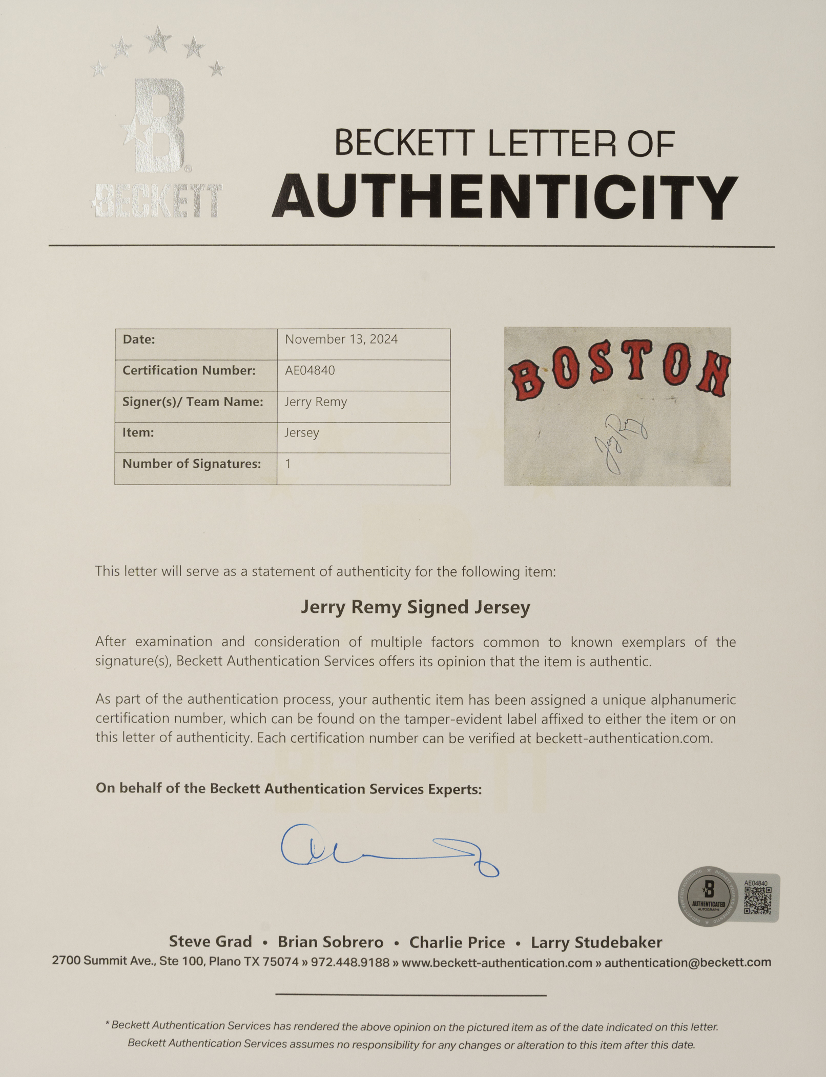 Boston Red Sox road jersey, most notably worn by Jerry Remy during the 1978 season. The gray knit road jersey is lettered "Boston" on the front and features the number "2" on the reverse. All letters and numerals are appliquéd in red on blue tackle twill. Both a "McAuliffe" label and a "40" size tag appear in the collar. Remy has signed the jersey in blue marker on the front. The jersey exhibits heavy wear, with scattered staining visible throughout. Please note that the jersey is missing the year and laundry tags along the exterior front tail. The jersey also appears to have extra length. While Doug Griffin briefly wore this jersey during the 1977 campaign (he was released June 21 that season), it wasn't until it was reissued to Remy for the following season that this jersey gained its significance. In 1978, his first year with the Red Sox, Remy hit .278 with 30 stolen bases, earning an All-Star selection while anchoring second base in Boston's memorable pennant race. Following a successful 10-year Major League career with the California Angels and Red Sox, Remy transitioned seamlessly into the broadcast booth. He went on to become a beloved NESN color commentator, calling Red Sox games for 33 years until his passing. Full LOA from PSA/DNA and Full LOA from Steve Grad and Brian Sobrero/Beckett Authentication Services.