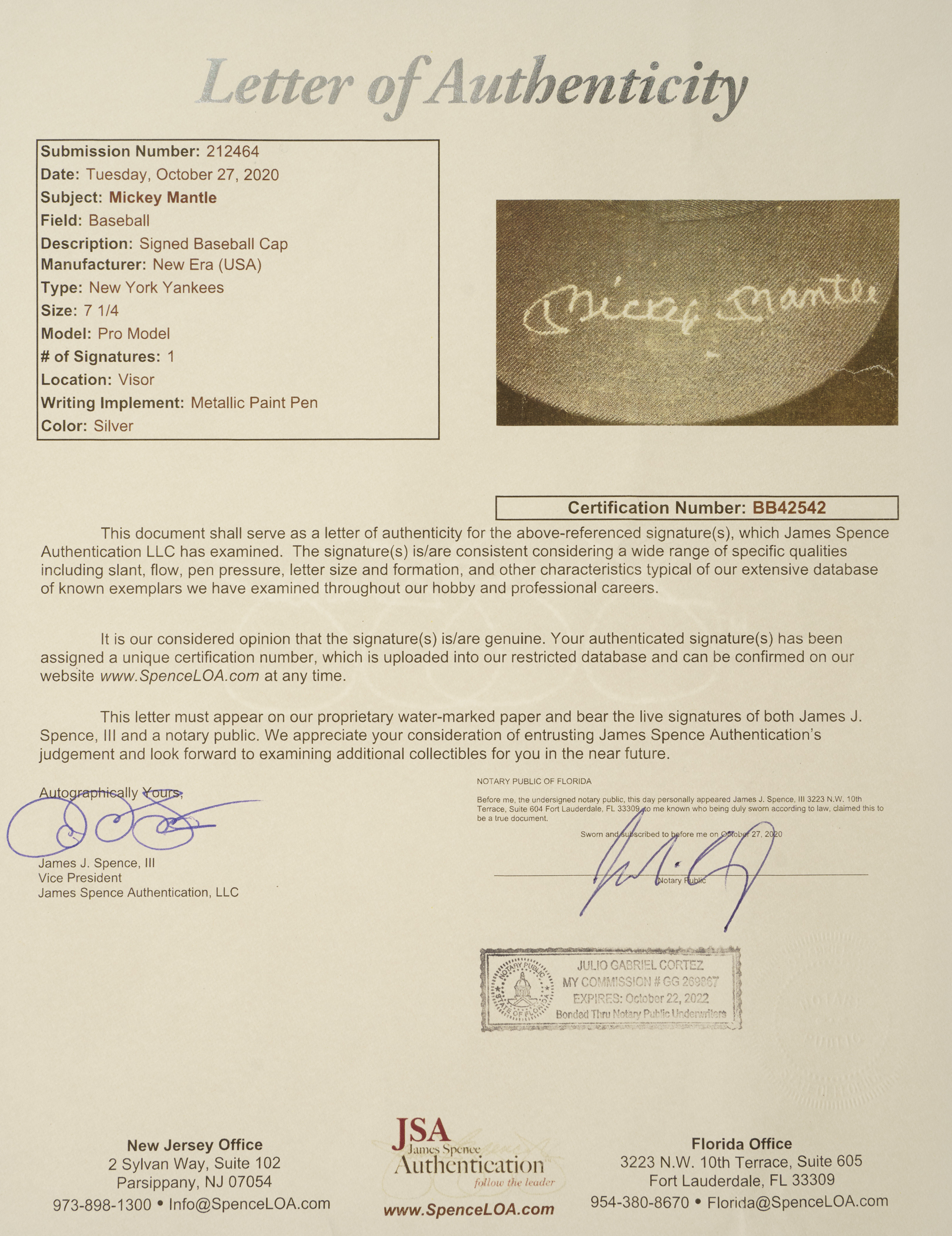 New York Yankees Hall of Famer Mickey Mantle signed cap. Full LOA from James Spence/JSA. The size/weight of this item requires that there will be an additional shipping charge for this lot.