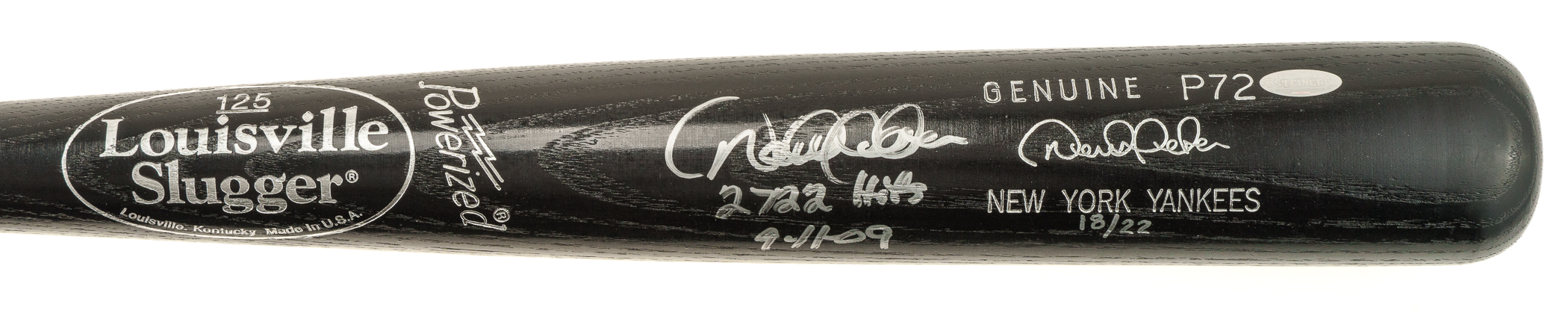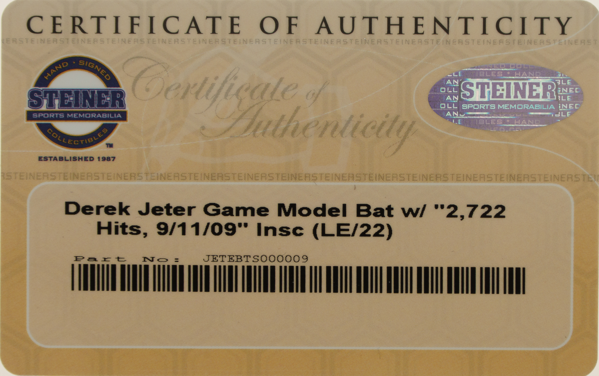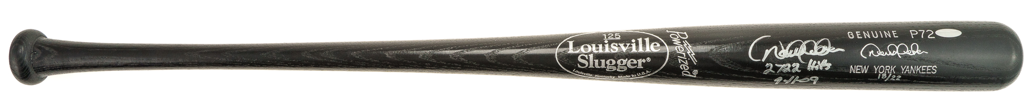 Limited-edition Derek Jeter signature-model Louisville Slugger bat signed by him in silver paint pen along the barrel. He has added the inscriptions "2722 Hits" and "9-11-'09" below his signature. A handwritten "18/22" limitation number appears below the barrel stamping. The bat (33 inches) is in Near Mint condition overall. MLB and Steiner certification stickers are affixed to the bat. The size/weight of this item requires that there will be an additional shipping charge for this lot.