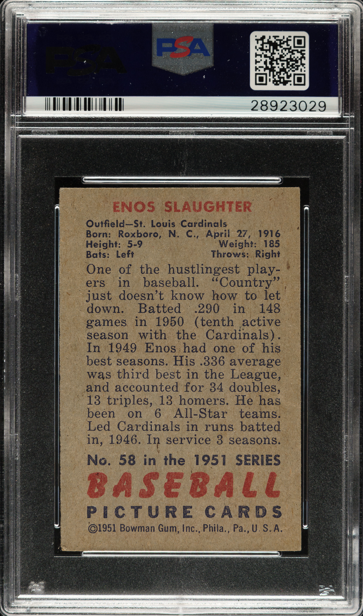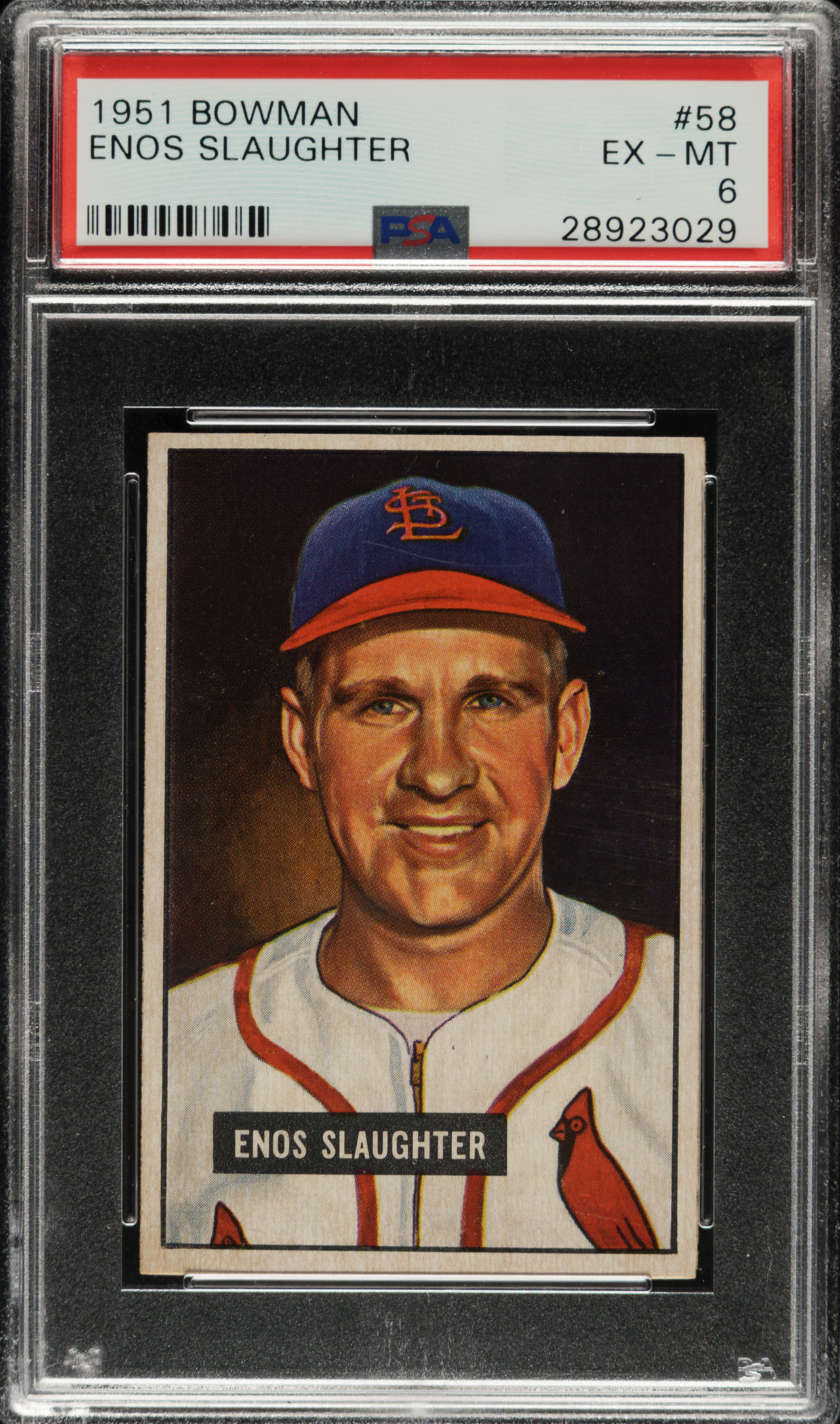Lot # 1396: 1951 Bowman #58 Enos Slaughter PSA EX-MT 6