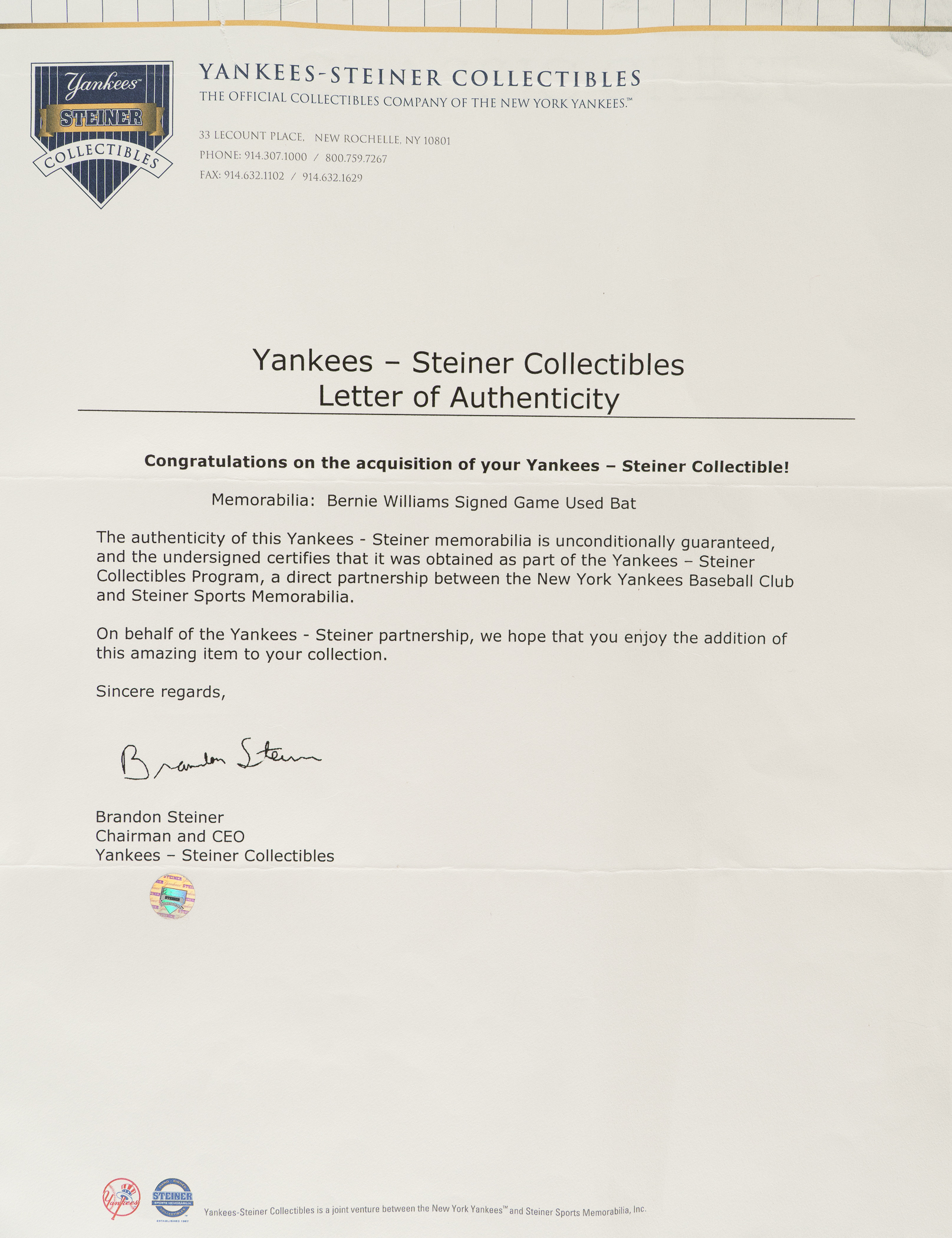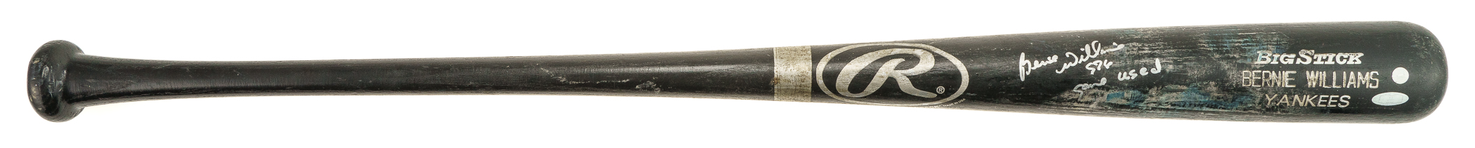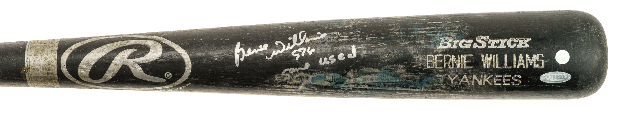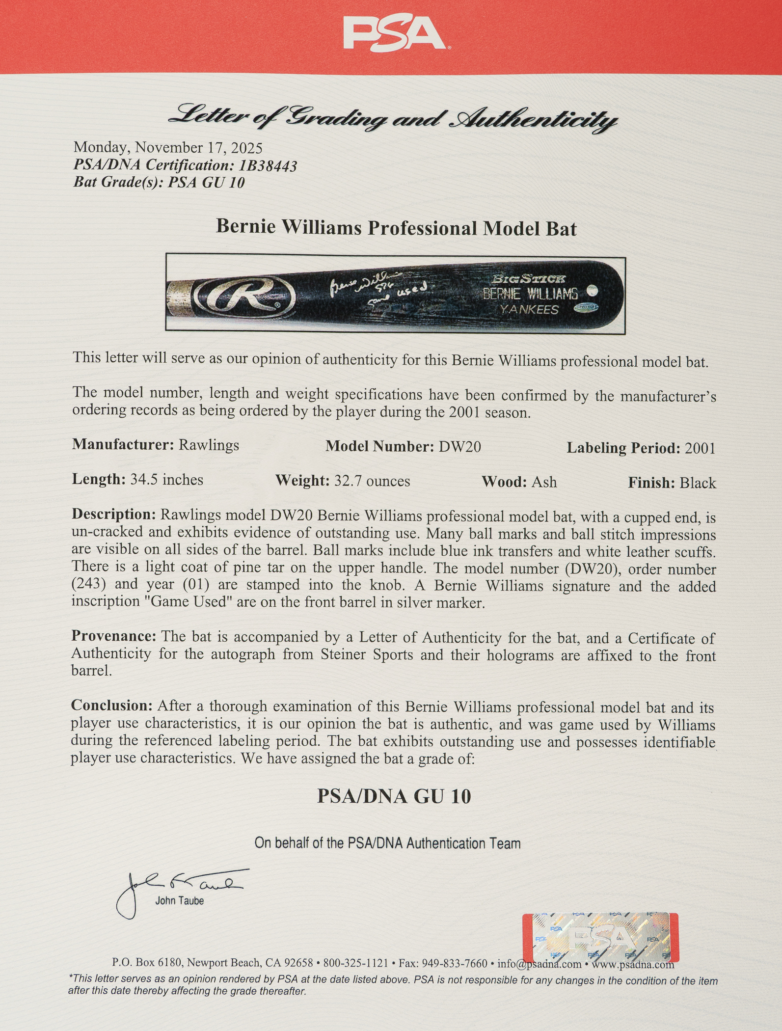 Bernie Williams Rawlings signature-model ("DW20") bat dating from the 2001 season. Graded GU 10 by PSA/DNA. The cupped-end bat, which is not cracked, displays evidence of outstanding use, including ball marks and ball stitch impressions (including blue ink transfers and white-leather scuffs). The model number ("DW20"), order number ("233"), and year ("01") are stamped on the knob. Williams has signed the barrel in "Bernie Williams/Game Used" in silver marker. Williams became the Yankees' everyday center fielder in 1993 and quickly established himself as one of the premier players at the position. In addition to helping lead the Yankees to four World Championships, Williams appeared in five All-Star Games and won four Gold Glove Awards. In 2015, the Yankees honored Williams by retiring his uniform number (No. 51) and dedicating a plaque to him in Monument Park. Length: 34.5 inches. Weight: 32.7 ounces. Full LOAs from PSA/DNA and Steiner Sports (corresponding stickers affixed to the handle and barrel). Auction LOA from James Spence/JSA. The size/weight of this item requires that there will be an additional shipping charge for this lot.