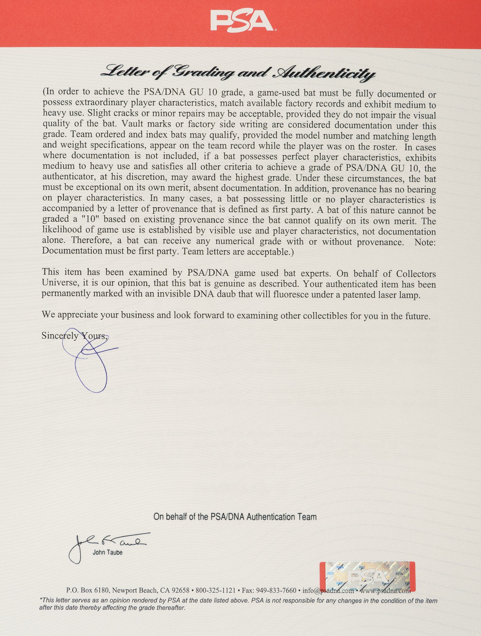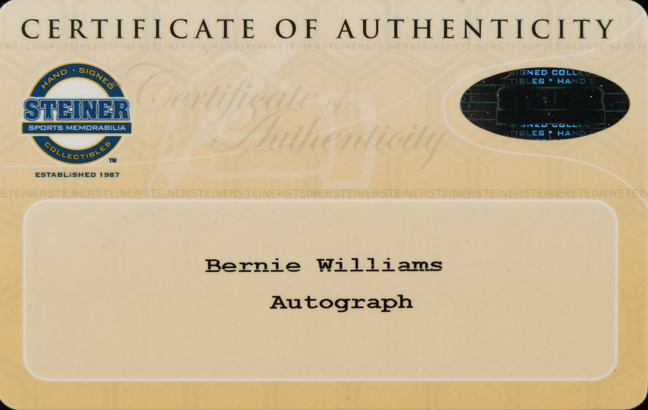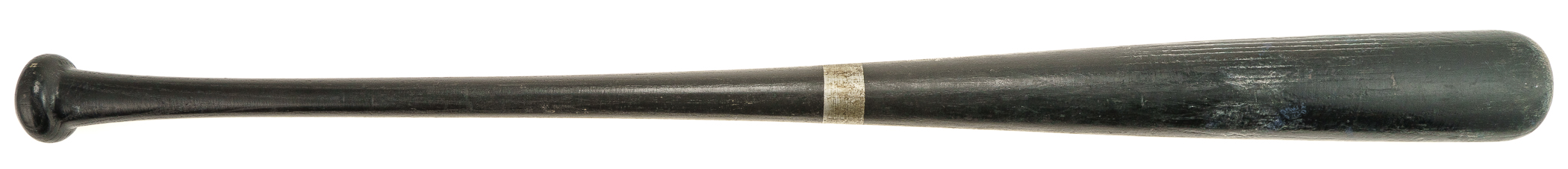 Bernie Williams Rawlings signature-model ("DW20") bat dating from the 2001 season. Graded GU 10 by PSA/DNA. The cupped-end bat, which is not cracked, displays evidence of outstanding use, including ball marks and ball stitch impressions (including blue ink transfers and white-leather scuffs). The model number ("DW20"), order number ("233"), and year ("01") are stamped on the knob. Williams has signed the barrel in "Bernie Williams/Game Used" in silver marker. Williams became the Yankees' everyday center fielder in 1993 and quickly established himself as one of the premier players at the position. In addition to helping lead the Yankees to four World Championships, Williams appeared in five All-Star Games and won four Gold Glove Awards. In 2015, the Yankees honored Williams by retiring his uniform number (No. 51) and dedicating a plaque to him in Monument Park. Length: 34.5 inches. Weight: 32.7 ounces. Full LOAs from PSA/DNA and Steiner Sports (corresponding stickers affixed to the handle and barrel). Auction LOA from James Spence/JSA. The size/weight of this item requires that there will be an additional shipping charge for this lot.