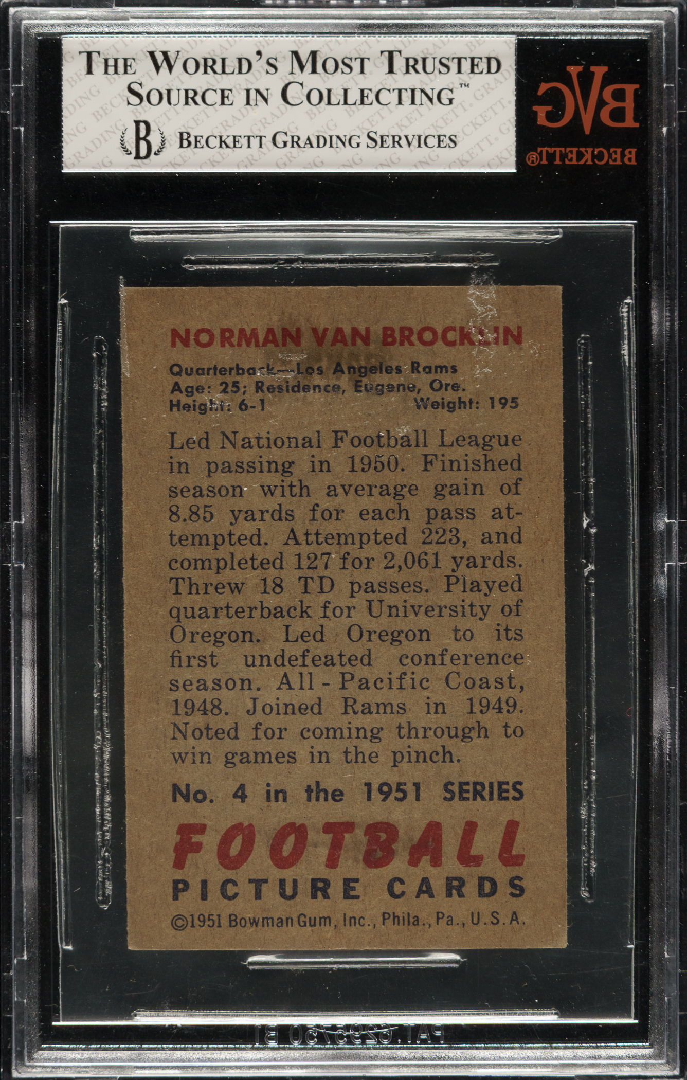 Graded NM 7 by BVG. Los Angeles Rams football Hall of Famer Norm Van Brocklin.