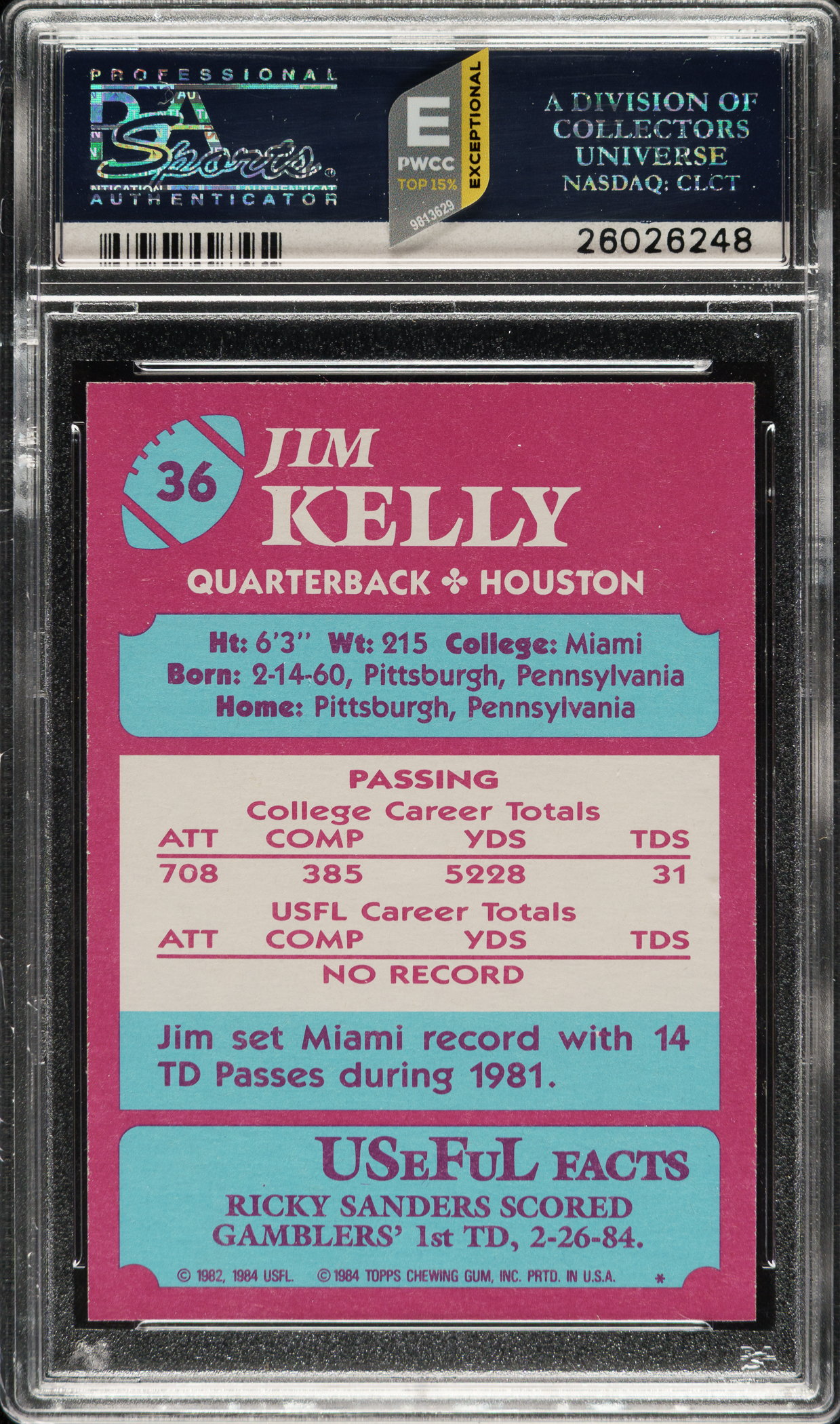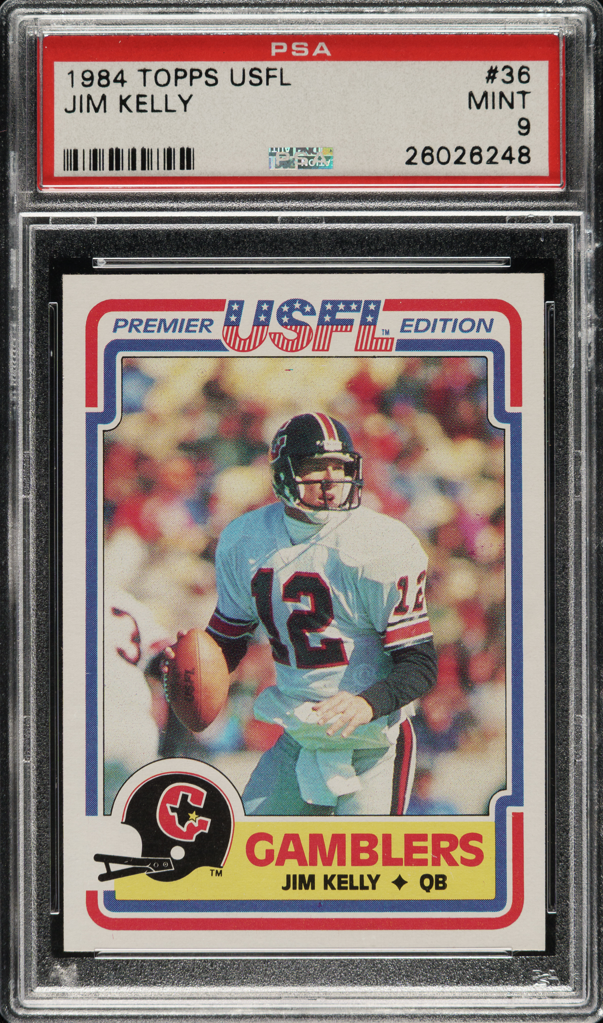 Graded MINT 9 by PSA. Houston Gamblers football Hall of Famer Jim Kelly.