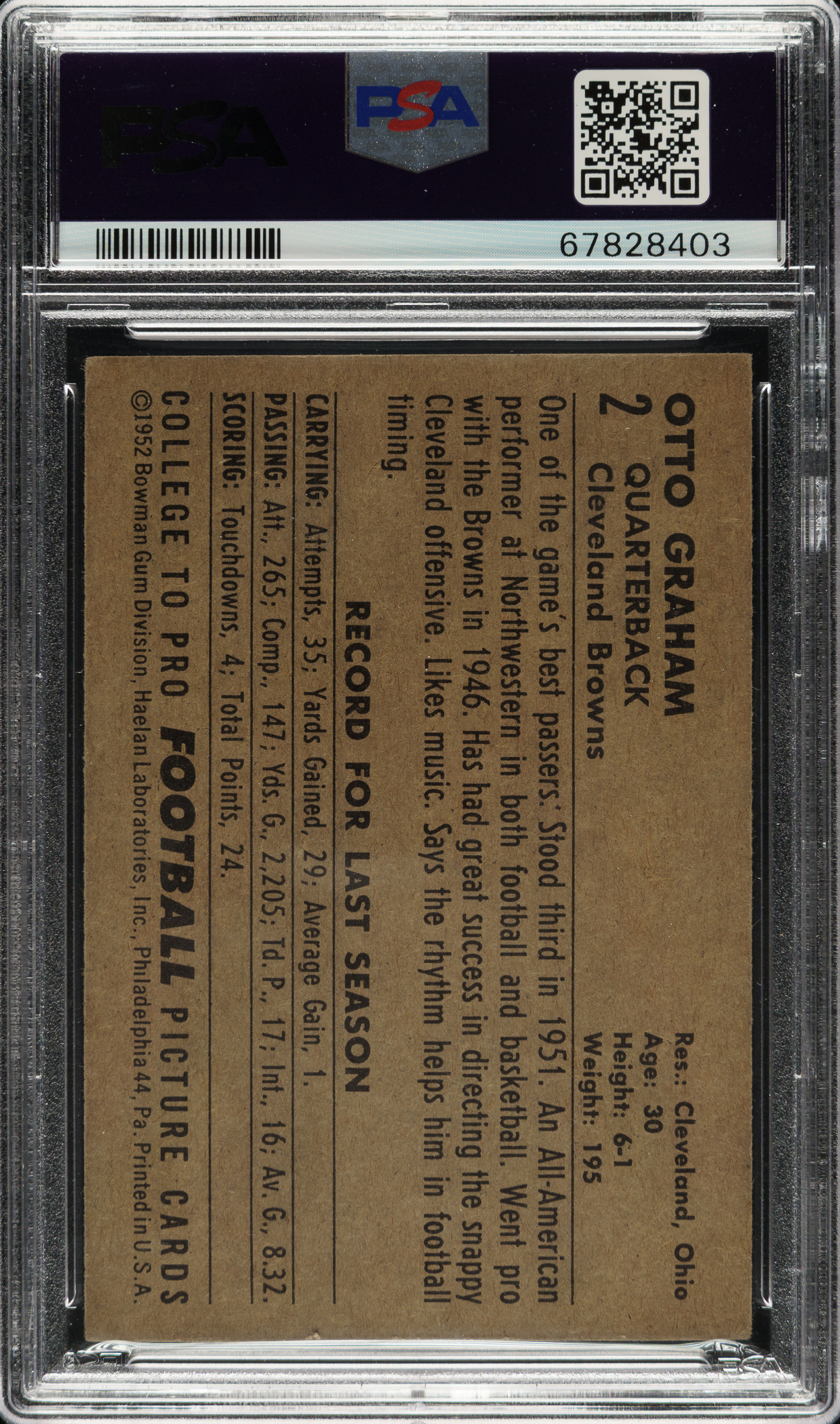 Graded VG-EX 4 by PSA. Cleveland Browns football Hall of Famer Otto Graham.