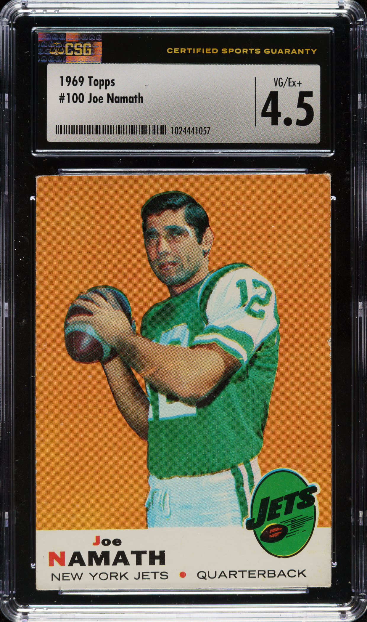 Graded VG/EX+ 4.5 by CSG. New York Jets football Hall of Famer Joe Namath.