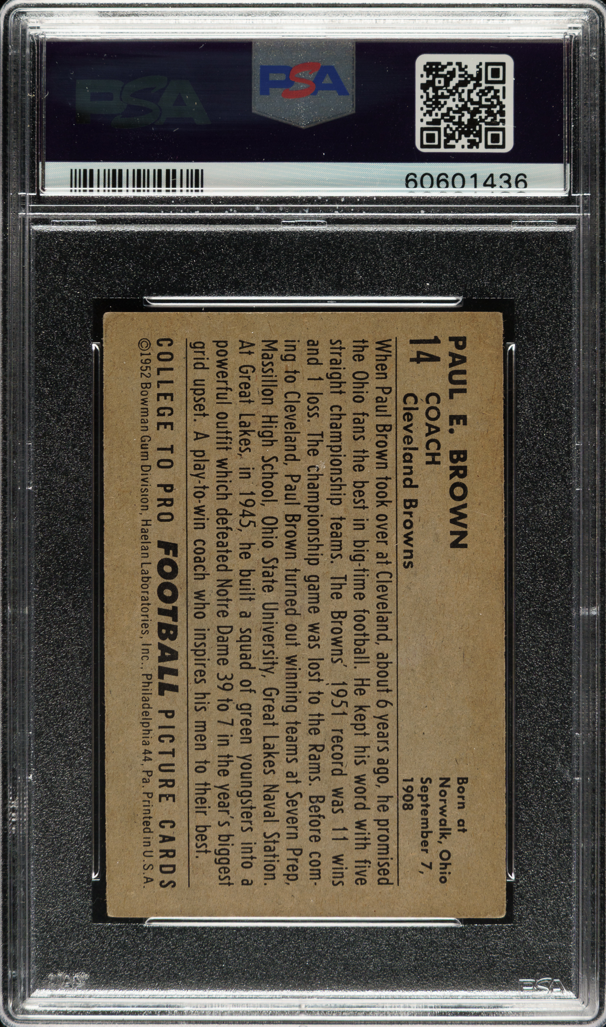Graded VG-EX 4 by PSA. Cleveland Browns Hall of Famer Paul Brown.